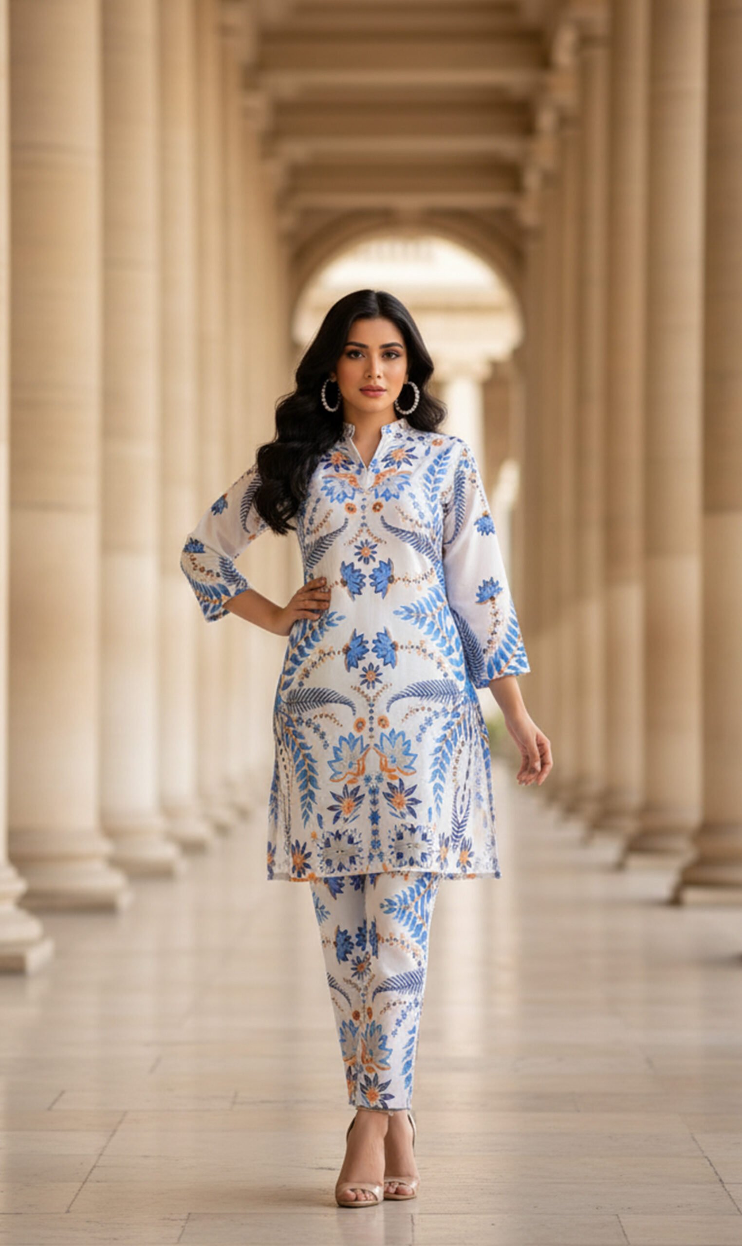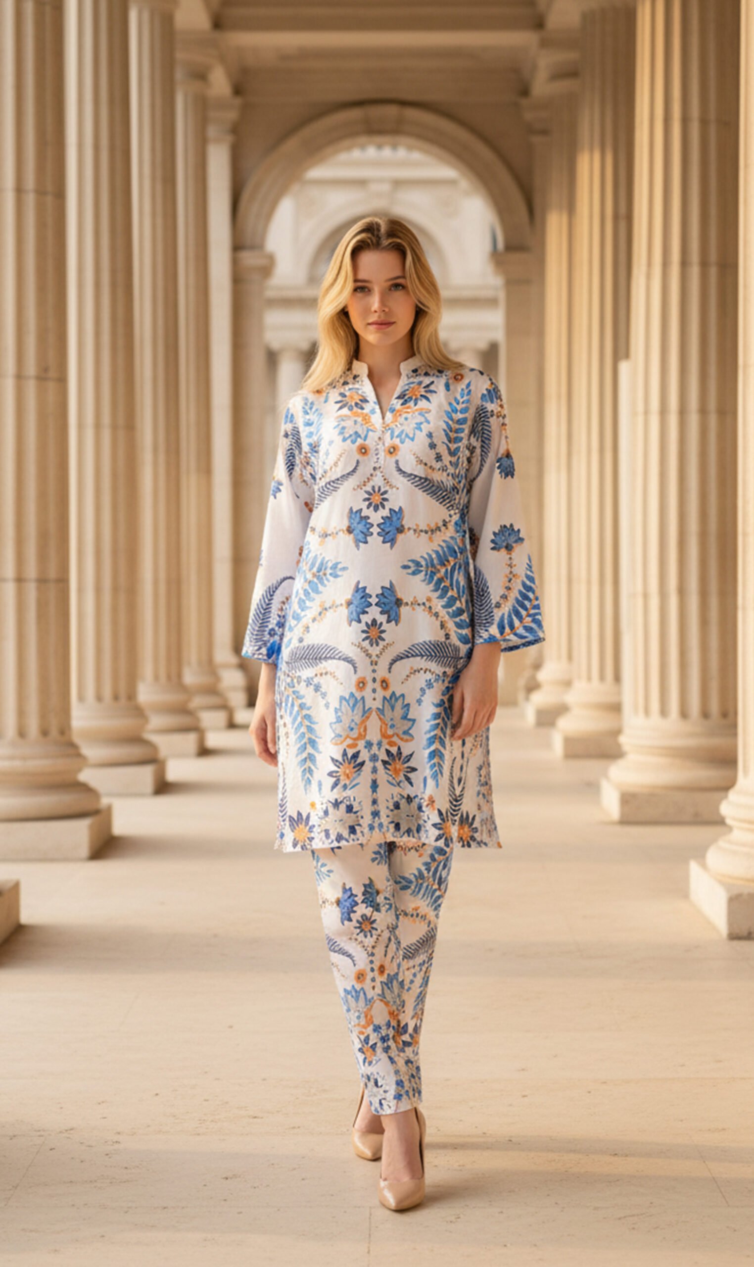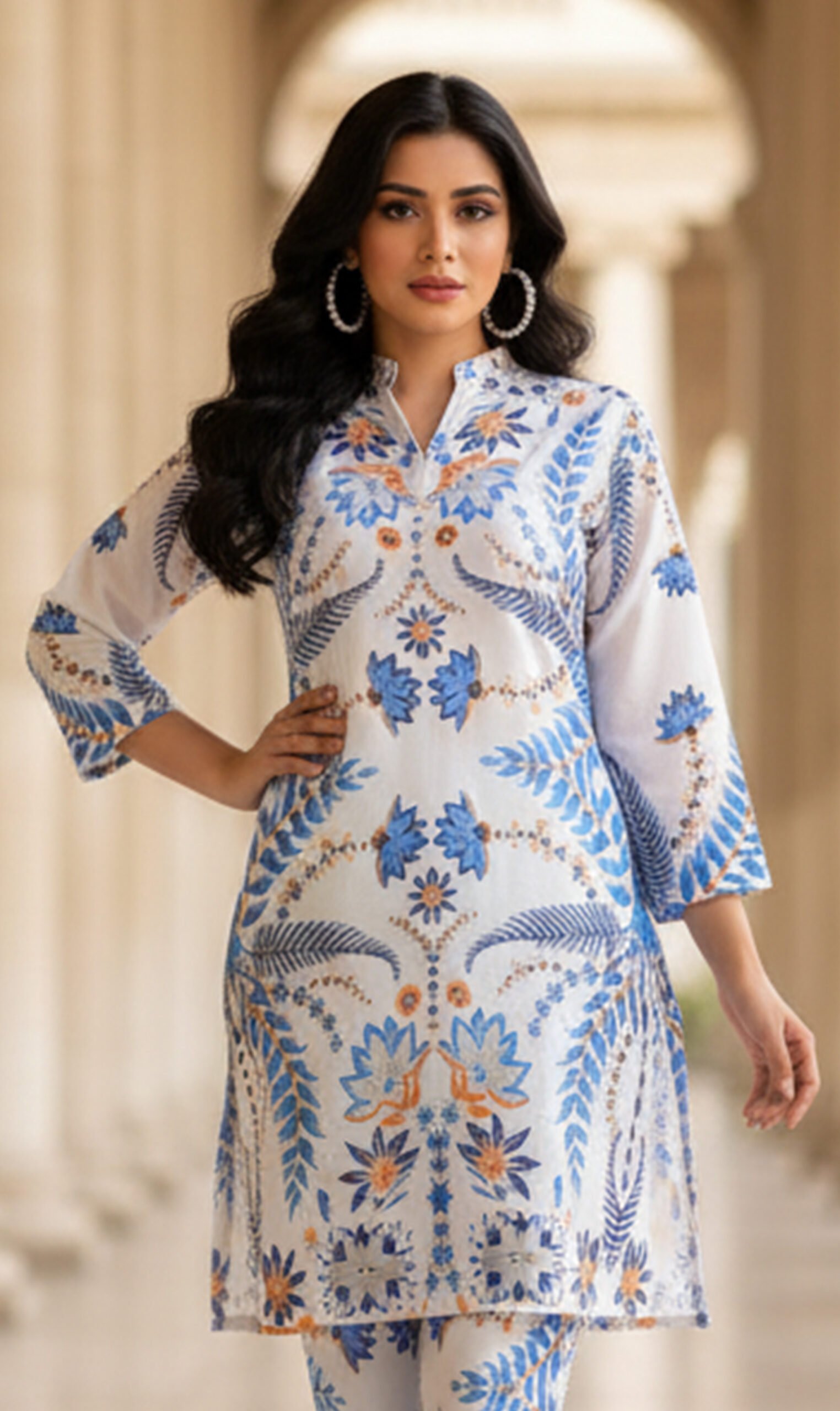 Dua Fashion Corner presents the Azure Bloom Silk — ek khubsurat, premium silk ensemble jo modern elegance aur relaxed comfort ko blend karta hai. Is outfit ka base off-white/ivory silk hai jisme vibrant cobalt-blue, soft sky-blue aur warm peach floral aur fern-inspired prints ka detailed pattern hai. Straight silhouette, slightly A-line kurta length aur tapered trousers combination se yeh outfit day events, brunches aur resort looks ke liye ideal hai. Lightweight silk fabric skin-friendly aur airy finish deta hai, jis se movement mein flow aur natural sheen nazar aati hai.