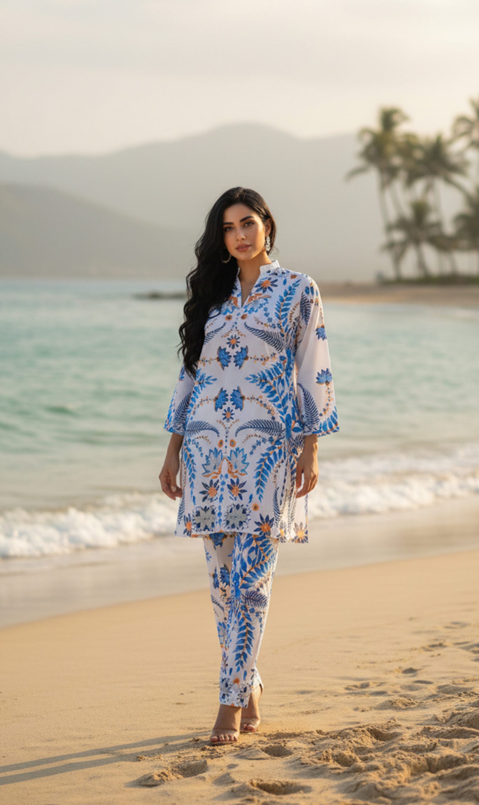 Finish & Details: Clean hem, printed border detailing at tunic edge and trouser cuffs; lightweight lining (if any) for coverage without bulk.