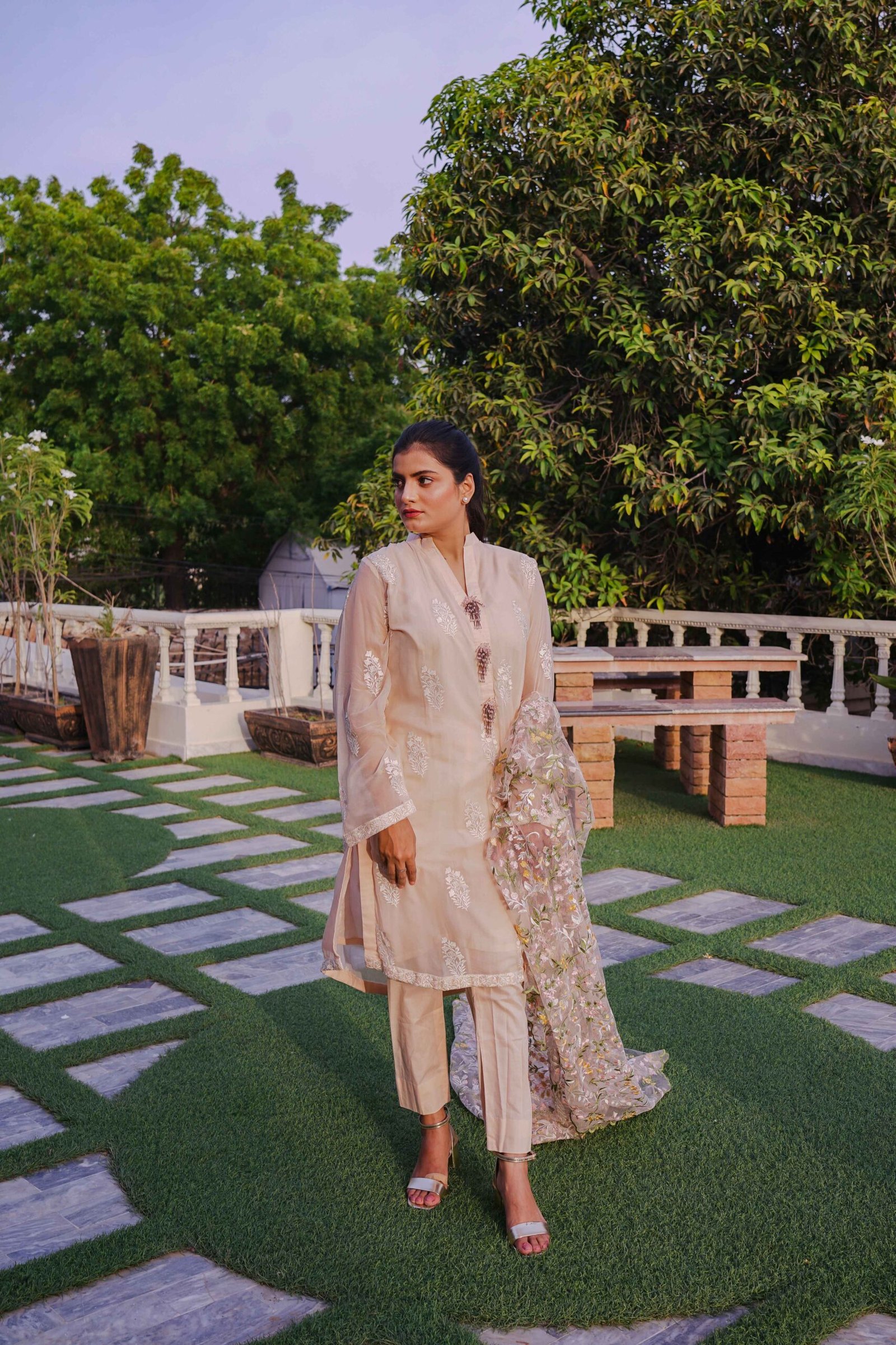 Baareeq is a celebration of minimal elegance. This soft beige 3-piece outfit from Dua Fashion Corner is crafted on a breezy organza-style fabric with subtle off-white thread embroidery placed beautifully across the shirt and sleeves. The design is completed with a matching trouser that carries a clean, tailored finish and an ethereal embroidered organza dupatta with floral thread and sequins — adding just the right sparkle.