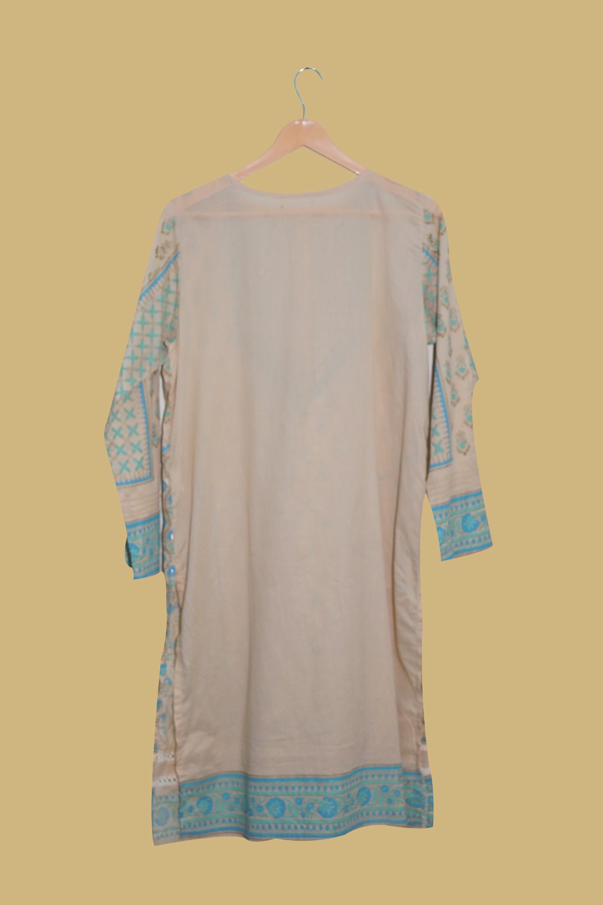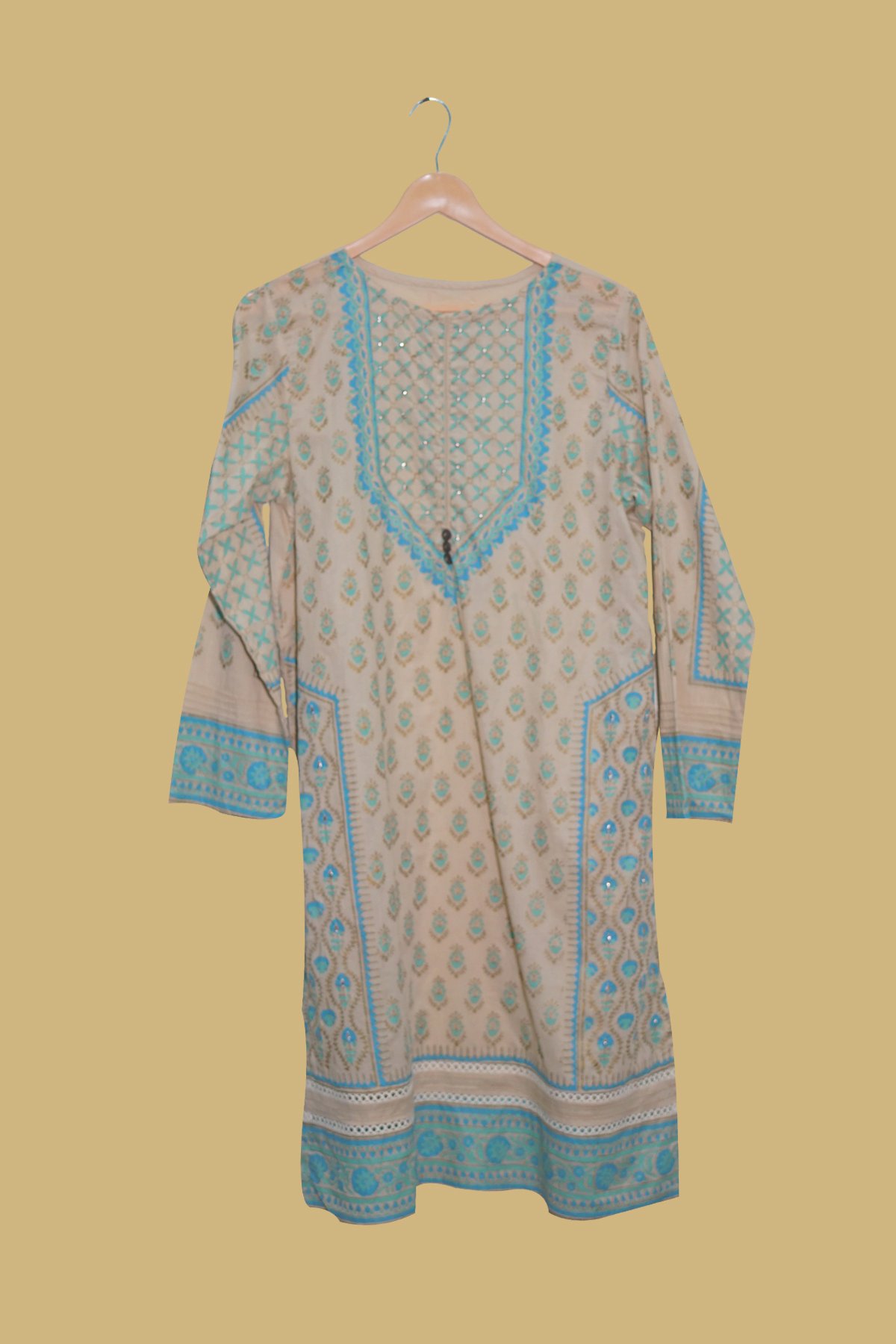 Add a splash of elegance to your wardrobe with this beautifully crafted beige kurti, adorned with subtle floral prints, turquoise embroidery, and mirror work that reflects the light oh-so-gorgeously. The front panel features a geometric embroidered pattern with tiny mirrors that add a graceful sparkle to the design.