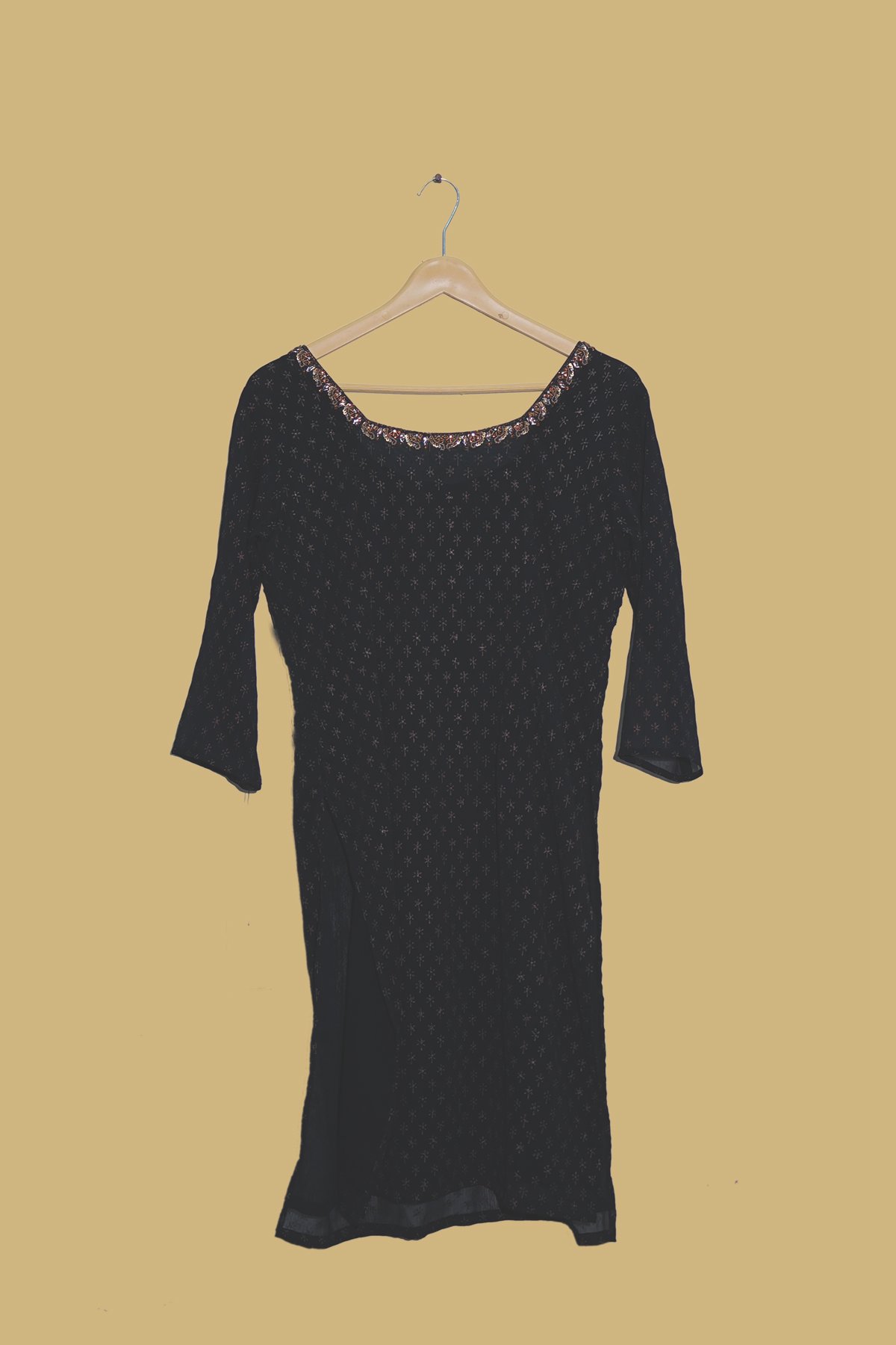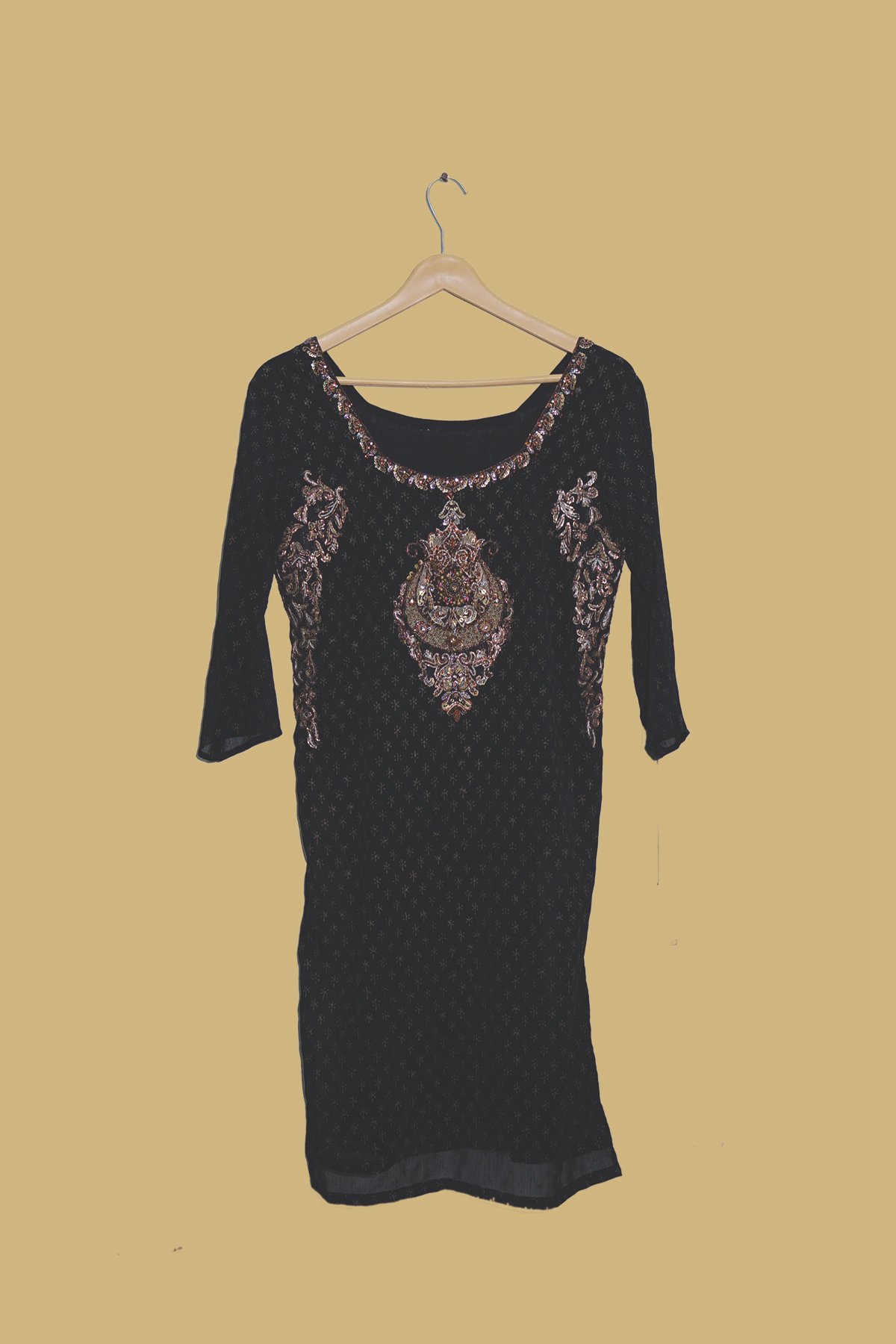 Elegant black kurti with detailed embroidery and mirror work – a refined choice for festive and formal wear.