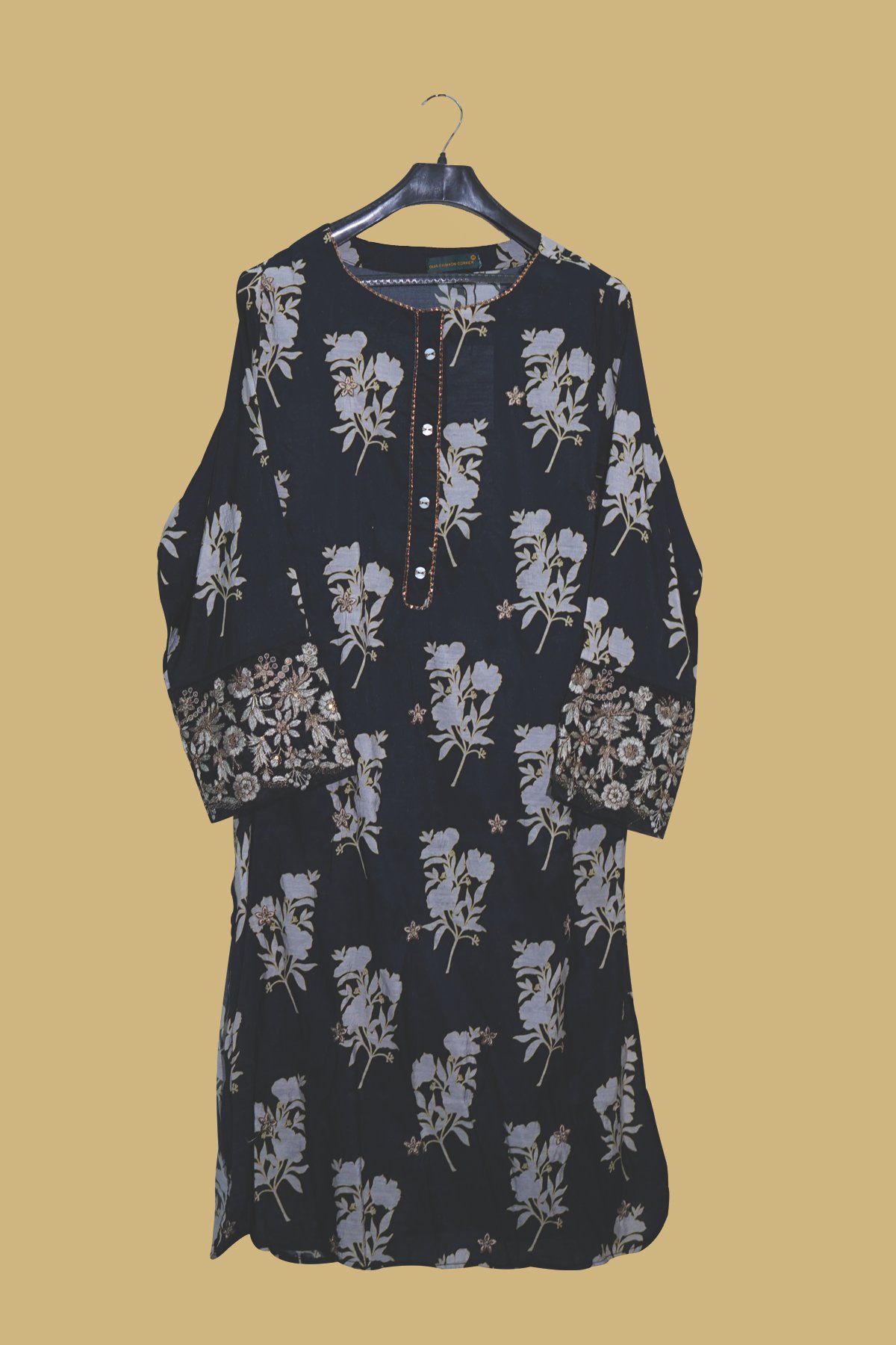 Bring timeless charm to your wardrobe with this graceful black kurti featuring soft floral prints and richly embroidered sleeves. The subtle pastel flower motifs create a sophisticated contrast against the black base, while the intricate thread and sequin work on the sleeves makes it ideal for special occasions too.
