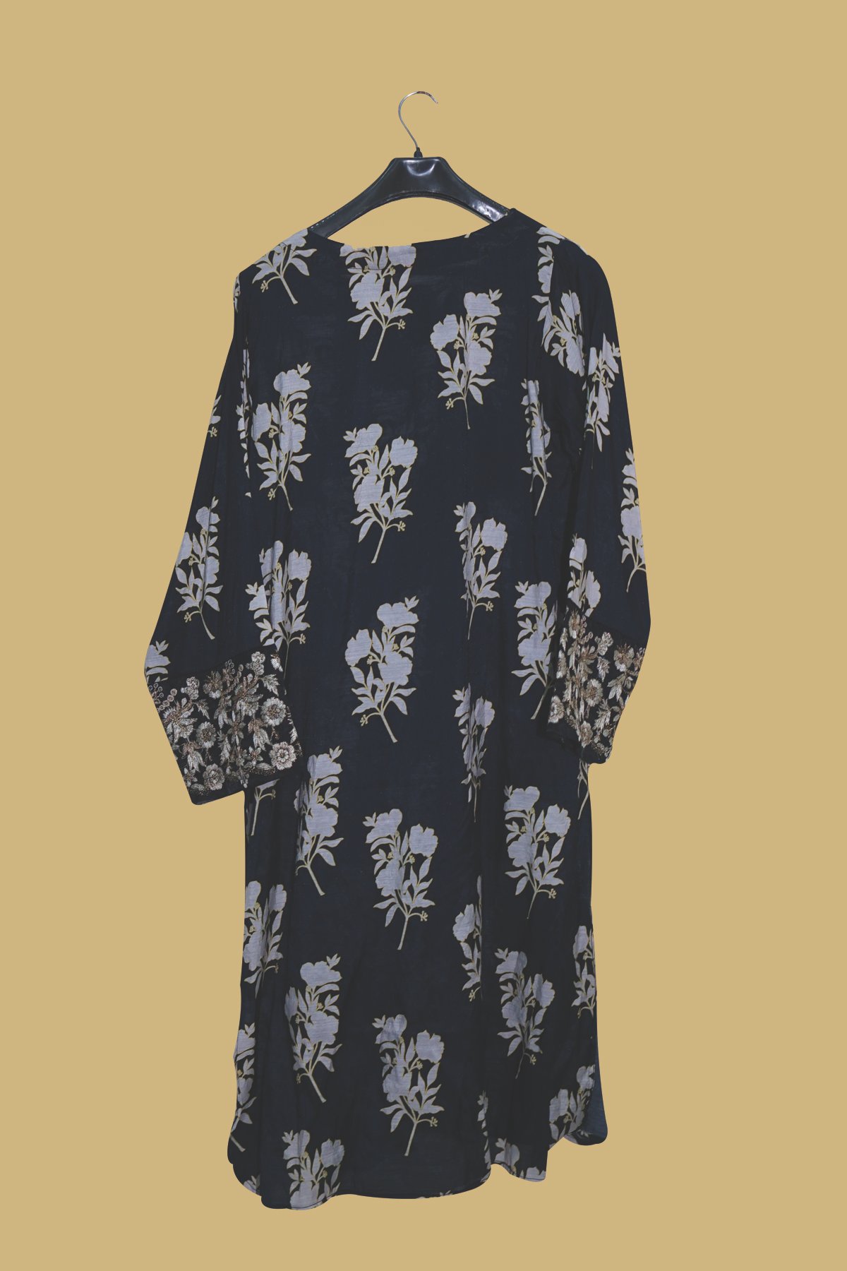 Design: All-over floral print with detailed embroidery on cuffs