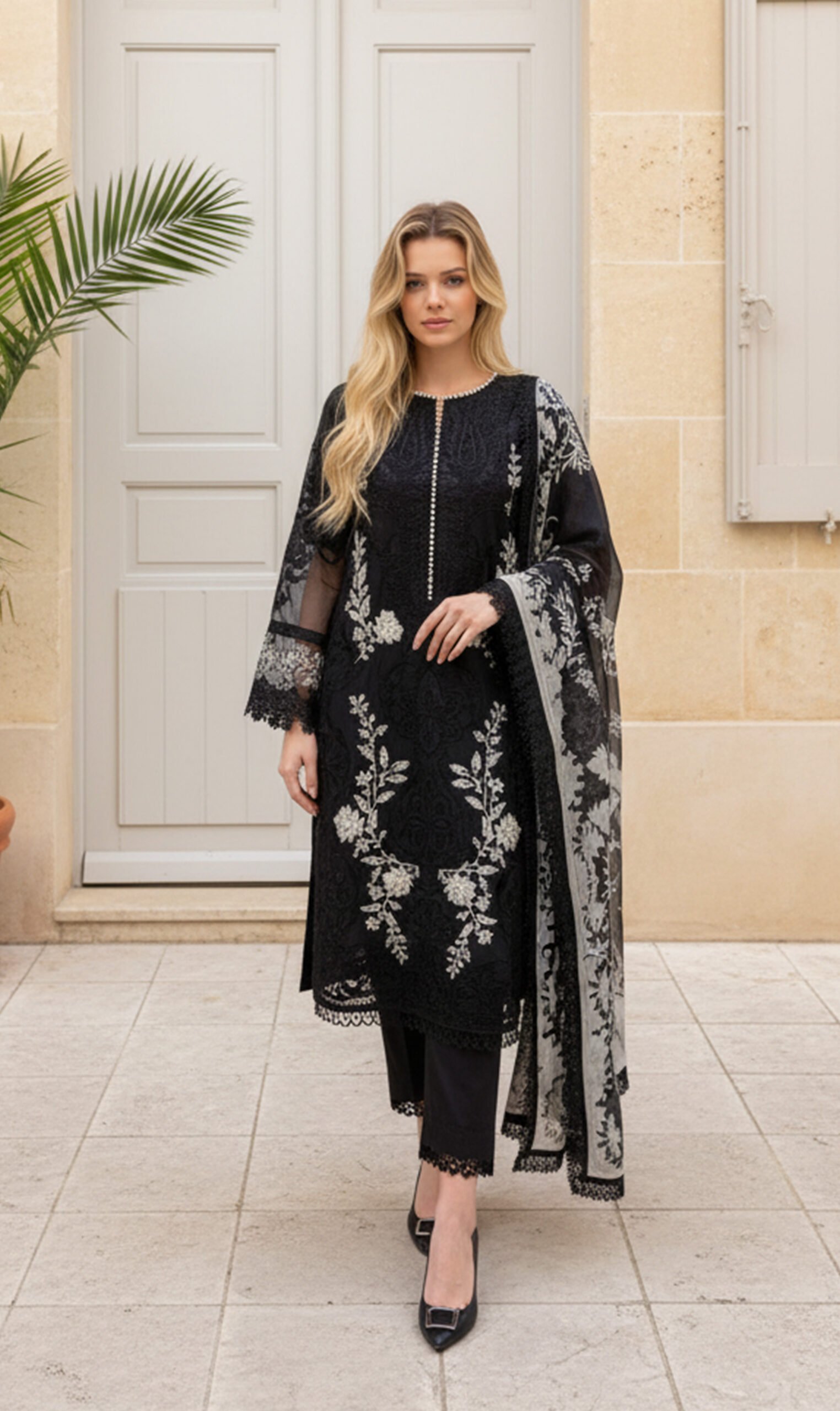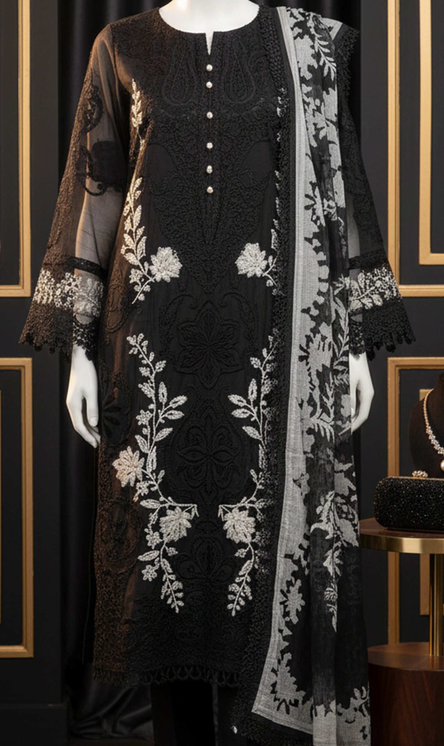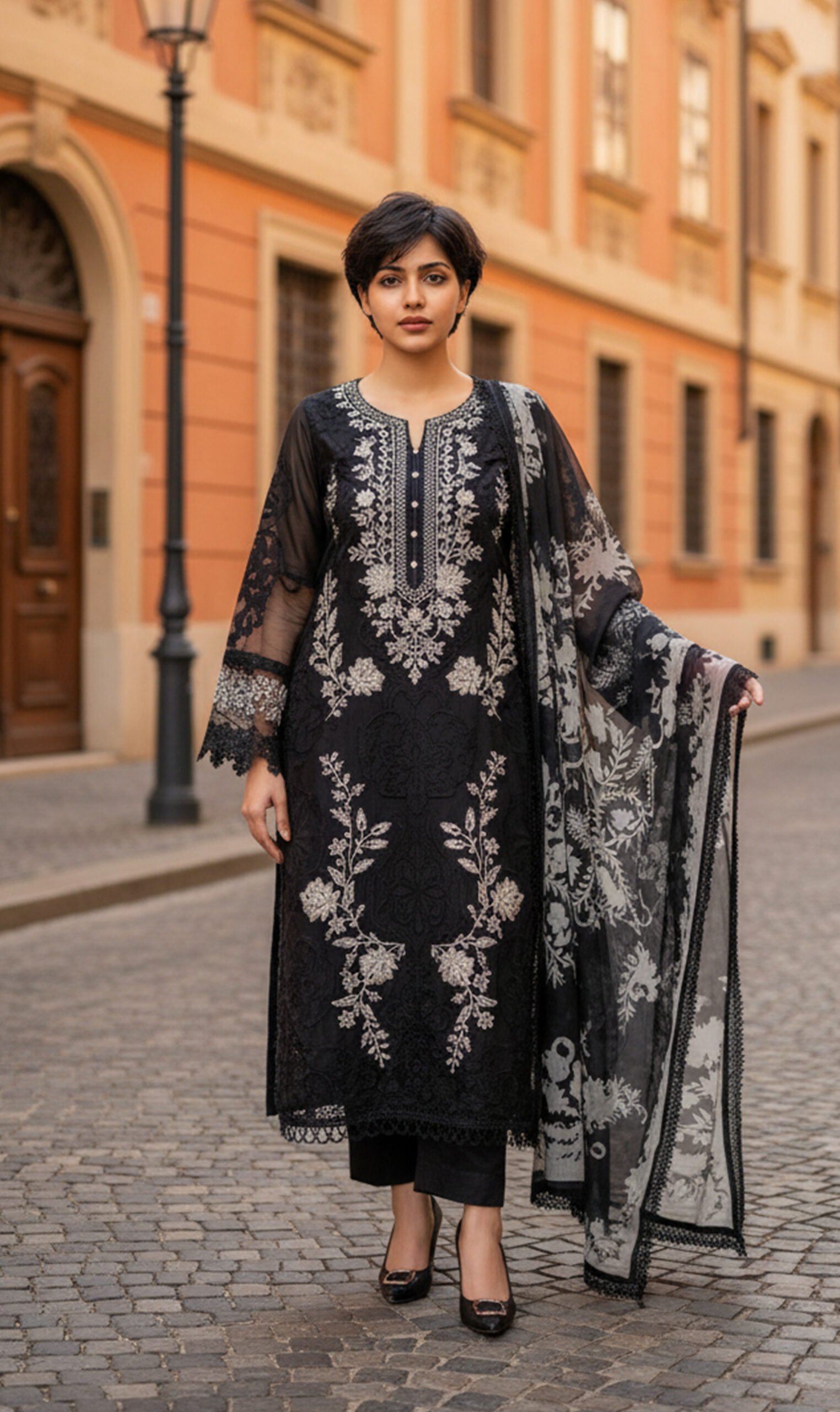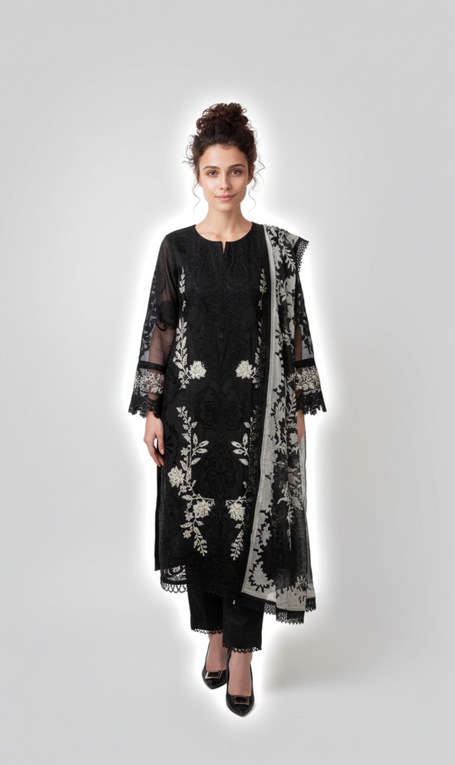 Embrace sophistication in this stunning black outfit from Dua Fashion Corner, elegantly detailed with ivory-toned floral embroidery. The ensemble features a richly embroidered shirt, sheer organza sleeves with intricate lace borders, a matching trouser, and a beautifully printed dupatta that adds an extra layer of grace and depth.
