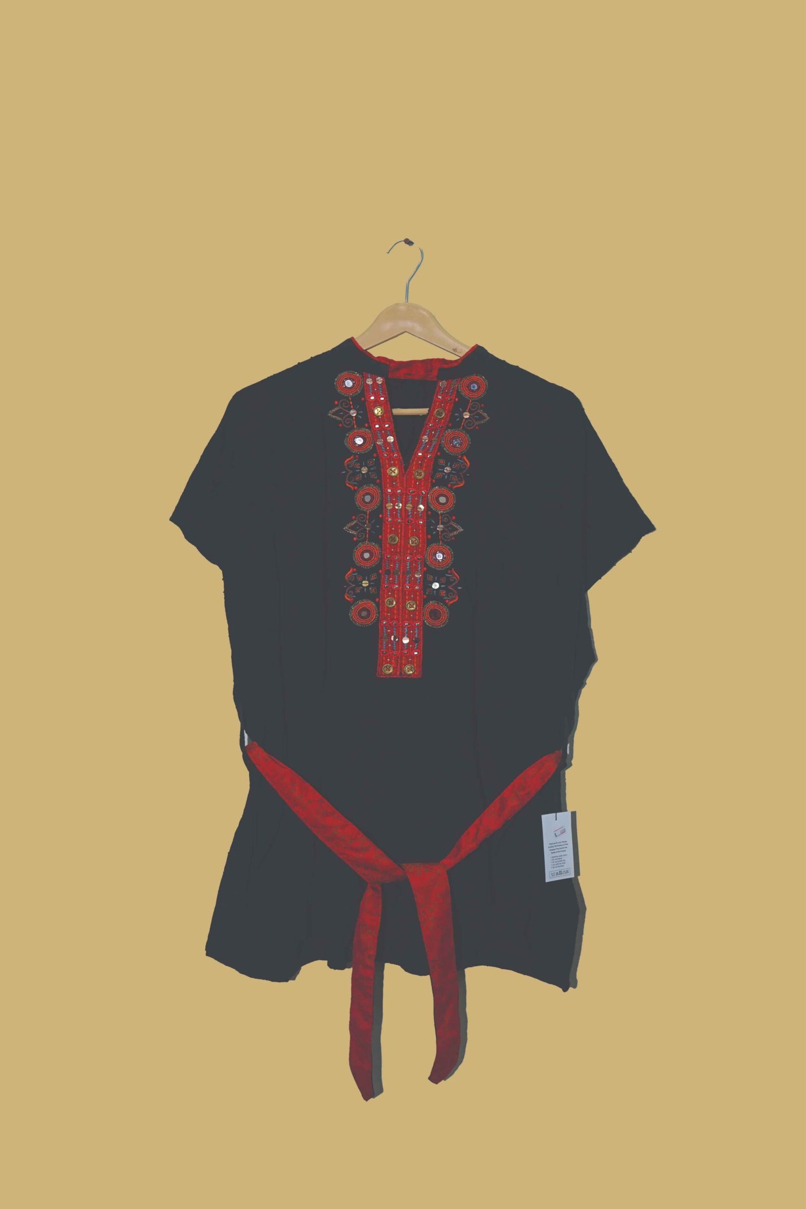 The Black Mirror Work Short Kurti features stunning mirror work combined with fine red thread embroidery across the neckline and front panel. The reflective mirror embellishments shimmer beautifully under light, giving it a festive sparkle without being too flashy. The short sleeves and V-cut neckline bring a flattering, feminine shape that’s both elegant and versatile. The back tie-belt adds a unique touch, allowing you to adjust the fit according to your comfort.