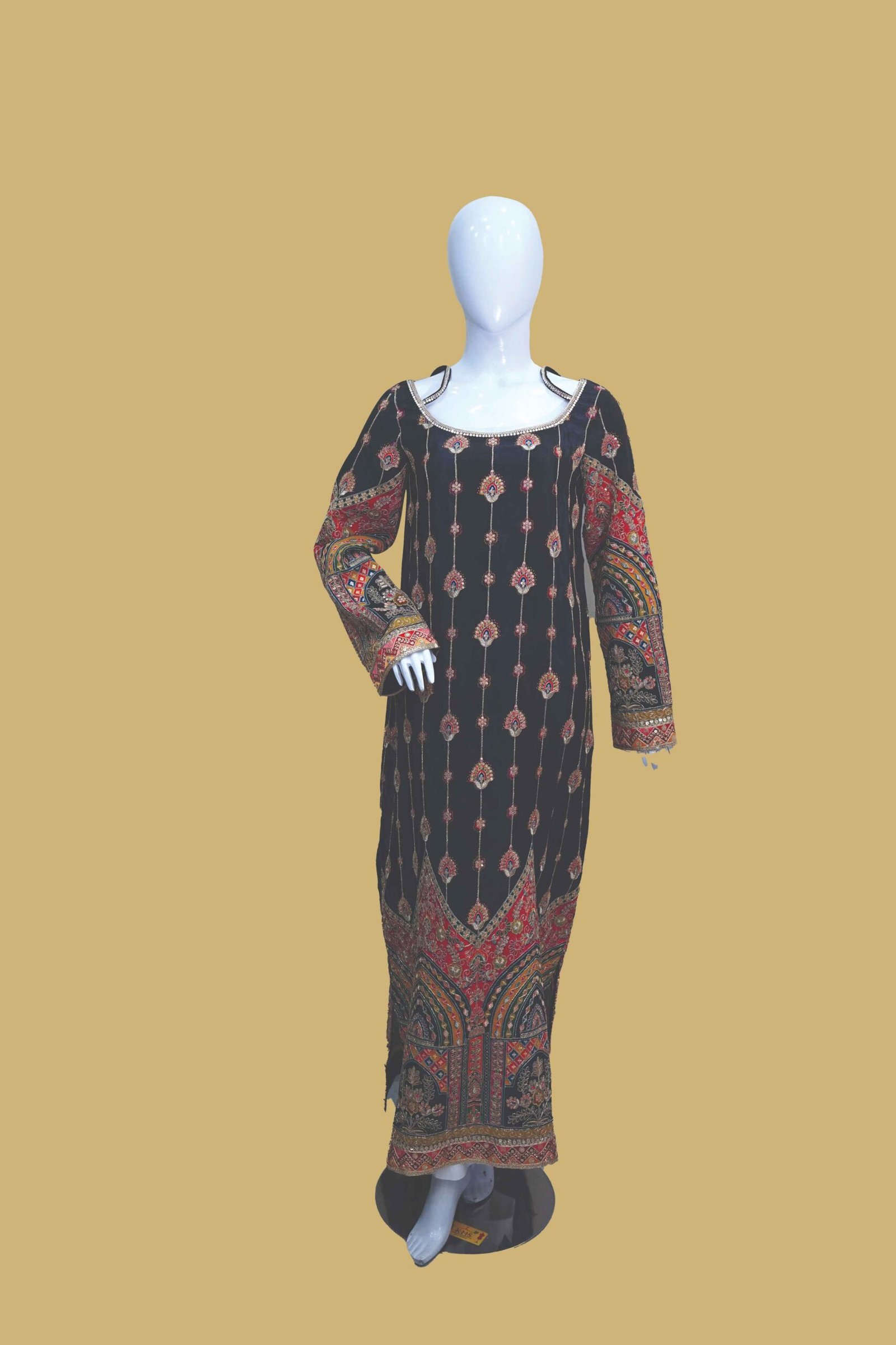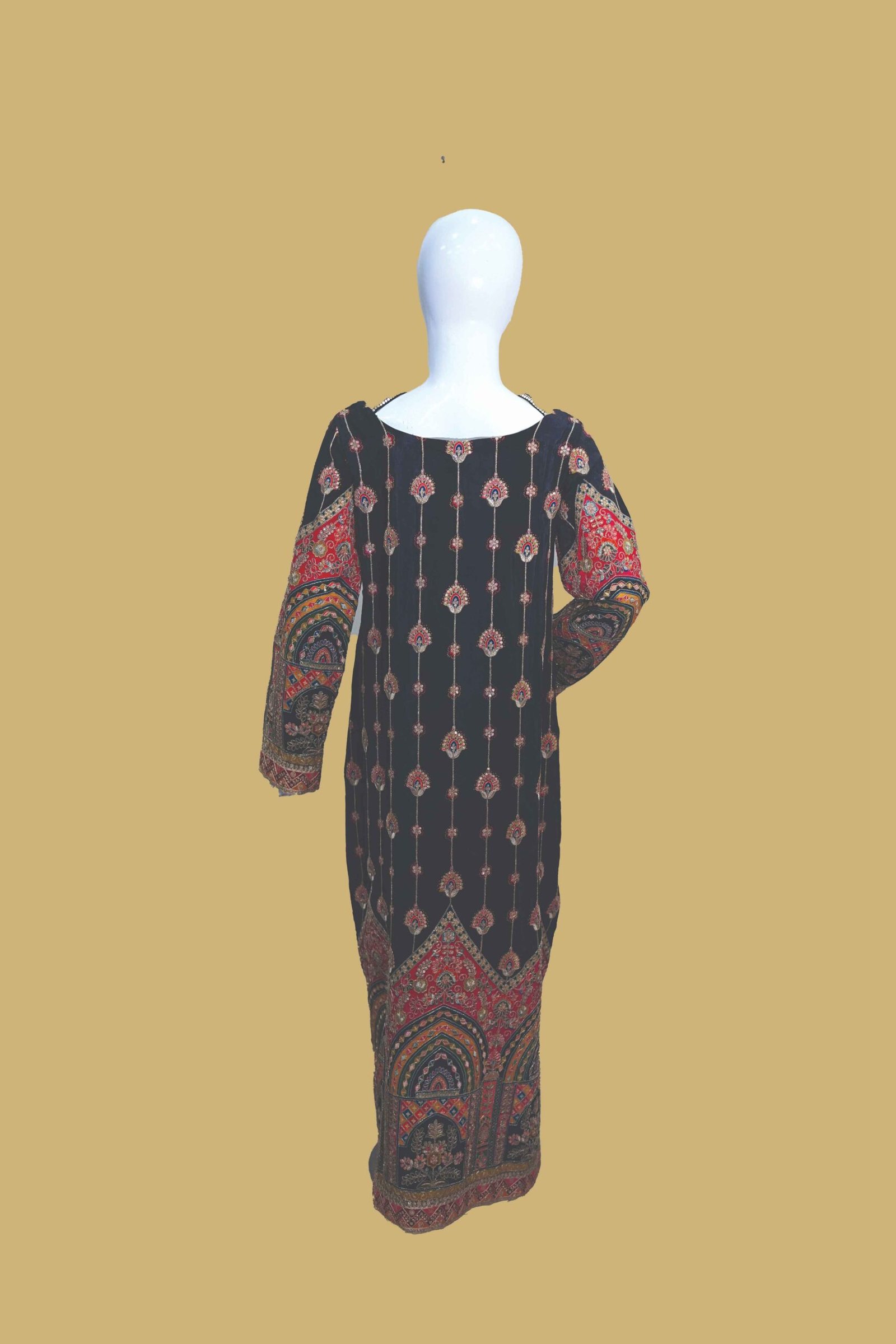 The bottom panel is a true showstopper — grand arch-inspired border with intricate floral and architectural elements in deep reds, ochres, and sapphire tones. The full sleeves carry forward this luxurious theme with bold printed cuffs and detailed paneling, lending the outfit a complete, rich finish.