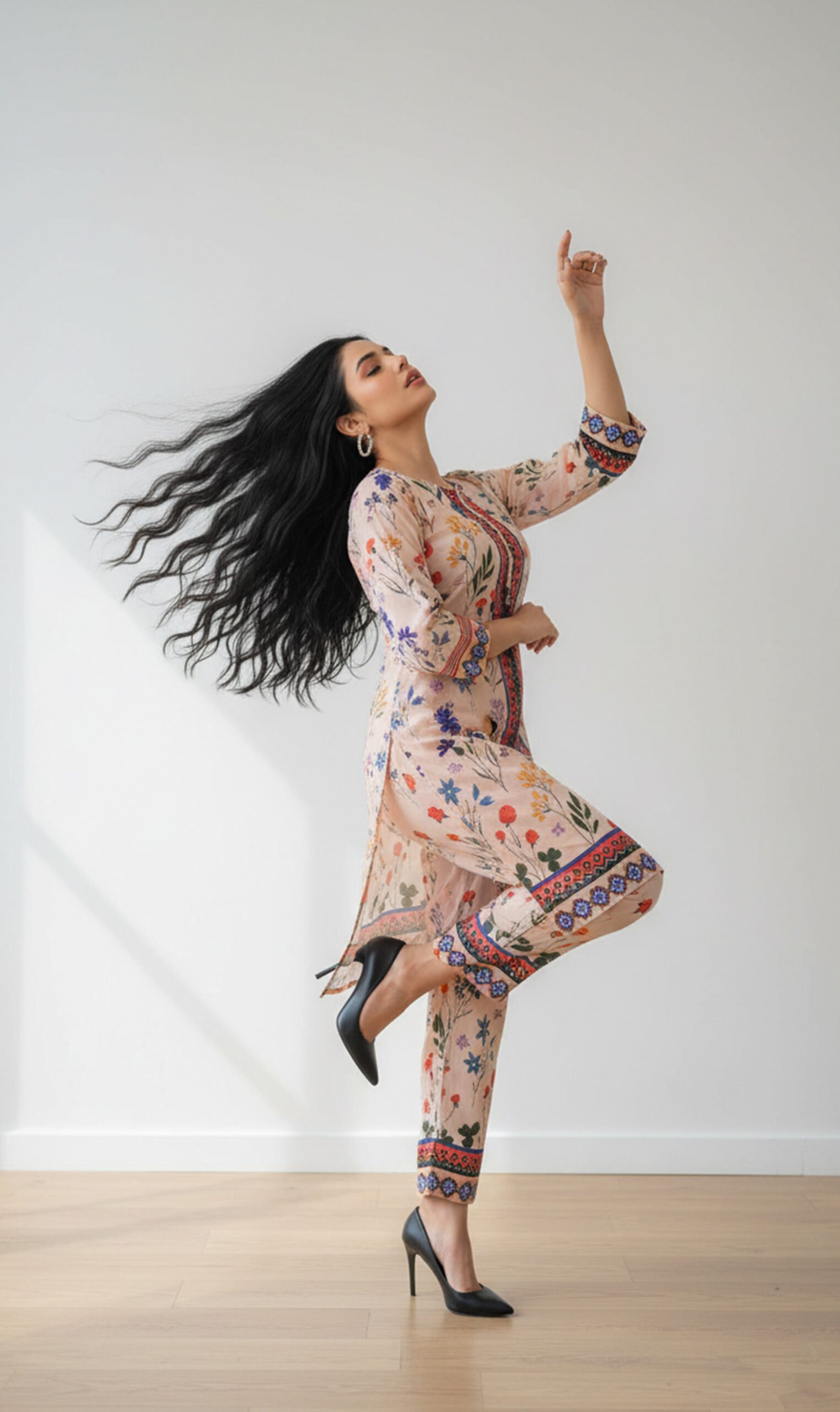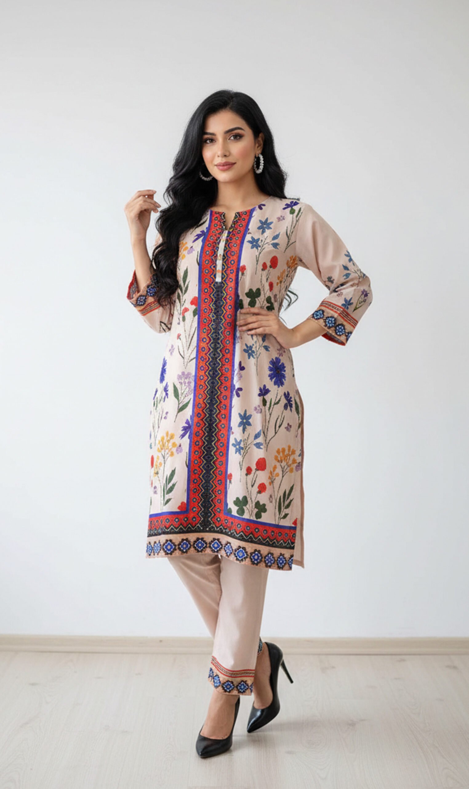 Unveil timeless charm with Blossom Heritage — a graceful printed outfit by Dua Fashion Corner, designed for women who adore elegance in simplicity. The dress features a soft beige silk base enriched with vibrant floral prints and intricate ethnic-inspired border detailing, creating a perfect harmony of color and tradition.