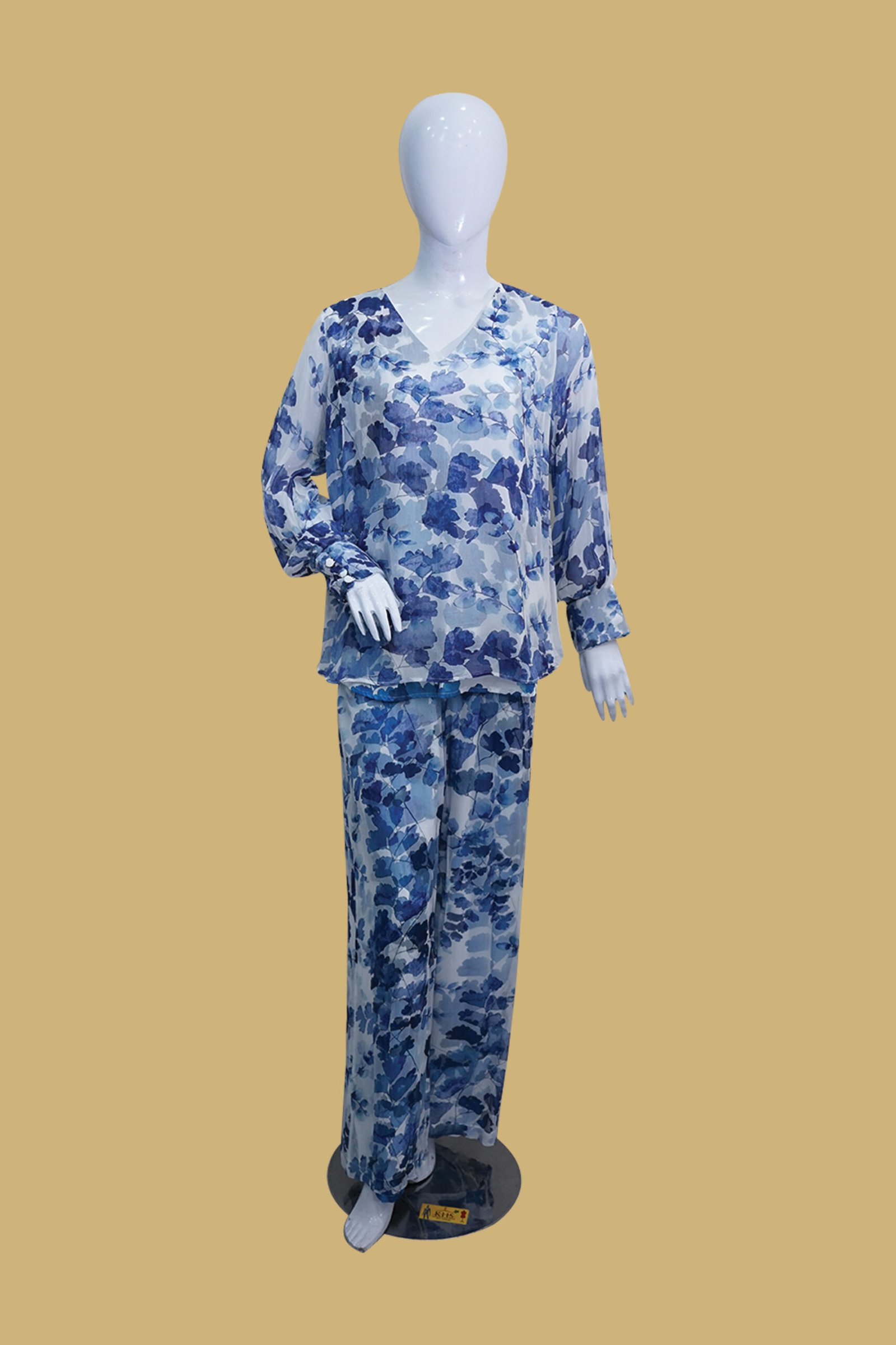 The shirt comes with a V-neckline, loose-fit cut, and full sleeves with buttoned cuffs, giving it a relaxed yet chic look. The flowy chiffon fabric adds a graceful drape that flatters all body types. Paired with wide-leg trousers in matching floral print, this outfit gives a coordinated and modern appearance that blends comfort with style.
