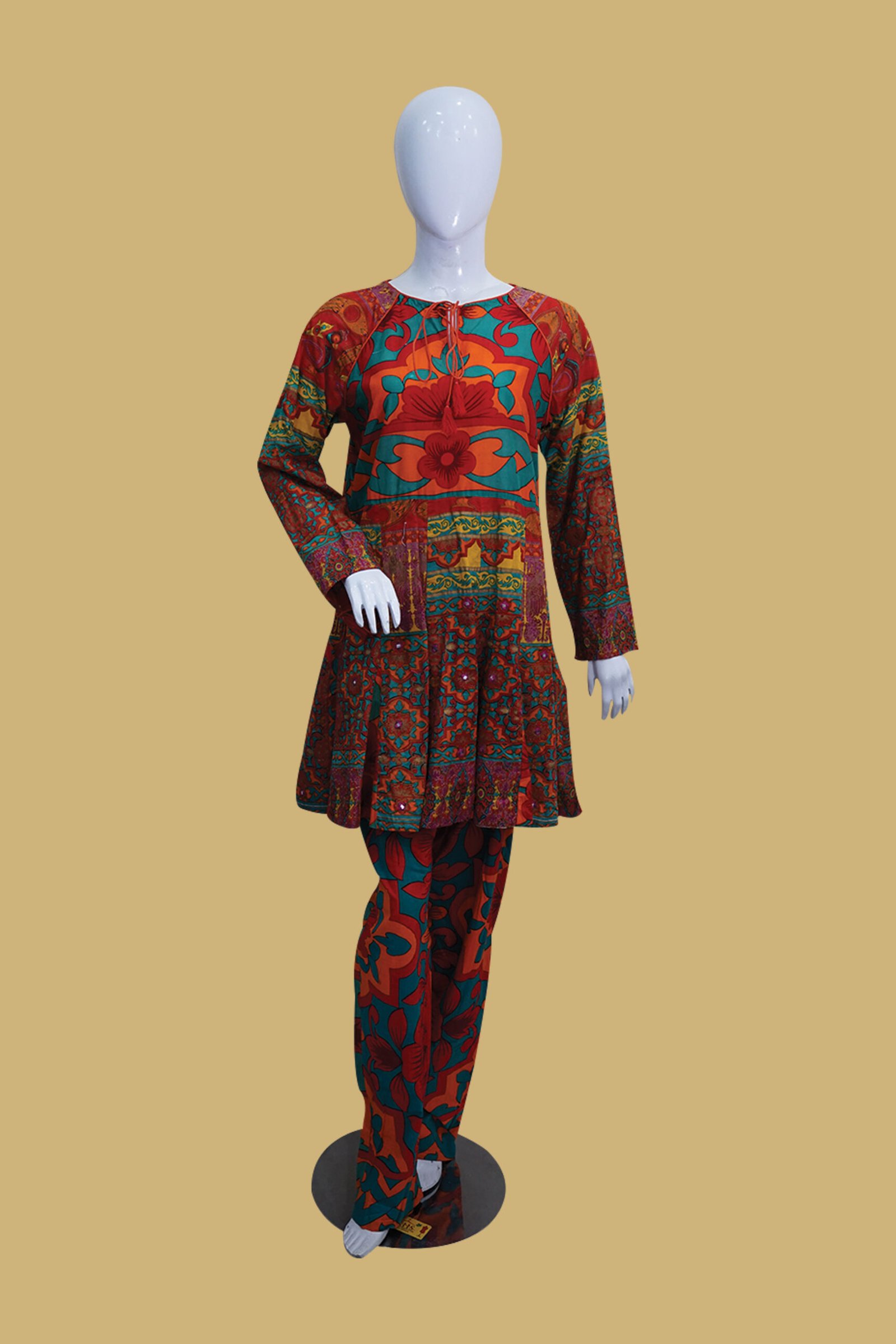 Crafted from soft, breathable cotton blend fabric, this set keeps you cool and comfortable all day long. The intricate floral and ethnic motifs are digitally printed in rich tones of red, teal, mustard, and maroon, making the outfit eye-catching from every angle. The tunic features a flared cut that gives it a frock-style appearance, enhanced with a round neckline and subtle pleats for added movement.