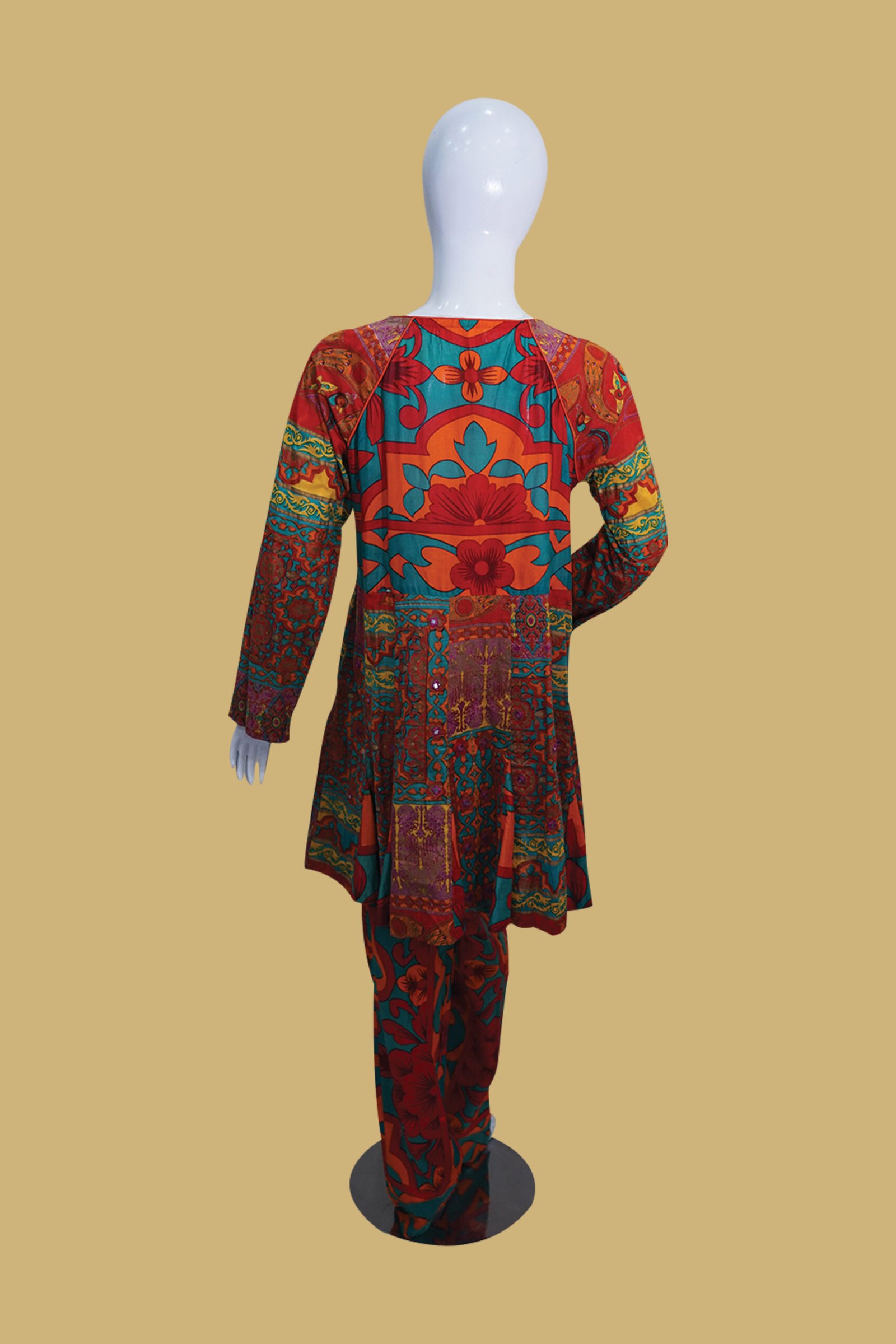 Add a splash of vibrant charm to your wardrobe with this stunning multicolor printed tunic set from Dua Fashion Corner. Inspired by bohemian patterns and rich traditional art, this outfit is a bold expression of style and comfort. The flowy tunic paired with wide-legged trousers creates a striking silhouette that’s perfect for casual gatherings, cultural events, or festive day-outs.