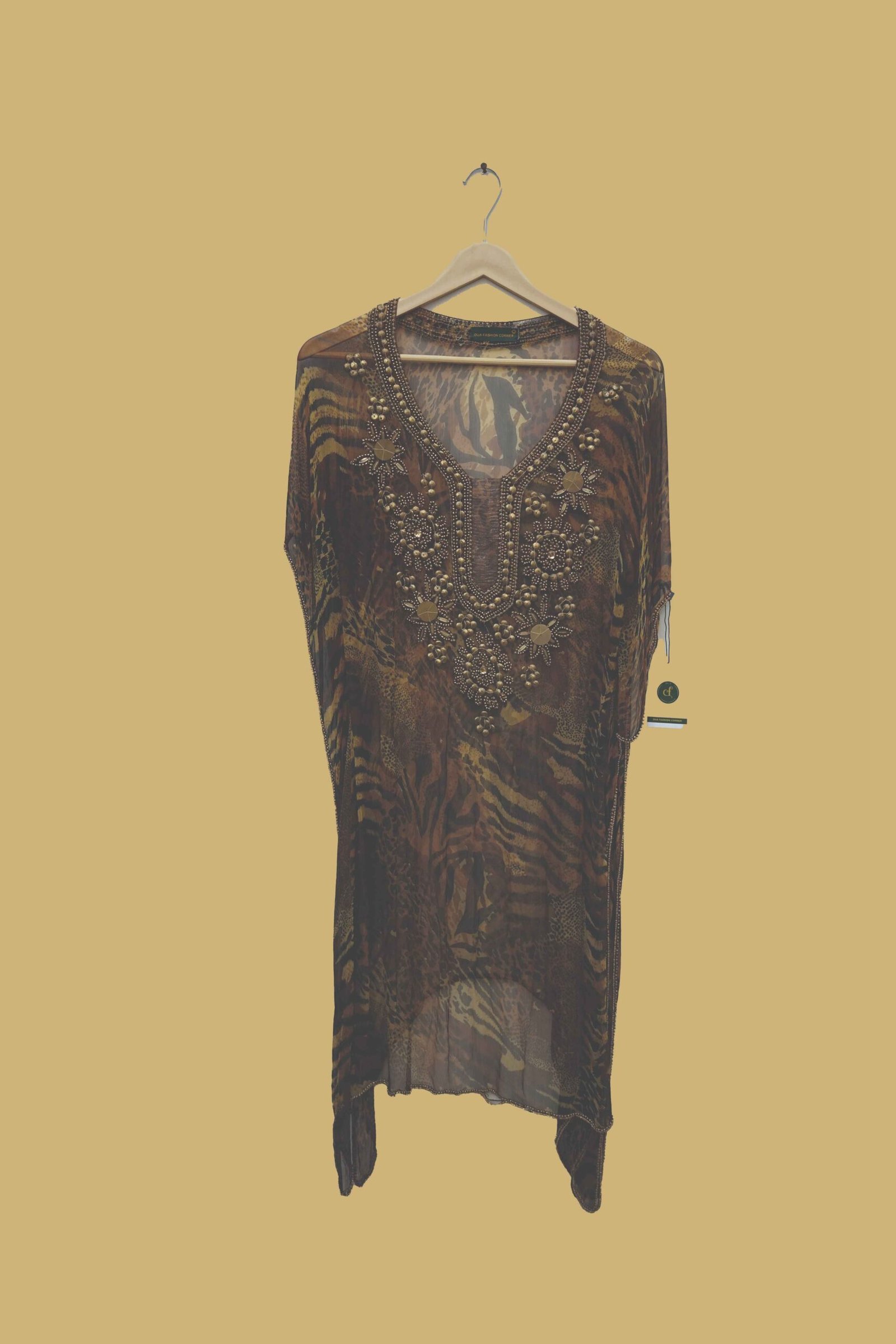 Introducing Dua Fashion Corner’s Brown Animal Print Embellished Kaftan, a masterpiece that blends exotic beauty with timeless sophistication. Designed for women who adore statement styles without compromising comfort, this kaftan combines the charm of wild animal prints with the grace of hand embroidery — making it a must-have for festive occasions and glamorous evenings.