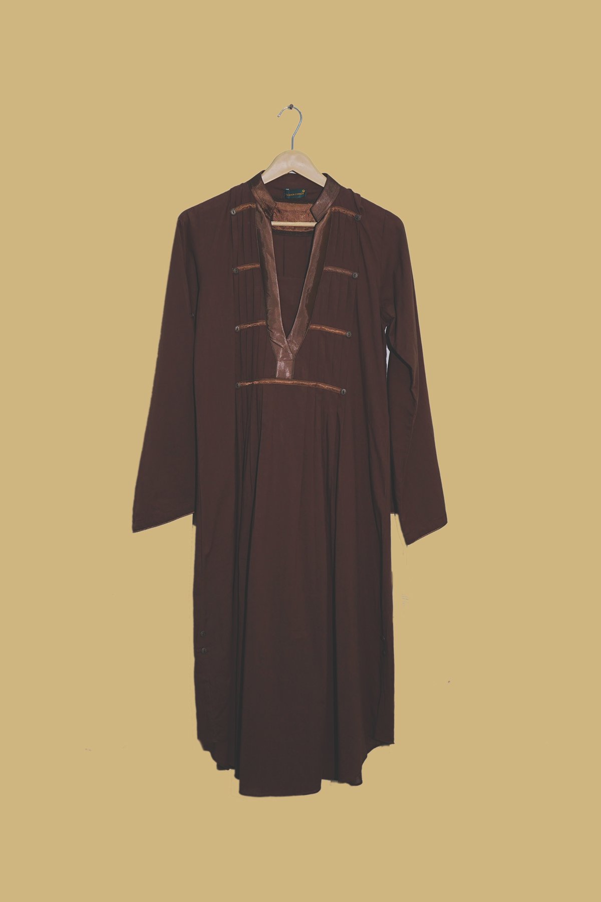 A deep chocolate brown kurti with faux leather detailing and chic button accents — perfect for a graceful yet bold statement.