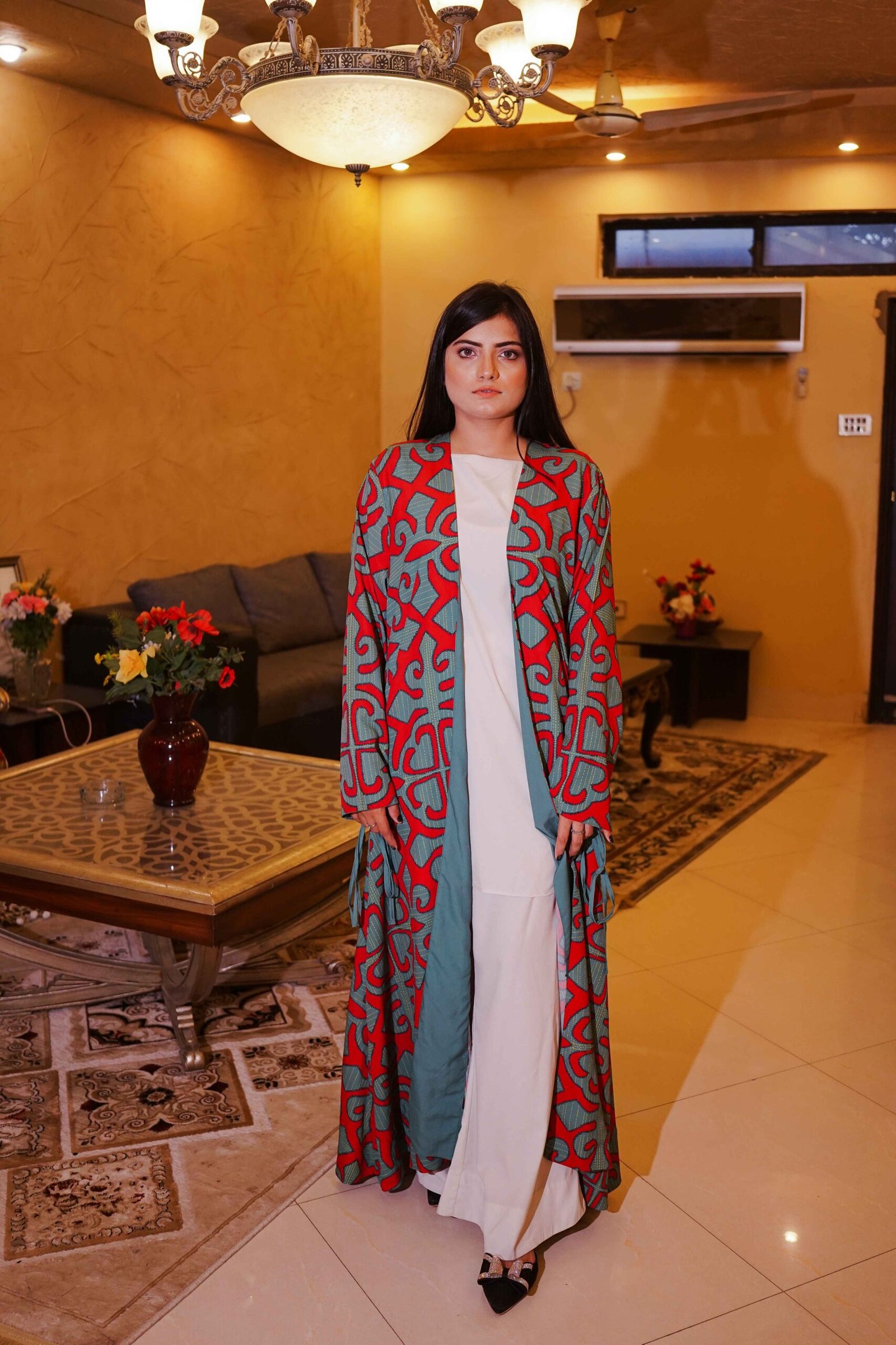 This outfit features a long printed coat in a teal green base with striking red abstract and heart-inspired motifs throughout. The design brings a perfect balance between ethnic patterns and contemporary cuts, making it an ideal pick for casual outings, art events, or day-to-evening wear.