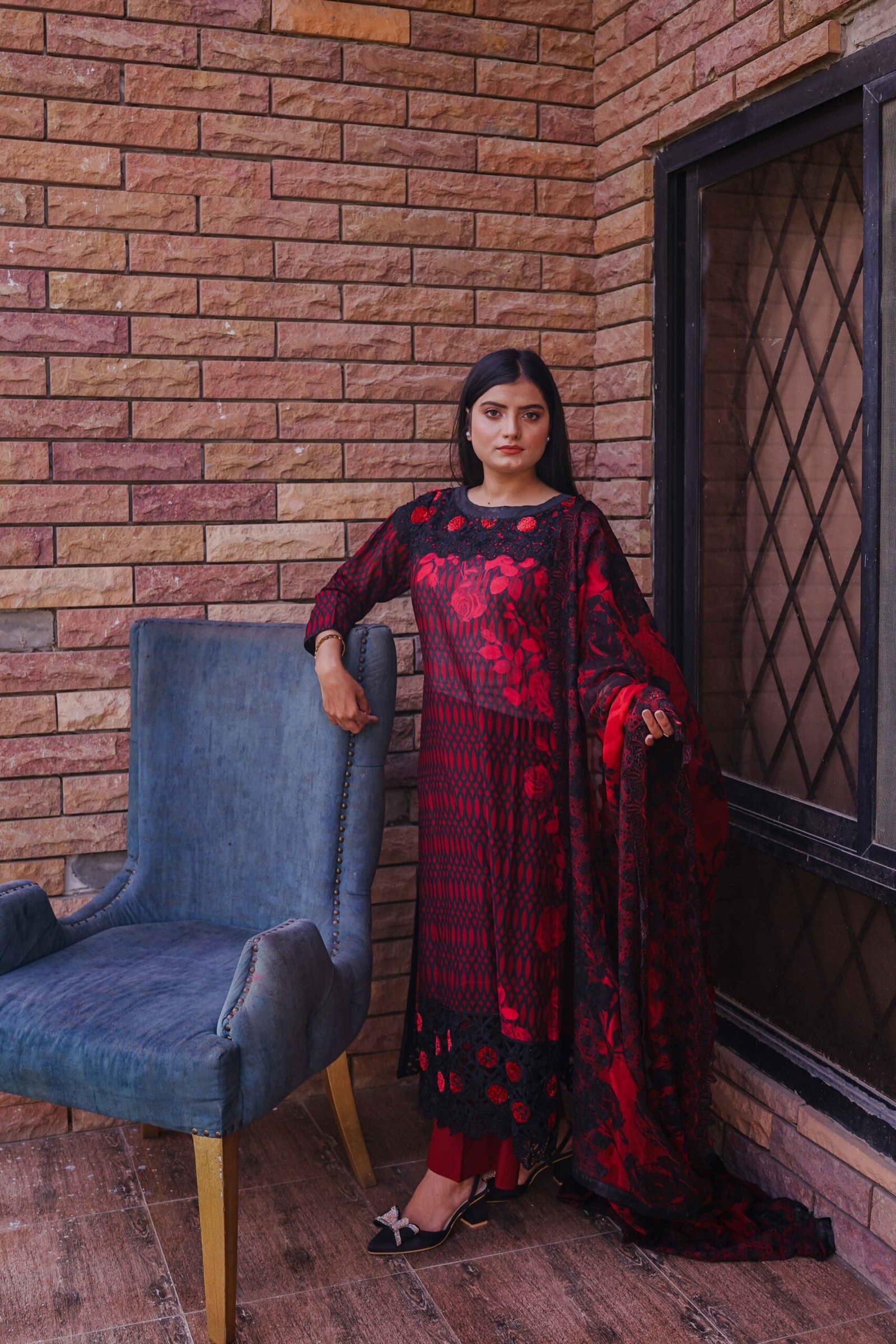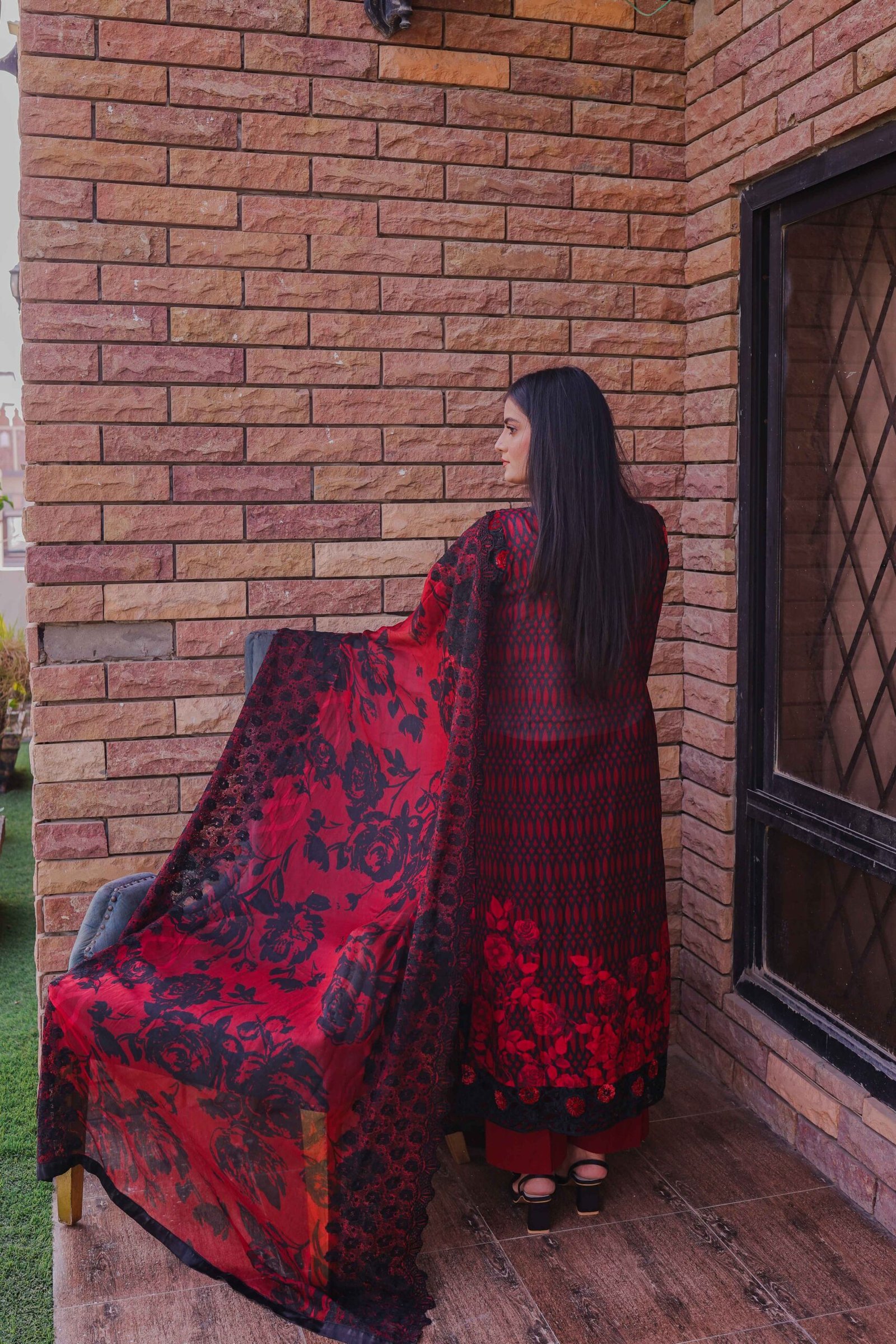 The shirt, tailored from soft lawn fabric, features a bold digital print with rose motifs blooming across a rich crimson and black net-style base. Intricate black embroidery around the neckline adds a touch of luxury, while the hem is detailed with threadwork and cutwork lace showcasing red floral accents.
