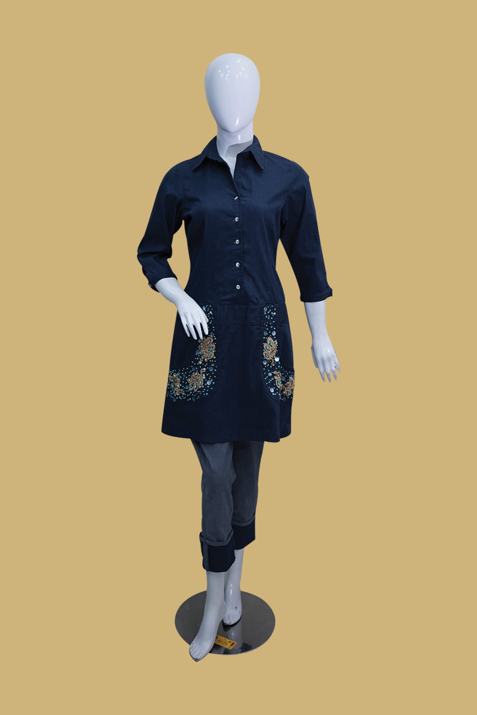 The outfit features a collared button-down kurti made from denim-look cotton blend fabric, offering both structure and softness. The standout elements are the embroidered side pockets — delicately embellished with golden, teal, and copper threadwork, bringing ethnic flair to this modern silhouette.