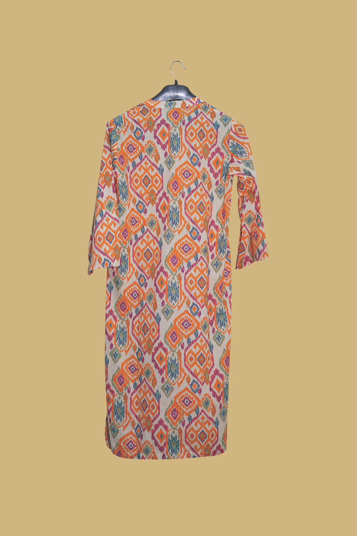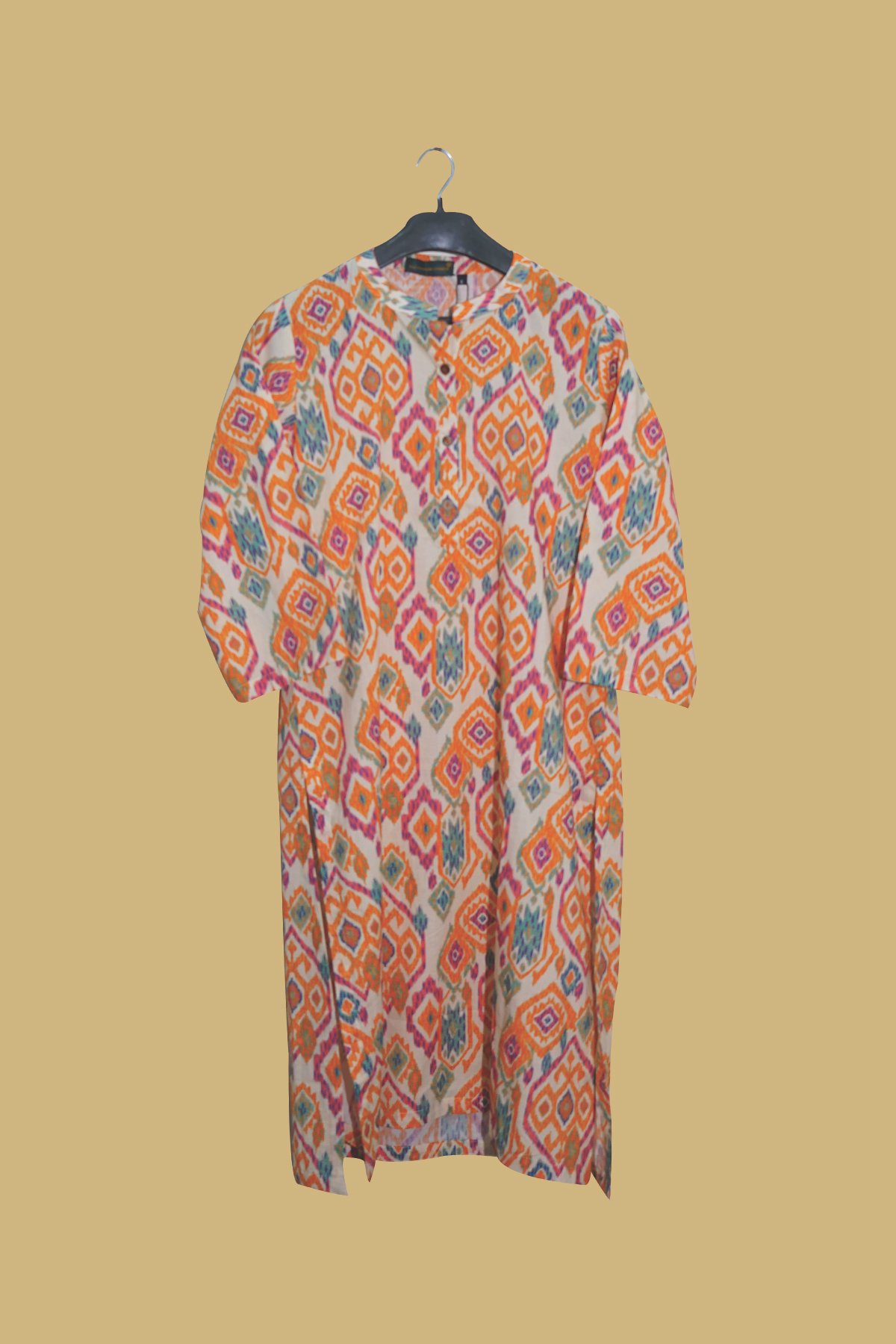 Make a bold and colorful statement with our Desert Bloom Ikat Printed Kurti from Dua Fashion Corner. This eye-catching piece features a traditional ikat-inspired print in a medley of vibrant shades — including orange, pink, turquoise, and purple — all set against a soft off-white base.