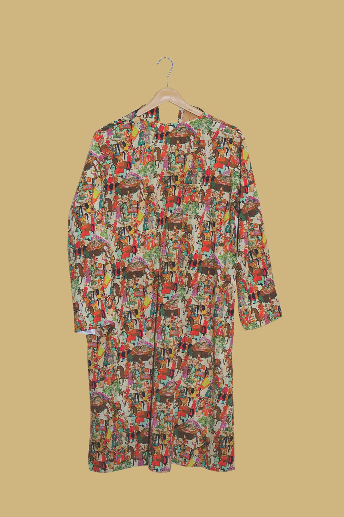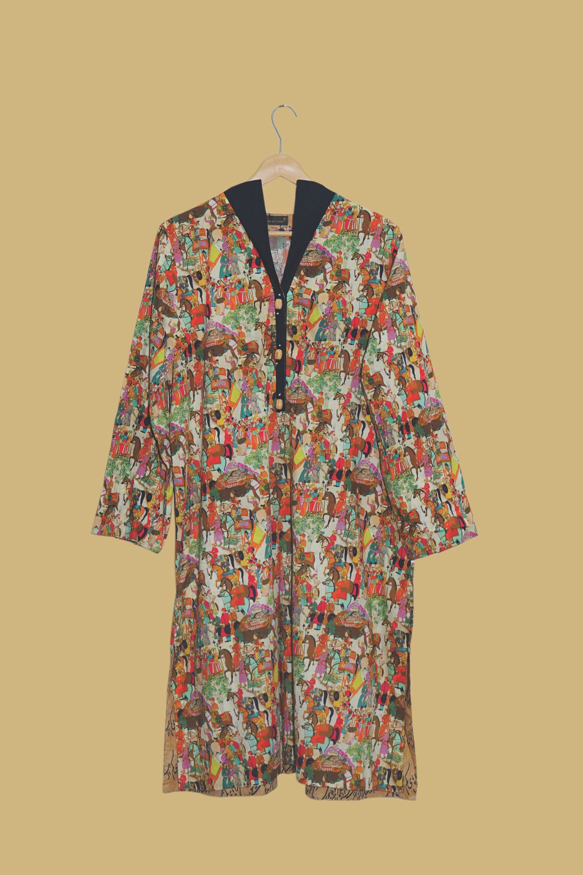 Step into the world of desi celebration with this vibrant and artistic kurti from Dua Fashion Corner. This 1-piece kurti is covered in an eye-catching traditional South Asian cultural print depicting festive processions, dhol walay, decorated horses, and mehfil scenes in an array of vibrant colors like red, green, orange, purple, and yellow.
