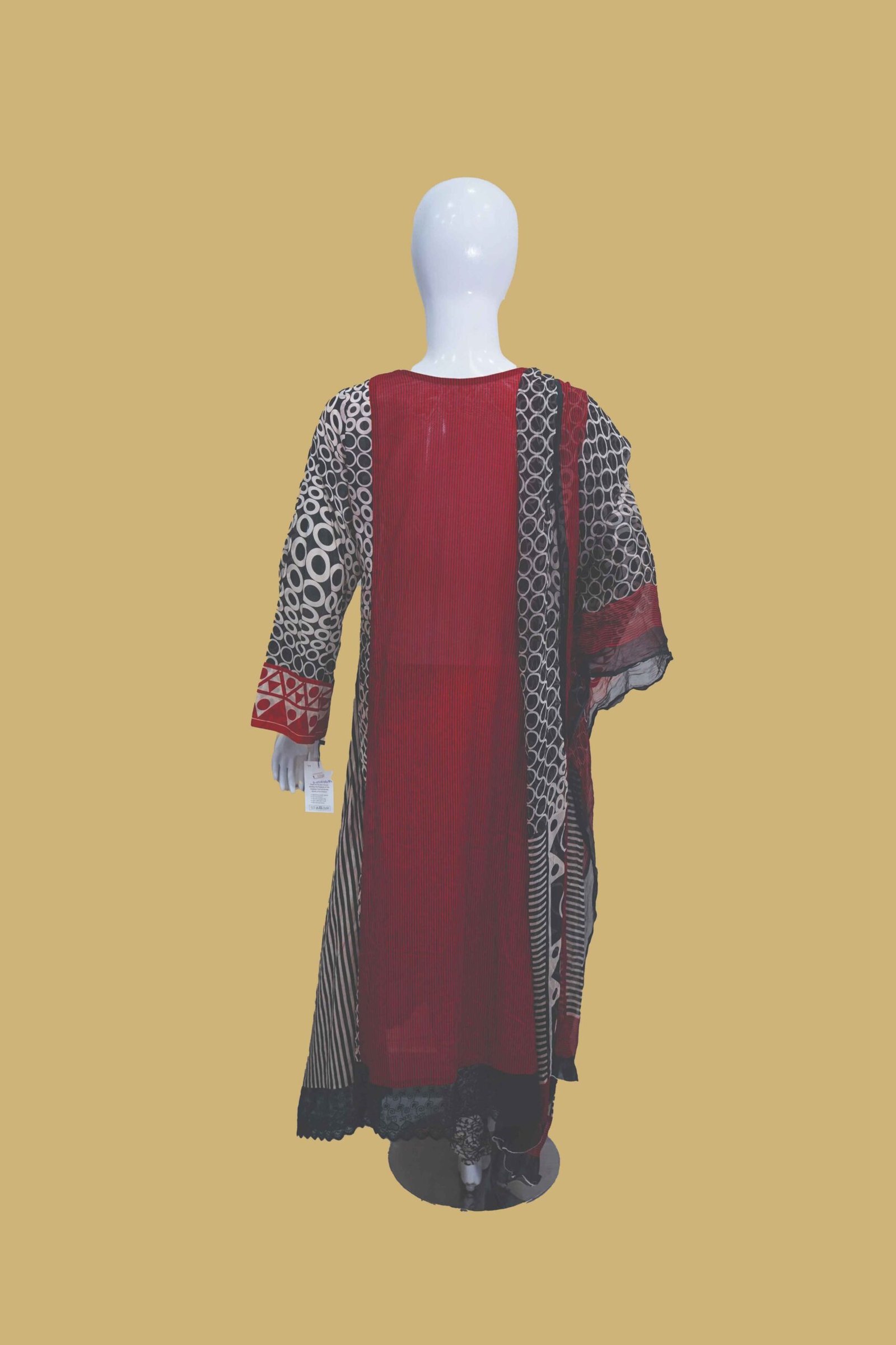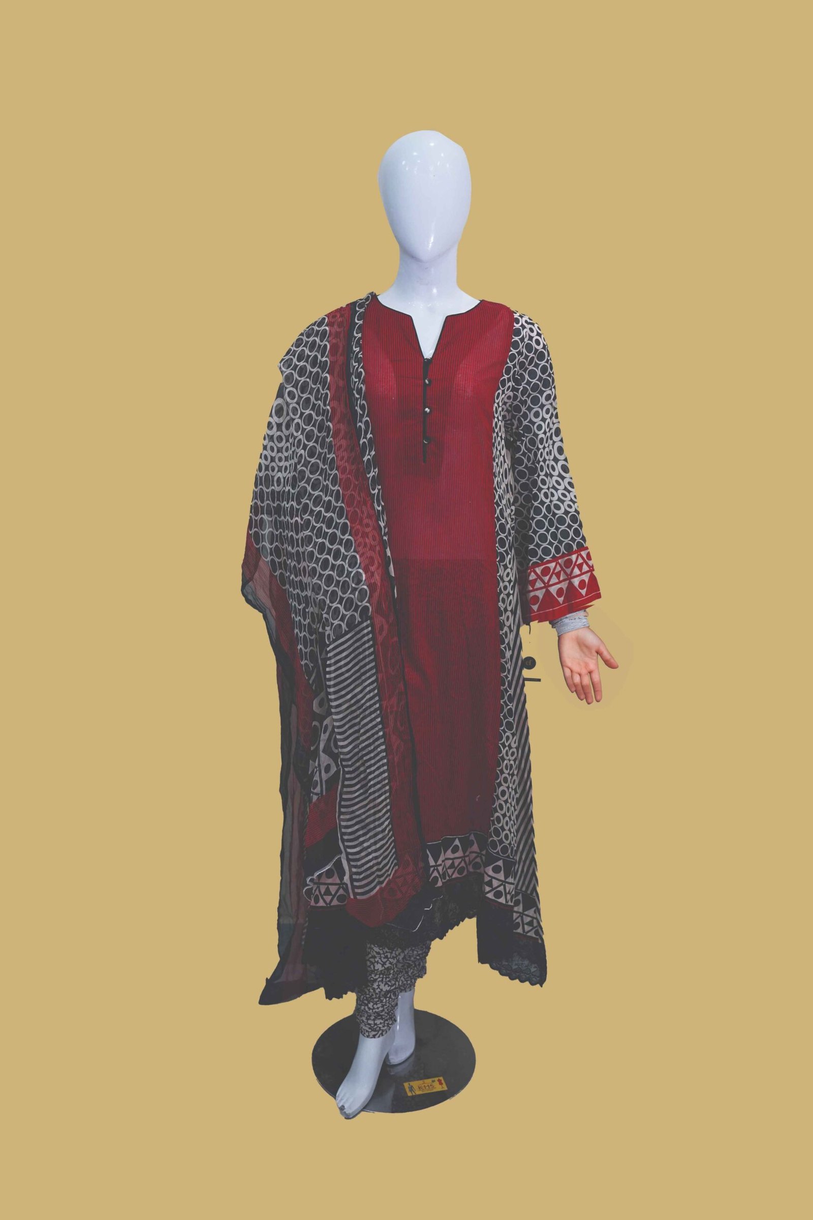 This stunning Dua Fashion Kurti Set features a rich red kurti crafted from premium cotton blend fabric, offering a perfect mix of comfort and elegance. The kurti showcases a sleek, modern design with a V-neckline and subtle vertical stripes, complemented by intricate black and white geometric prints on the sleeves and hem. The accompanying dupatta, made from lightweight chiffon, adds a graceful touch with its bold black and white circular patterns and red accents. Paired with matching patterned trousers, this outfit is ideal for festive occasions or casual outings. The vibrant color palette and detailed craftsmanship make it a must-have for every wardrobe.