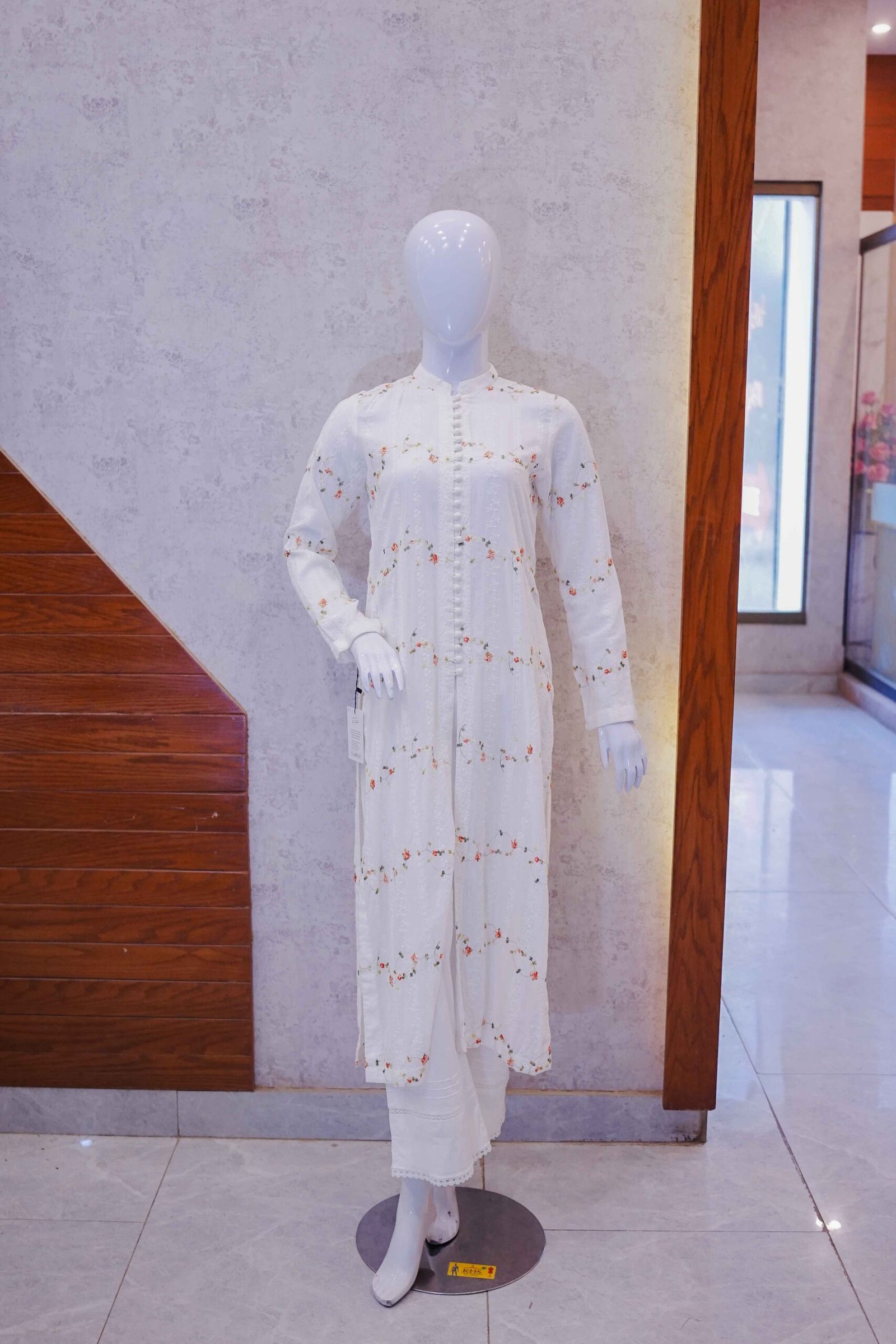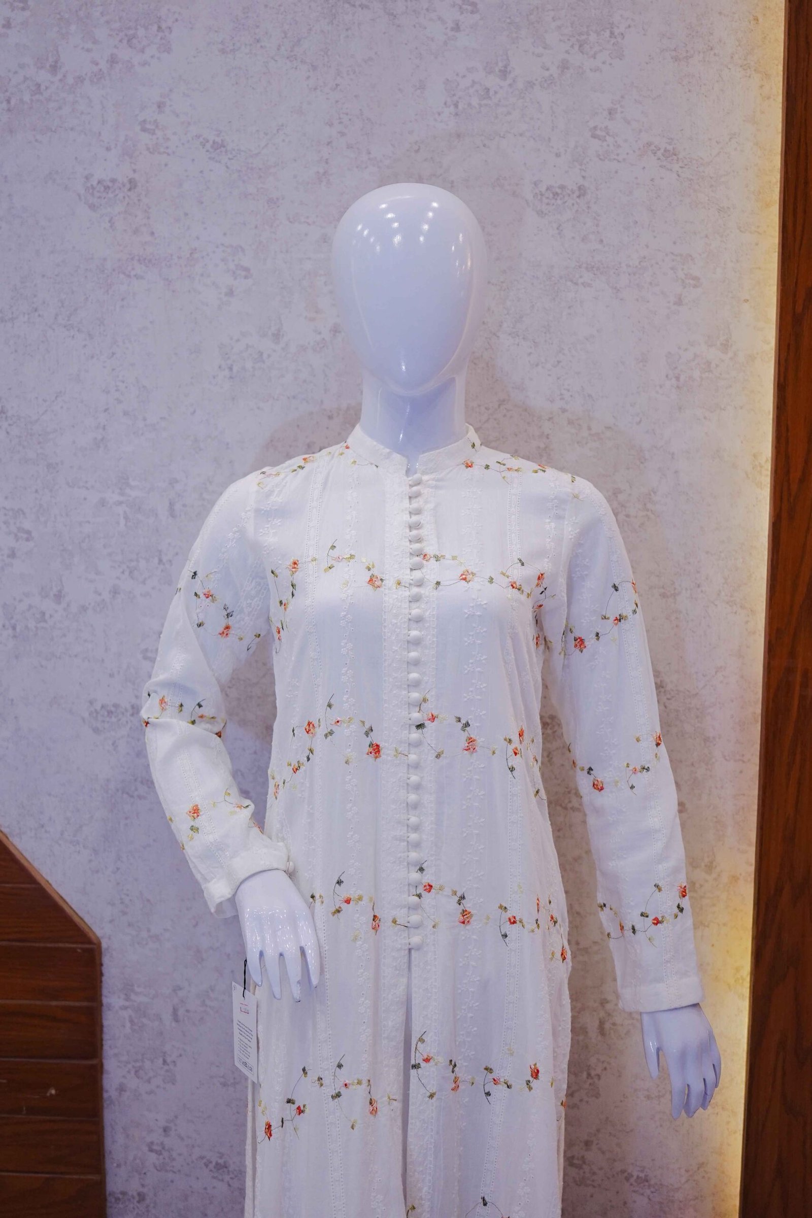 Introducing the graceful White Floral Embroidered Kurta from Dua Fashion Corner, designed for the modern woman who appreciates elegance in simplicity.
