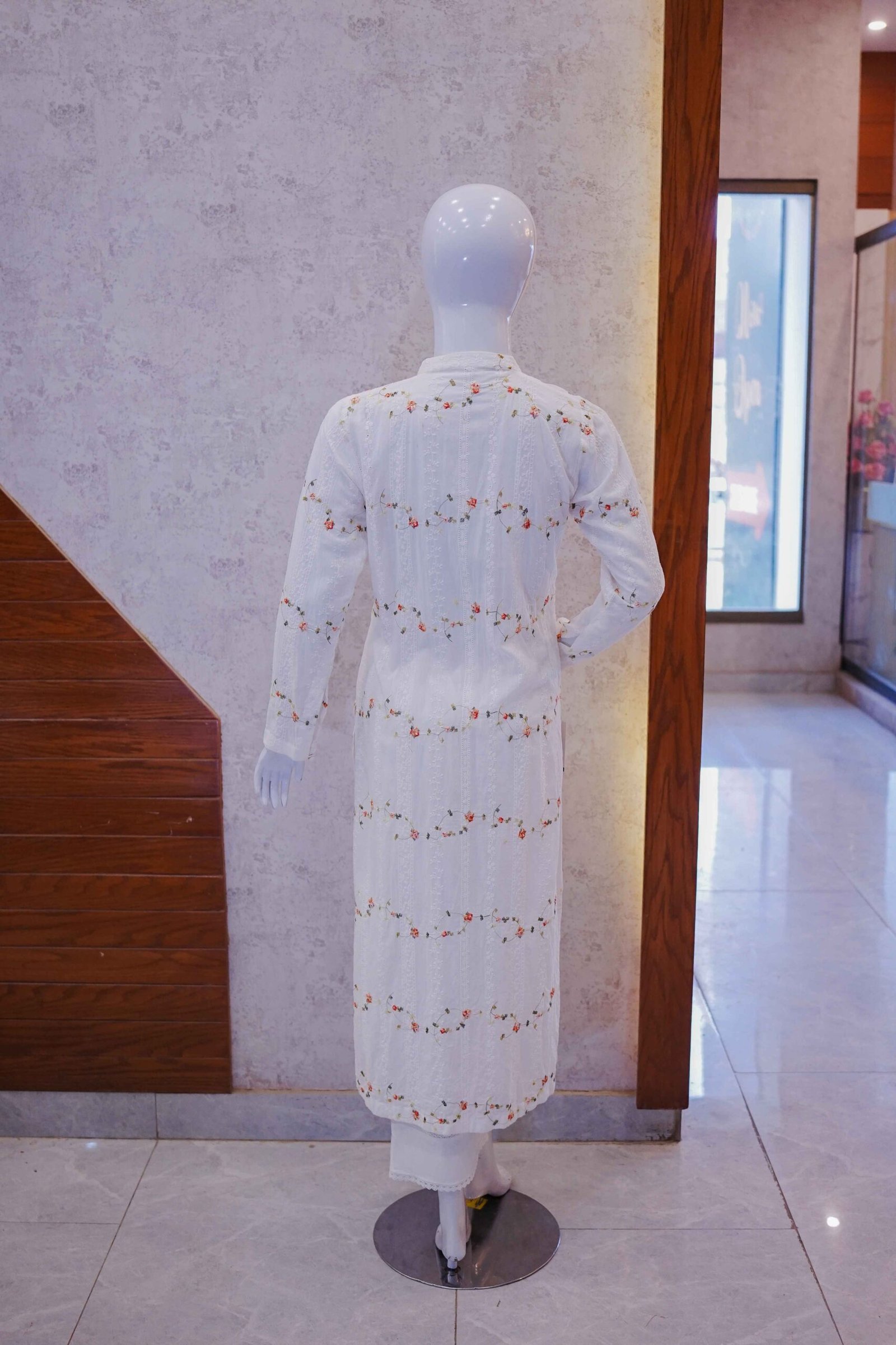 This kurta is crafted from premium-quality soft cotton fabric, making it breathable and ideal for all-day comfort. The base is a pure white tone, symbolizing freshness and purity, while the entire piece is adorned with fine multicolor floral embroidery — featuring subtle shades of peach, green, and soft red for a delicate feminine touch.