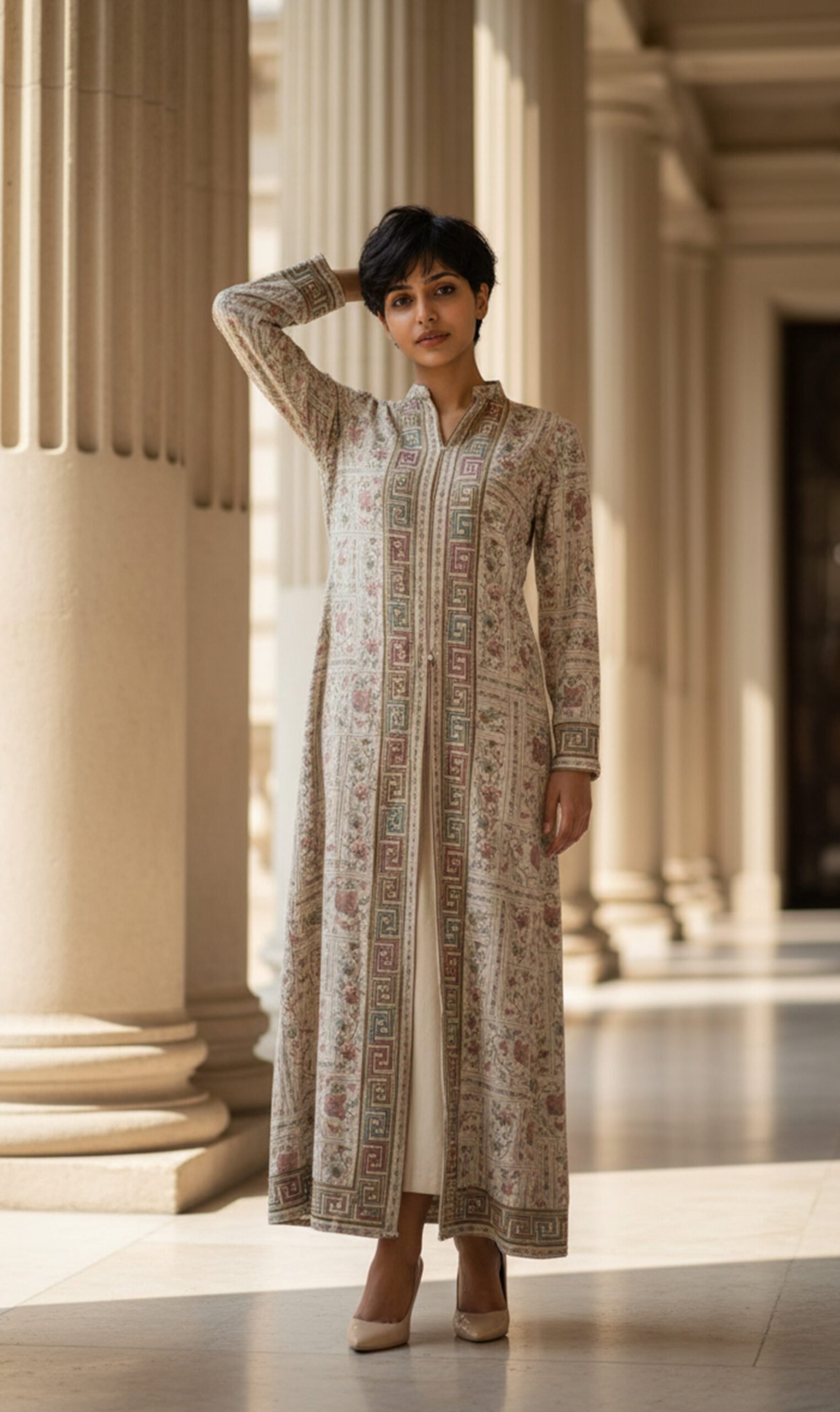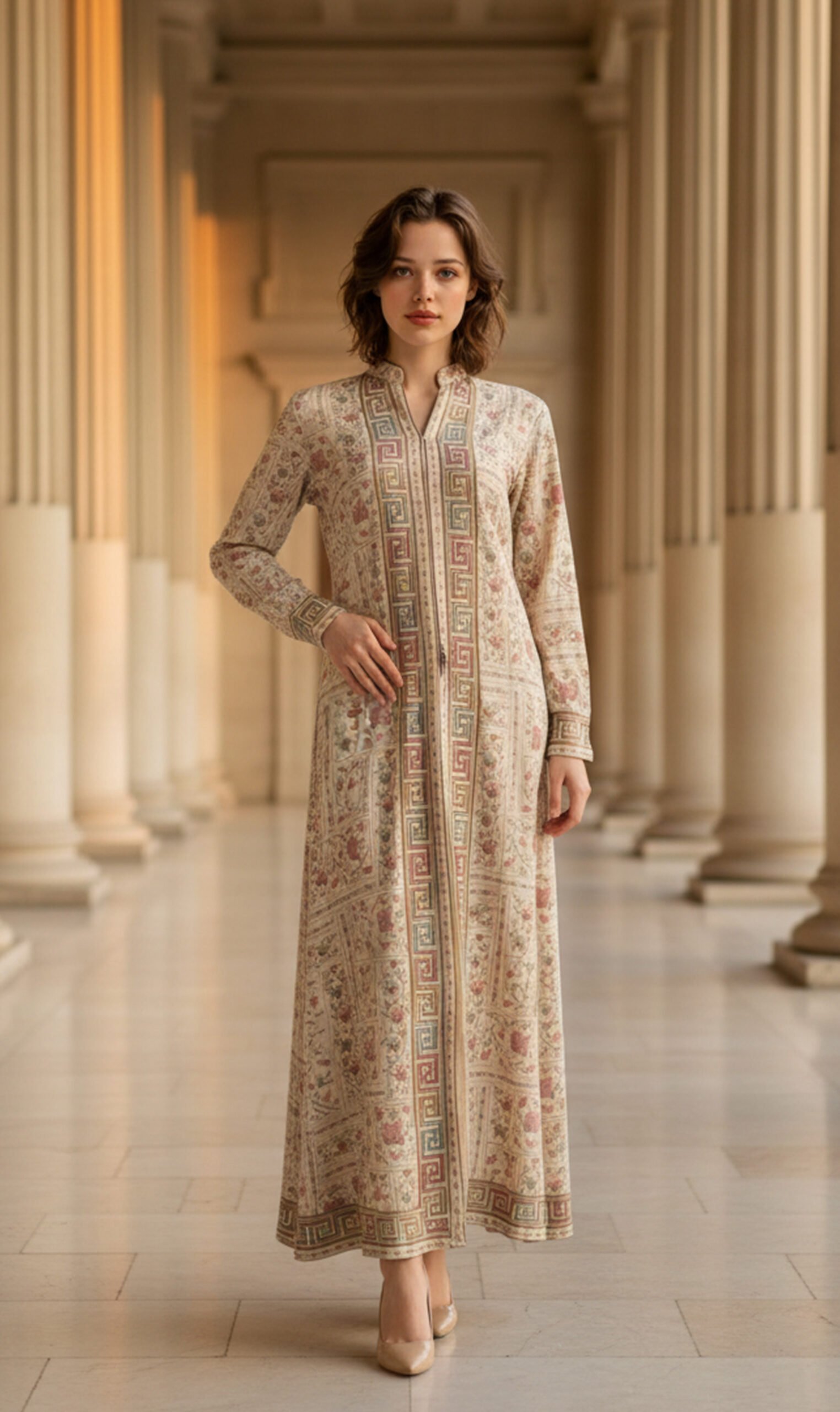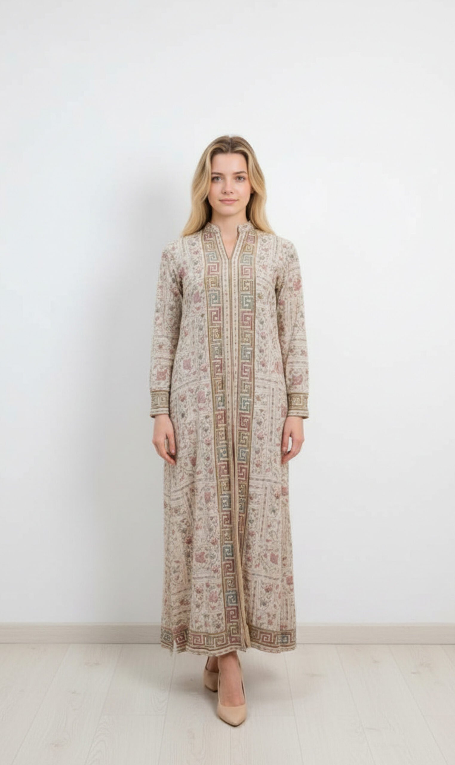 The standout element is the center front detailed panel with multicolored Greek key border embroidery that runs vertically from collar to hem, adding elongation and structure to the silhouette. Subtle floral motifs in soft pastel shades give it a luxuriously vintage feel.
