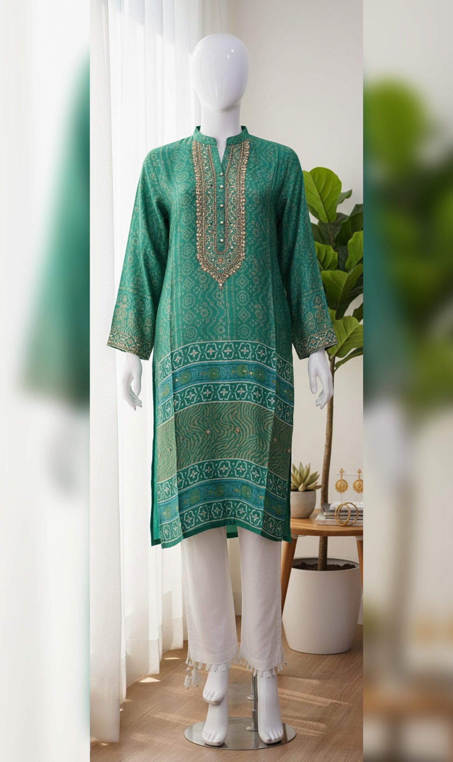 Elegant emerald silk outfit featuring detailed prints and exquisite embroidery — a perfect blend of tradition and modern charm.
