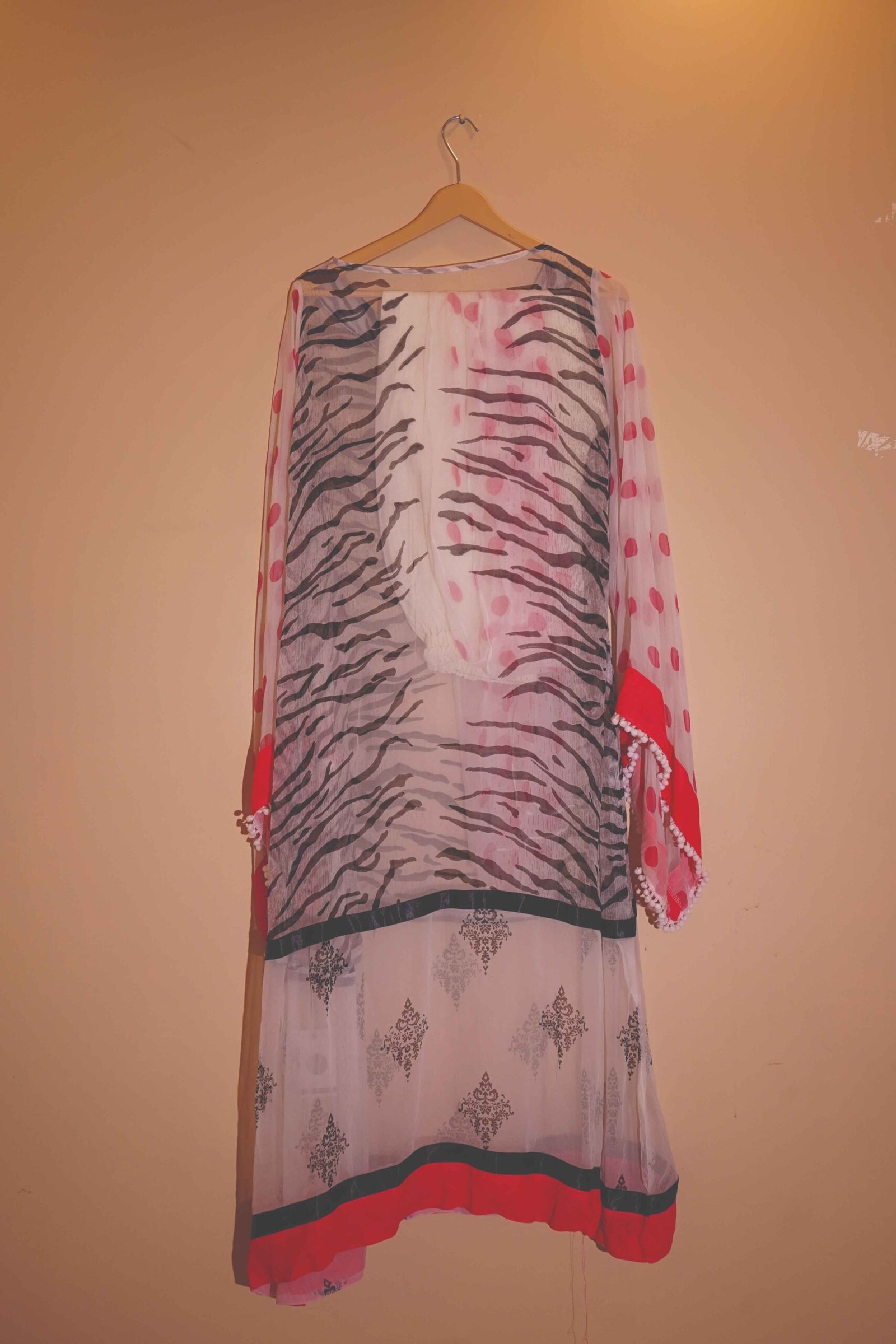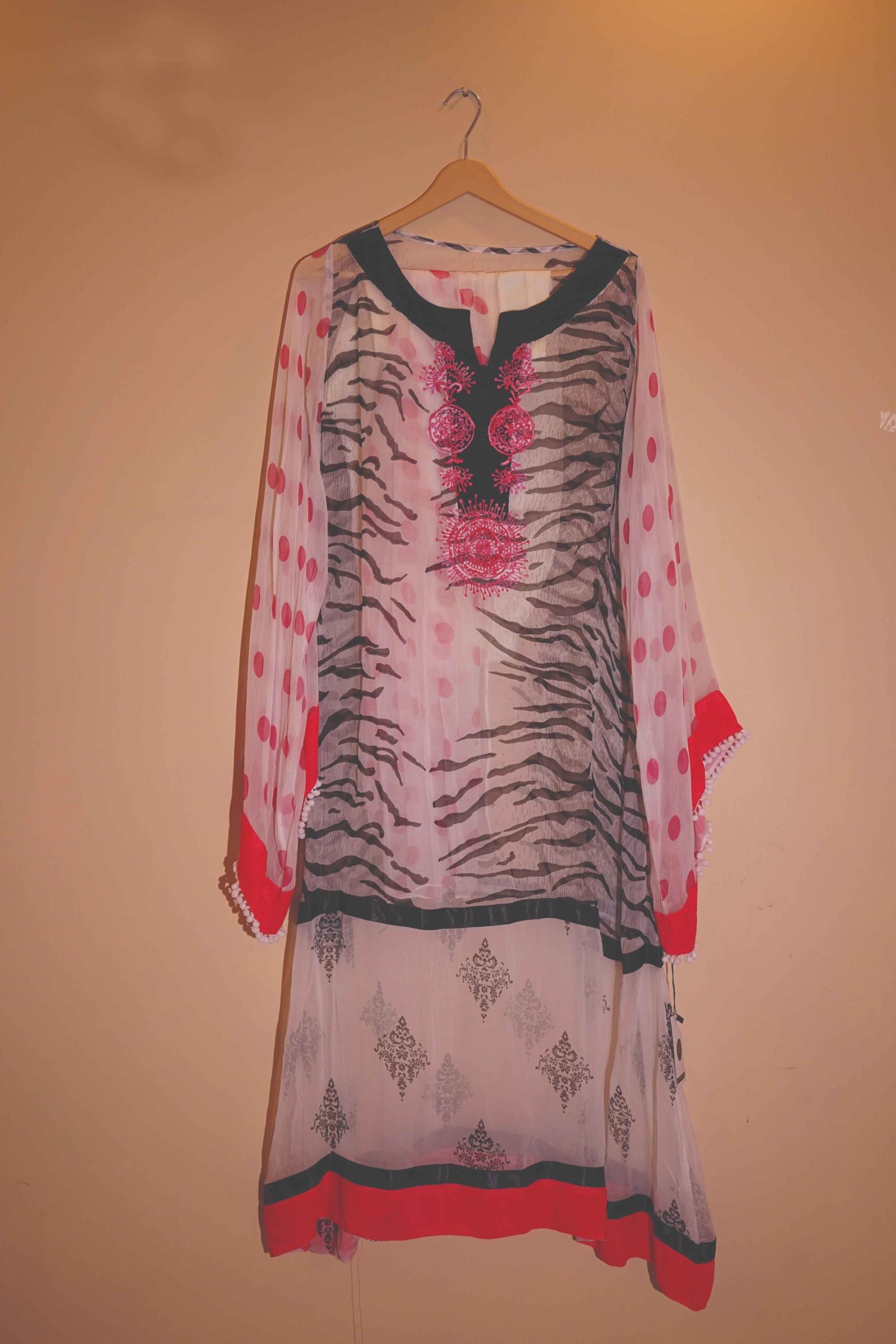 The neon pink embroidery over a black strip center panel adds a strong ethnic punch, while sheer fabric play around the hemline gives it a lightweight, airy finish. Paired with a matching lower and dupatta, this piece makes no apologies — it’s for those who love to express their style with boldness.