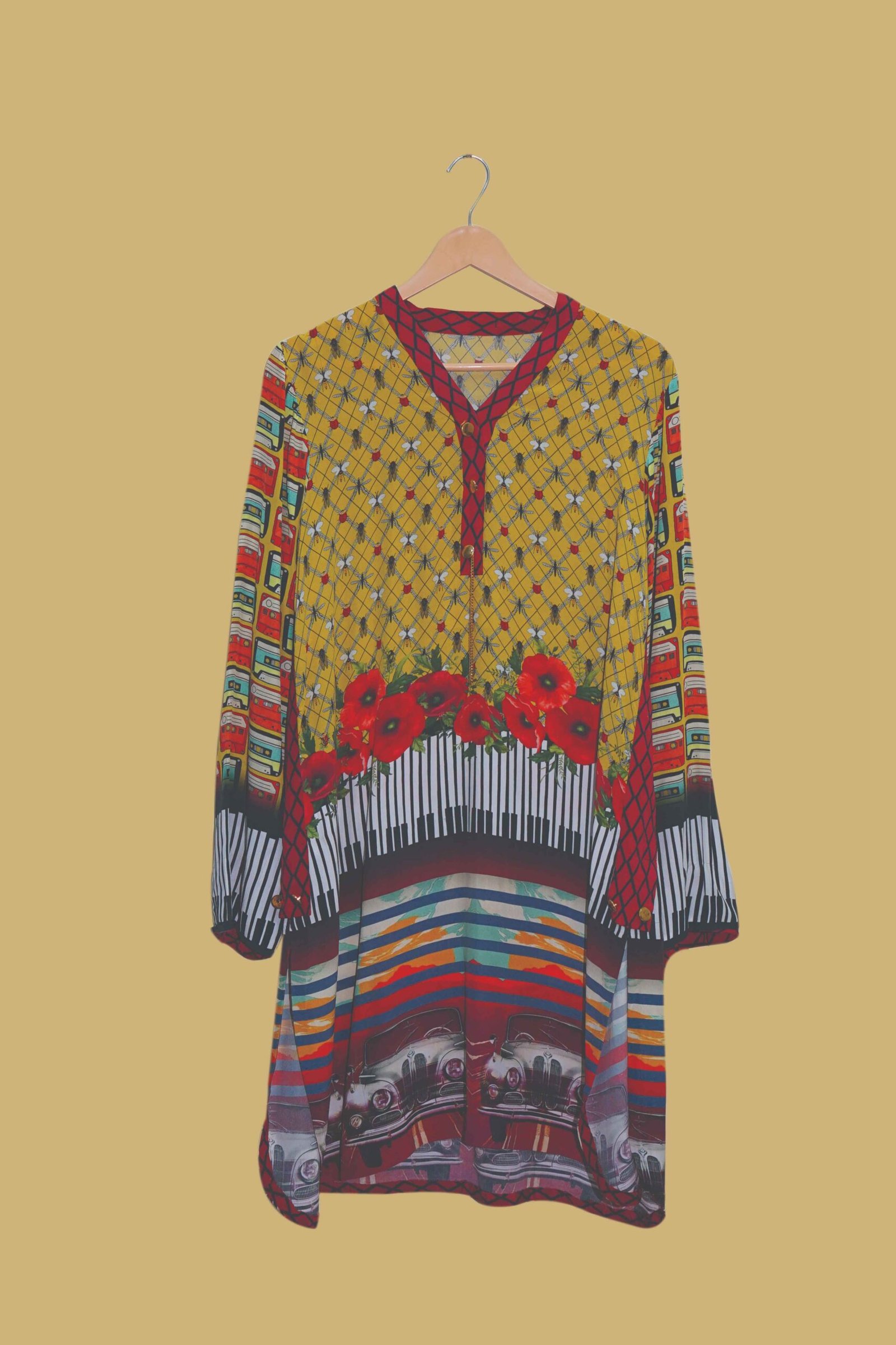 Colors: Mustard yellow, red, multicolor prints