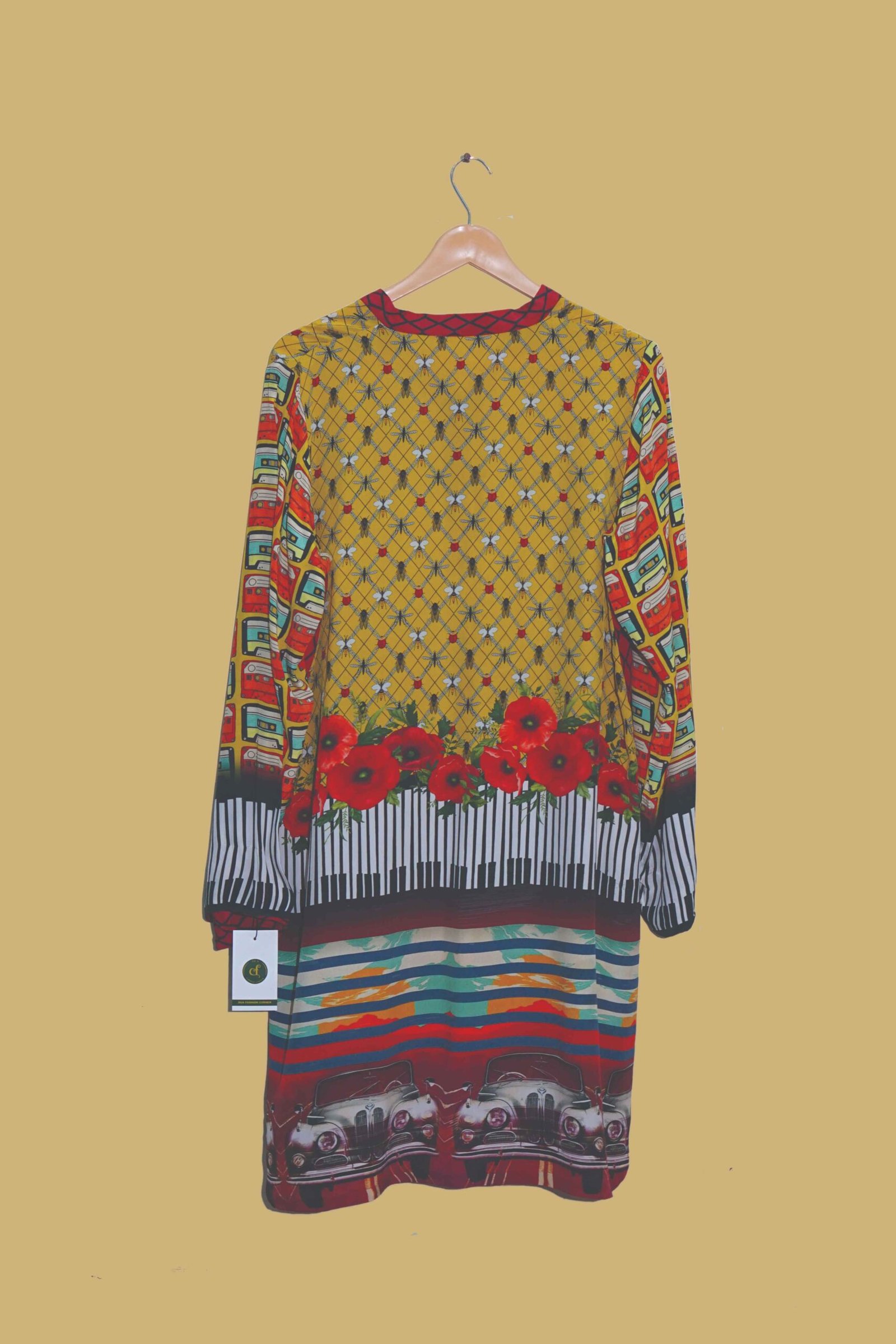 Add an artistic flair to your wardrobe with this multi-print fusion kurti by Dua Fashion Corner. Perfect for casual outings, creative workplaces, or cultural events, this kurti is a mix of retro, floral, and geometric elements that speak style and confidence.