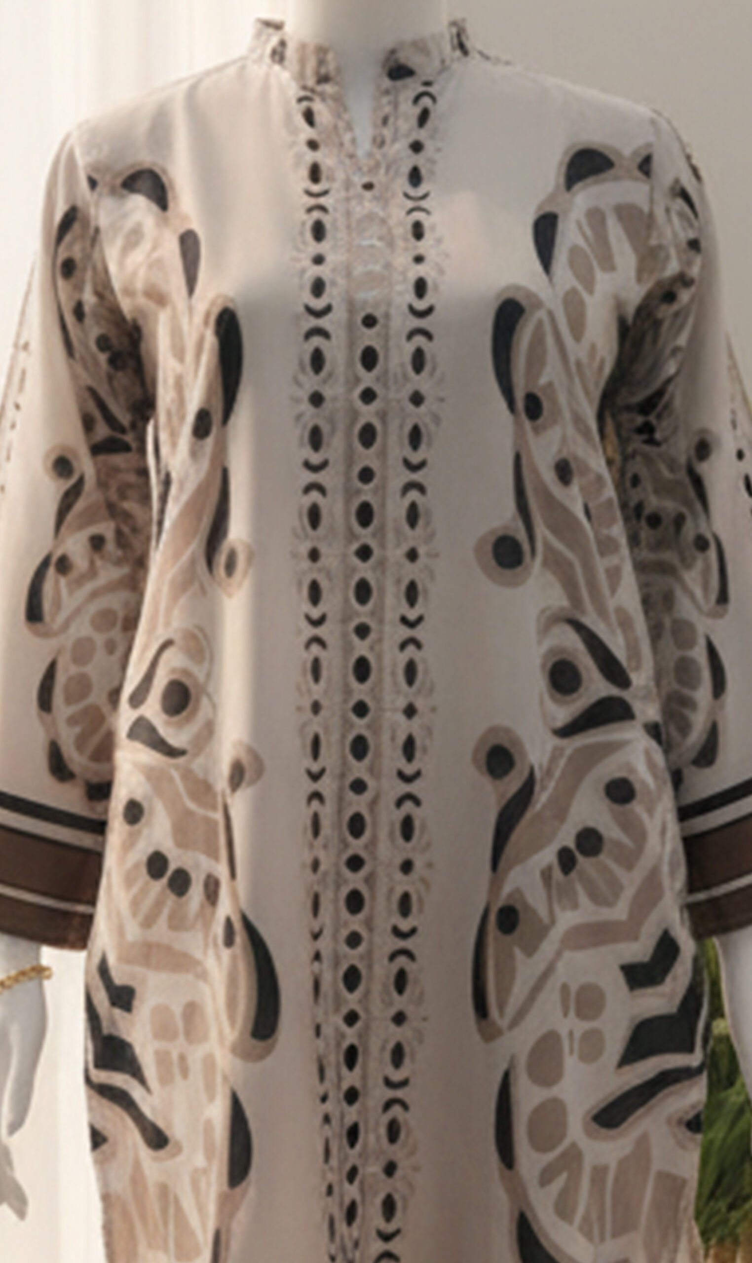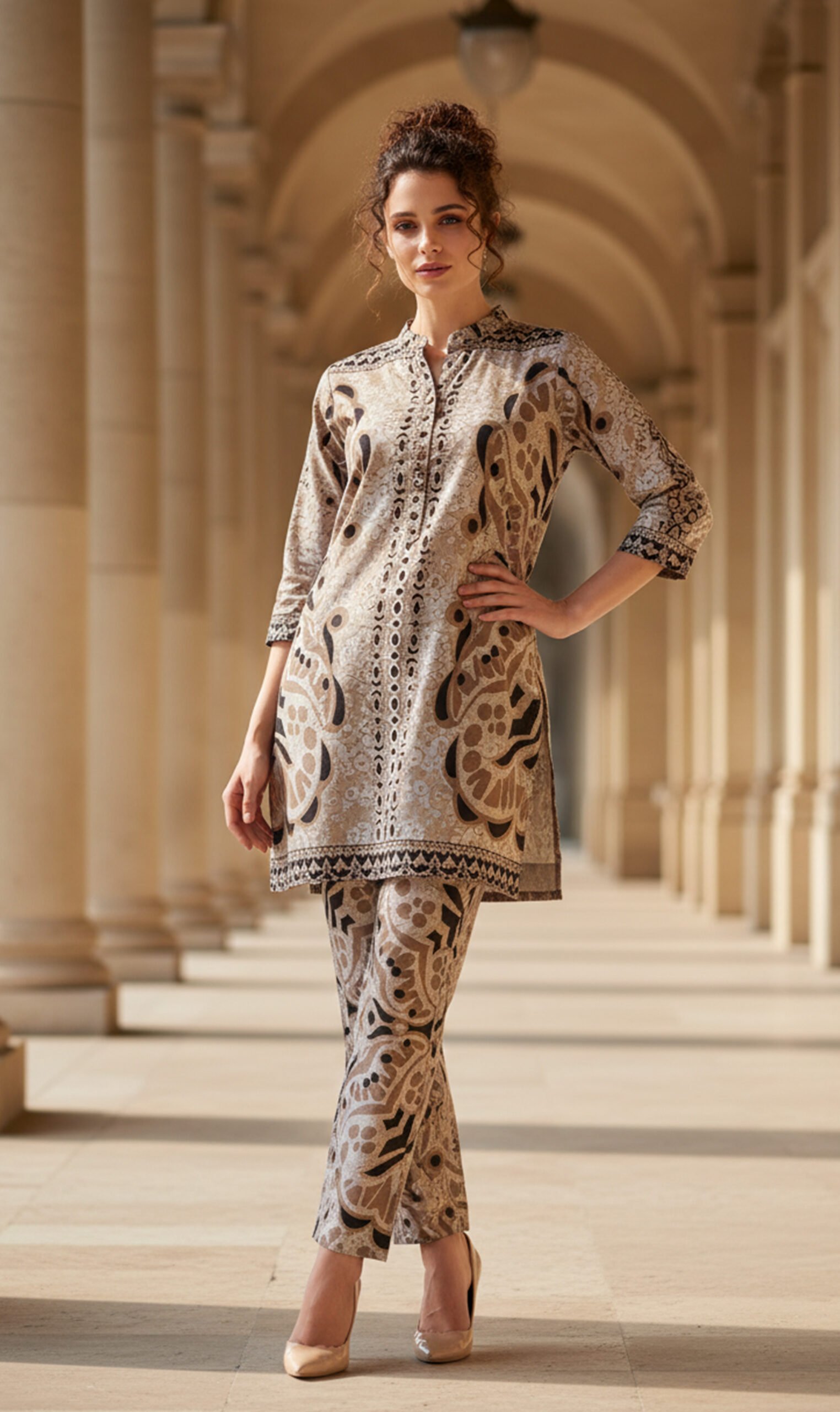 Radiate understated sophistication with this elegant design from Dua Fashion Corner. Crafted from luxurious silk, this outfit combines comfort and opulence effortlessly. The base tone of soft beige is enriched with golden and earthy abstract motifs that create a bold yet elegant aesthetic. Detailed borders on the sleeves and hemline add a touch of finesse, while the coordinated trousers complete the look with perfect symmetry.