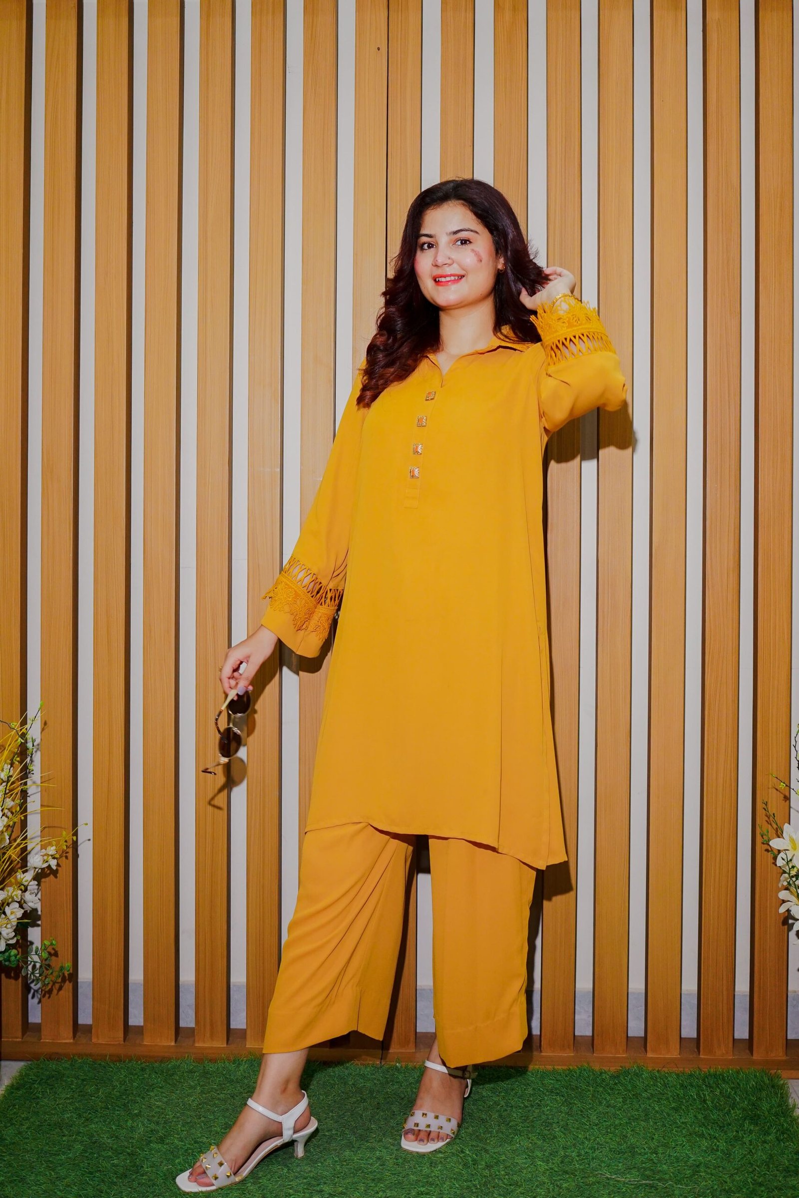 Elevate your everyday style with this radiant mustard-colored 2-piece outfit. The shirt features intricate lace detailing on the sleeves, a soft round neckline with a button-down placket, and a relaxed, slightly asymmetric hem. Paired with comfortable wide-leg trousers, this outfit brings together grace and ease in one striking look. Ideal for daytime events, festive gatherings, or casual meetups – it’s a must-have addition to your wardrobe.