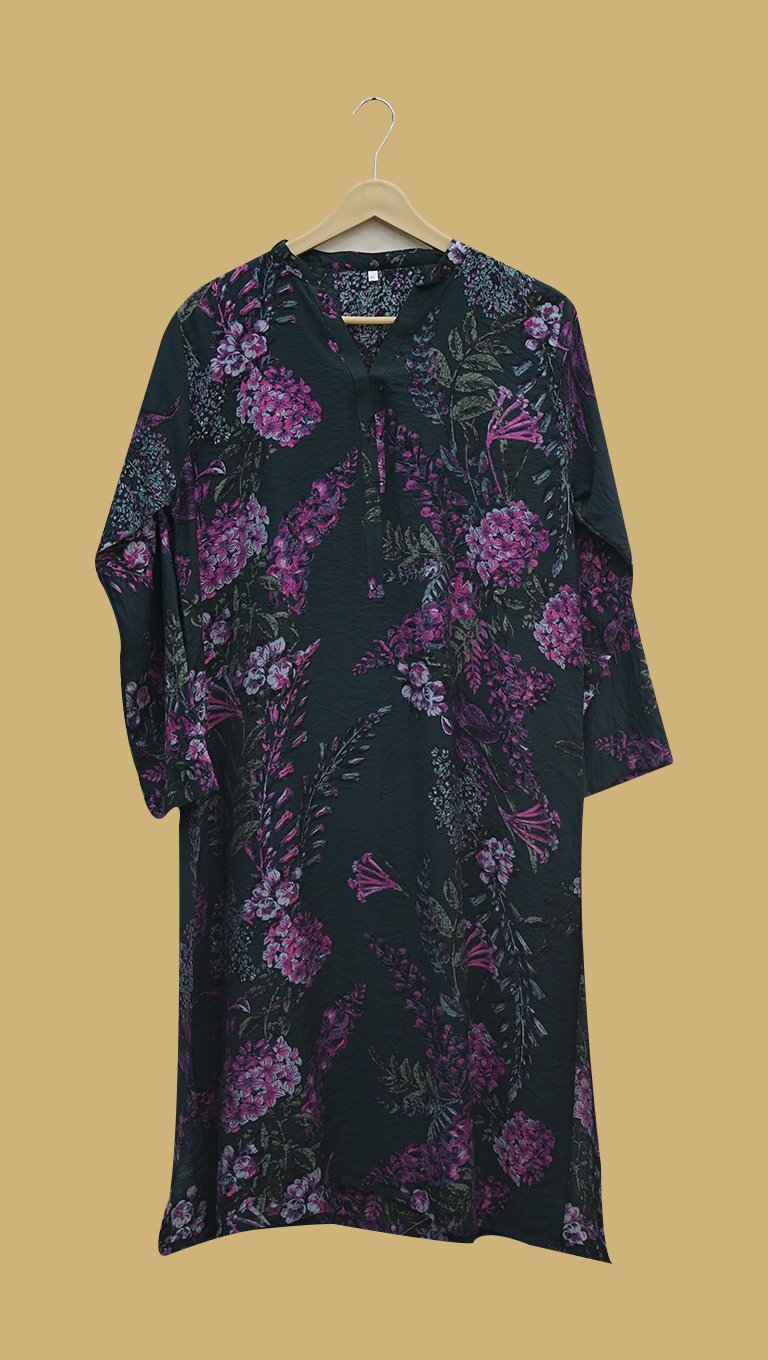 This black floral kurti is the embodiment of understated elegance. With detailed purple and lavender flower prints, it’s ideal for women who love graceful yet stylish outfits. The print is balanced with subtle leafy accents, giving it a natural, refined vibe.