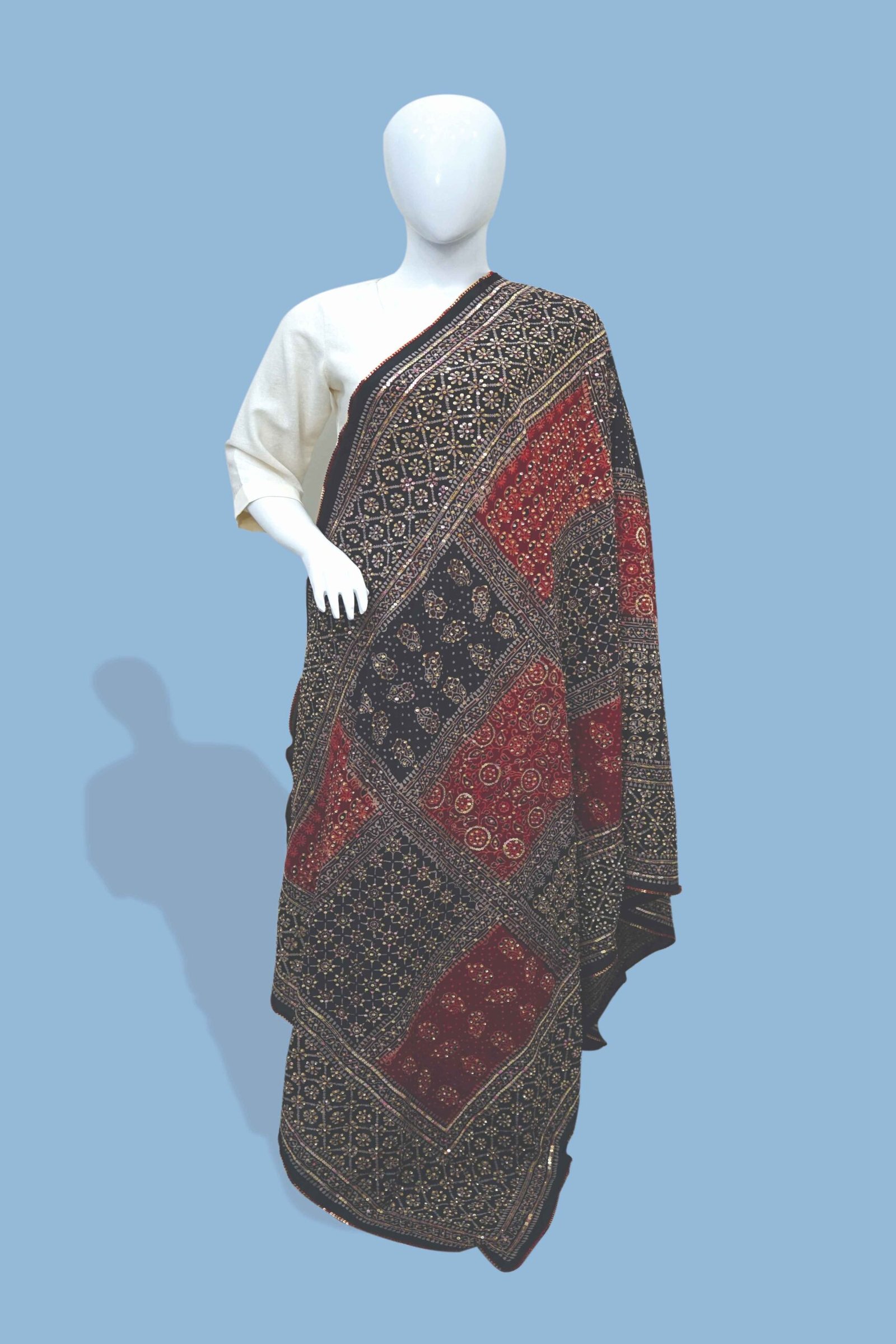 Step into cultural grace with this stunning Handcrafted Ajrak Shawl from Dua Fashion Corner. Featuring classic Sindhi block prints in rich maroon and black tones, this shawl is more than just an accessory — it’s a piece of art rooted in tradition.