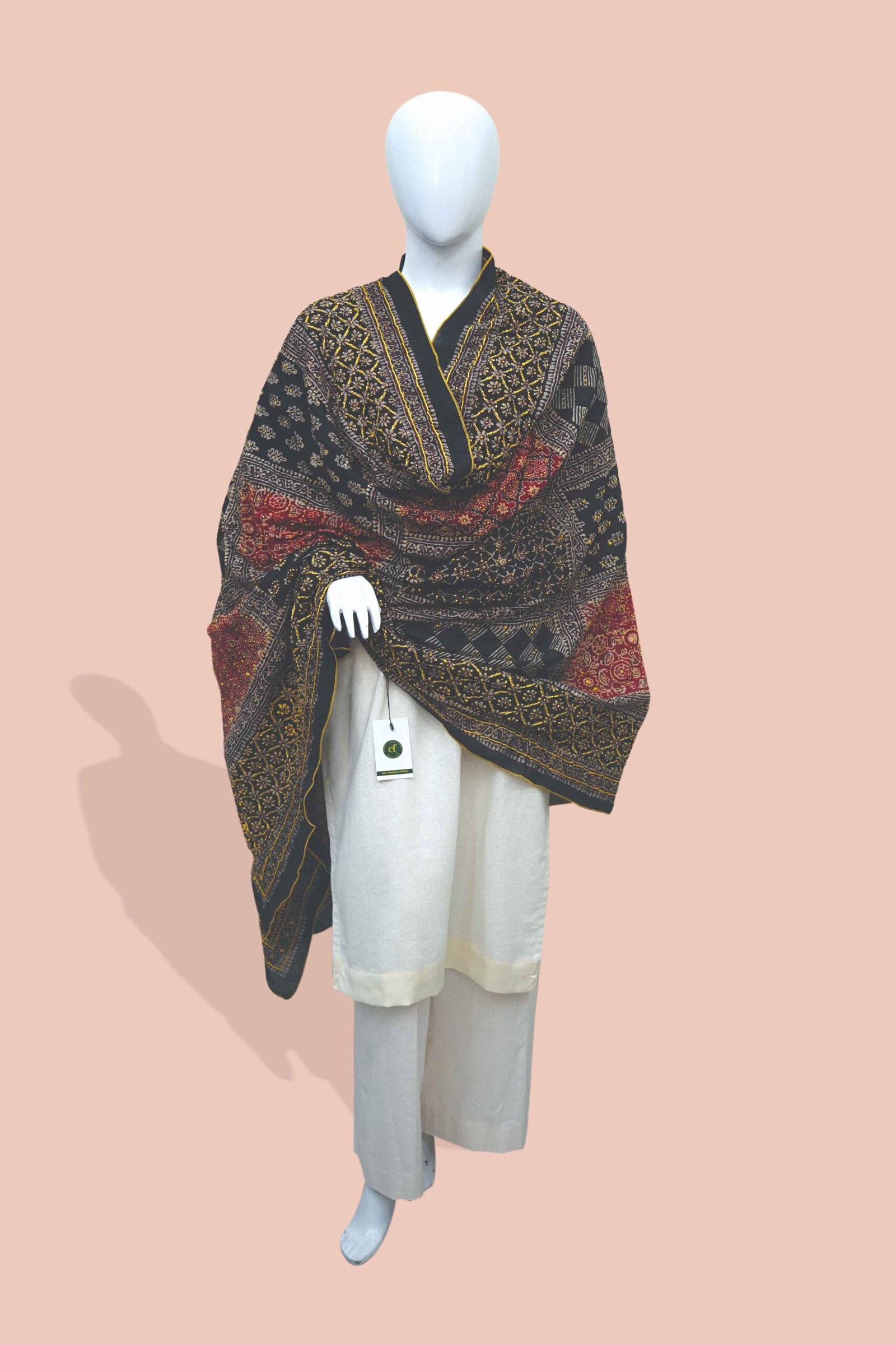 Unfold the elegance of heritage with Heritage Flame – Royal Ajrak Shawl from Dua Fashion Corner. This luxurious shawl boasts traditional Sindhi motifs printed in rich black, deep maroon, and accented with golden detailing — a perfect fusion of culture and sophistication.