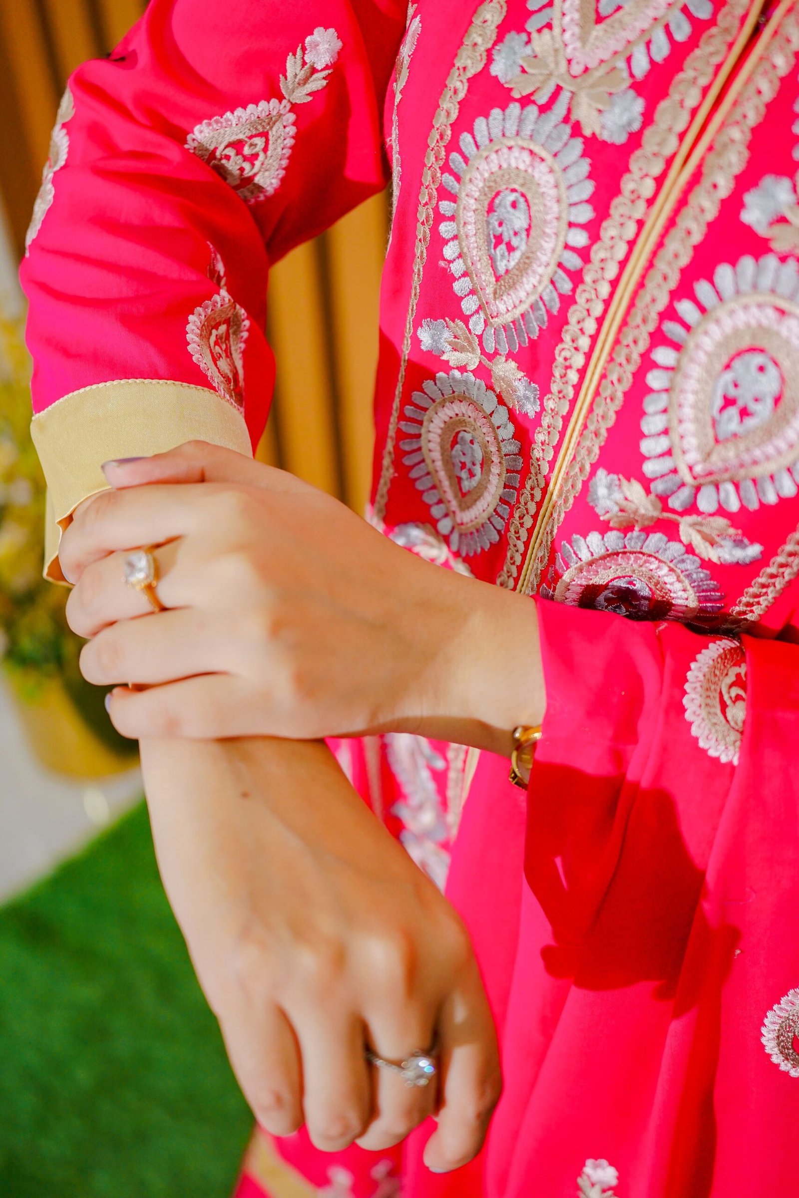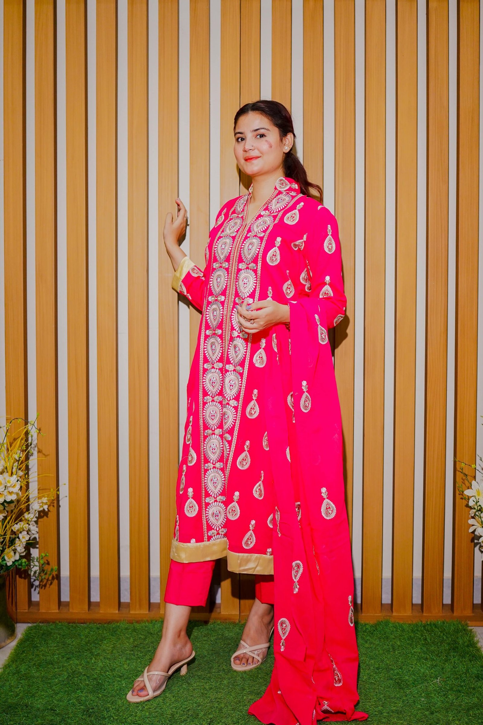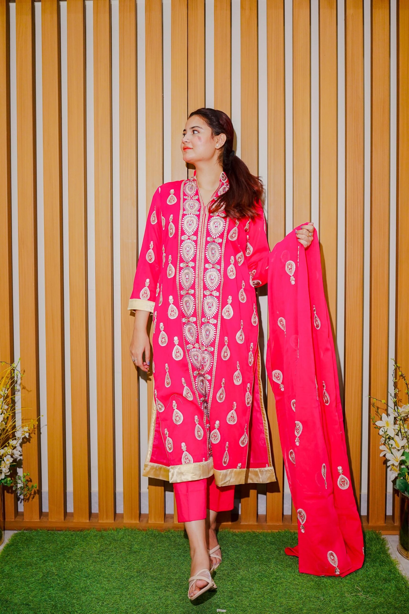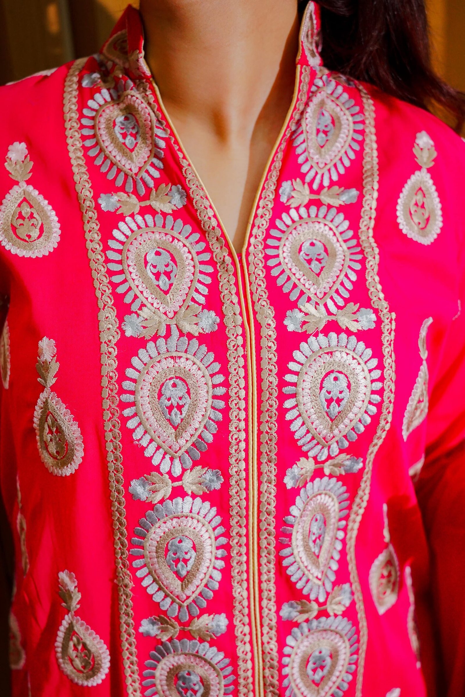 Brighten up any occasion with this elegant hot pink ethnic outfit, adorned with intricate golden embroidery and delicate motif work throughout. The straight-cut shirt features detailed front paneling and golden edging, adding a graceful touch. Paired with a coordinating dupatta and tapered trousers, this ensemble is perfect for festive celebrations, cultural functions, or special occasions where you want to make a bold yet classy statement.