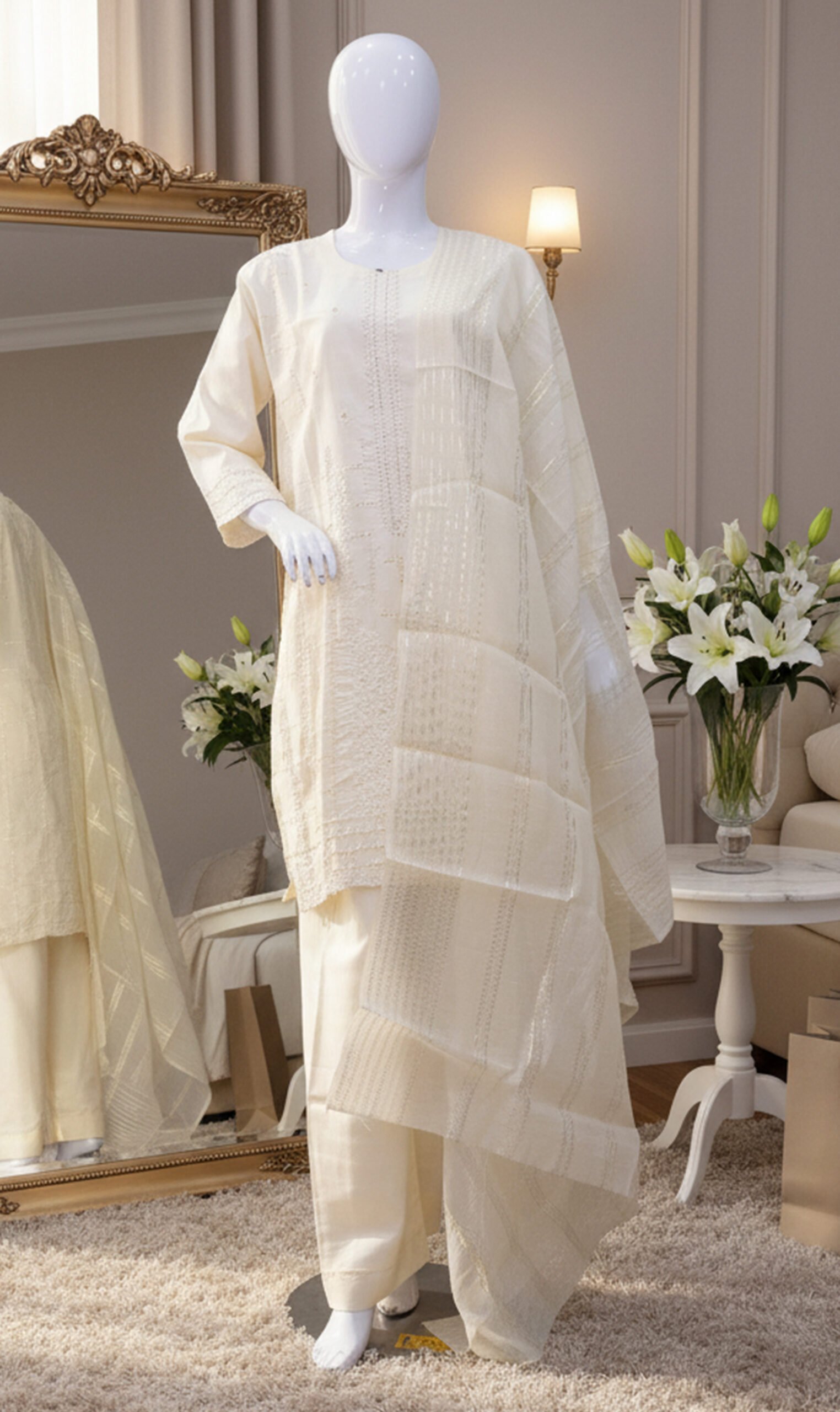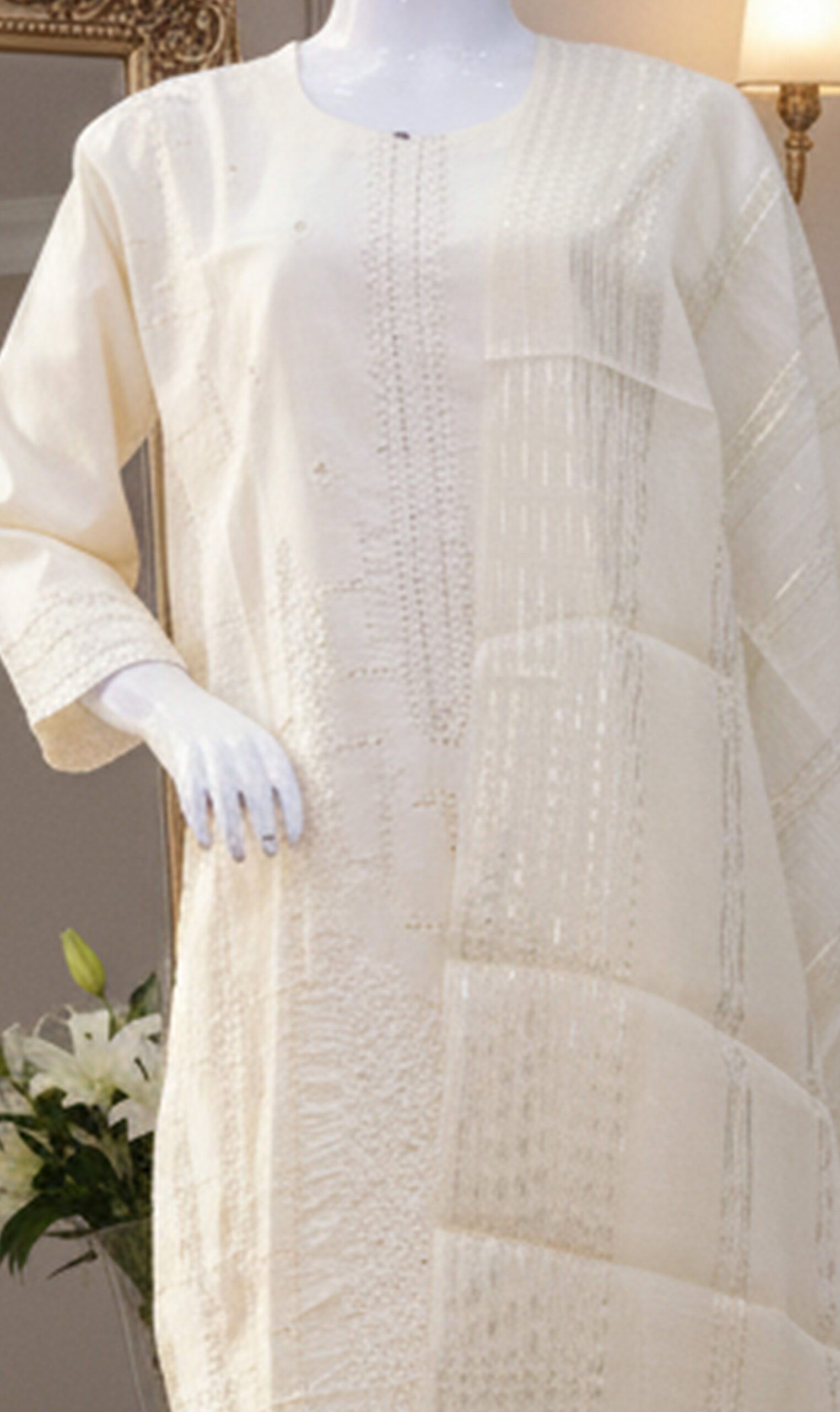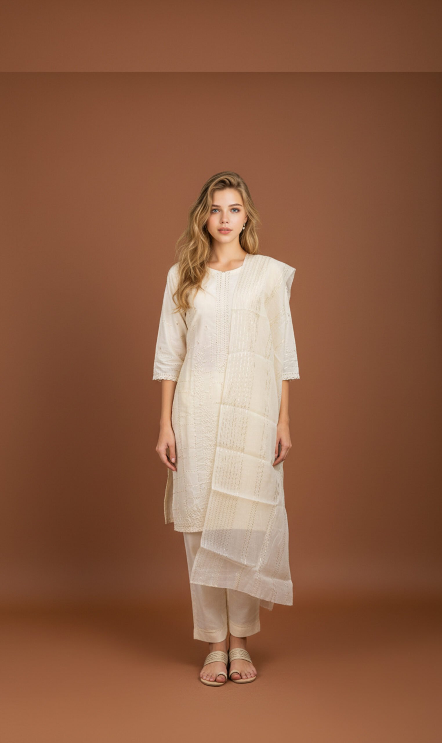 Aaghaz-e-nazakat: This elegant ivory cotton ensemble blends understated embroidery with lightweight comfort — perfect for daytime gatherings and refined everyday wear. The kurta features intricate tonal embroidery on a straight silhouette with three-quarter sleeves and side slits, paired with straight cotton trousers and a sheer, textured dupatta that adds graceful layers.