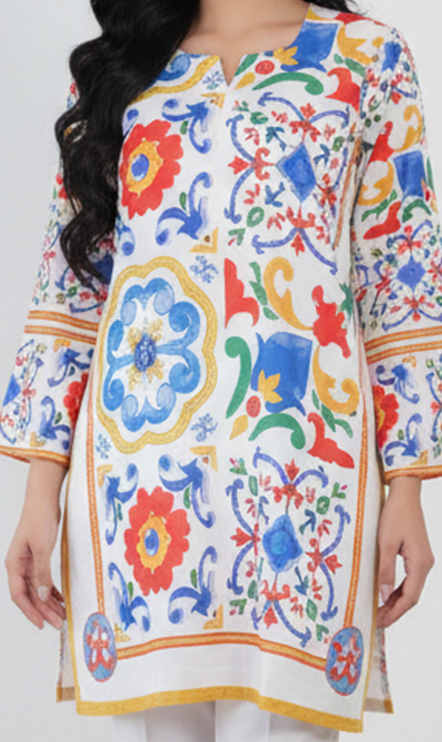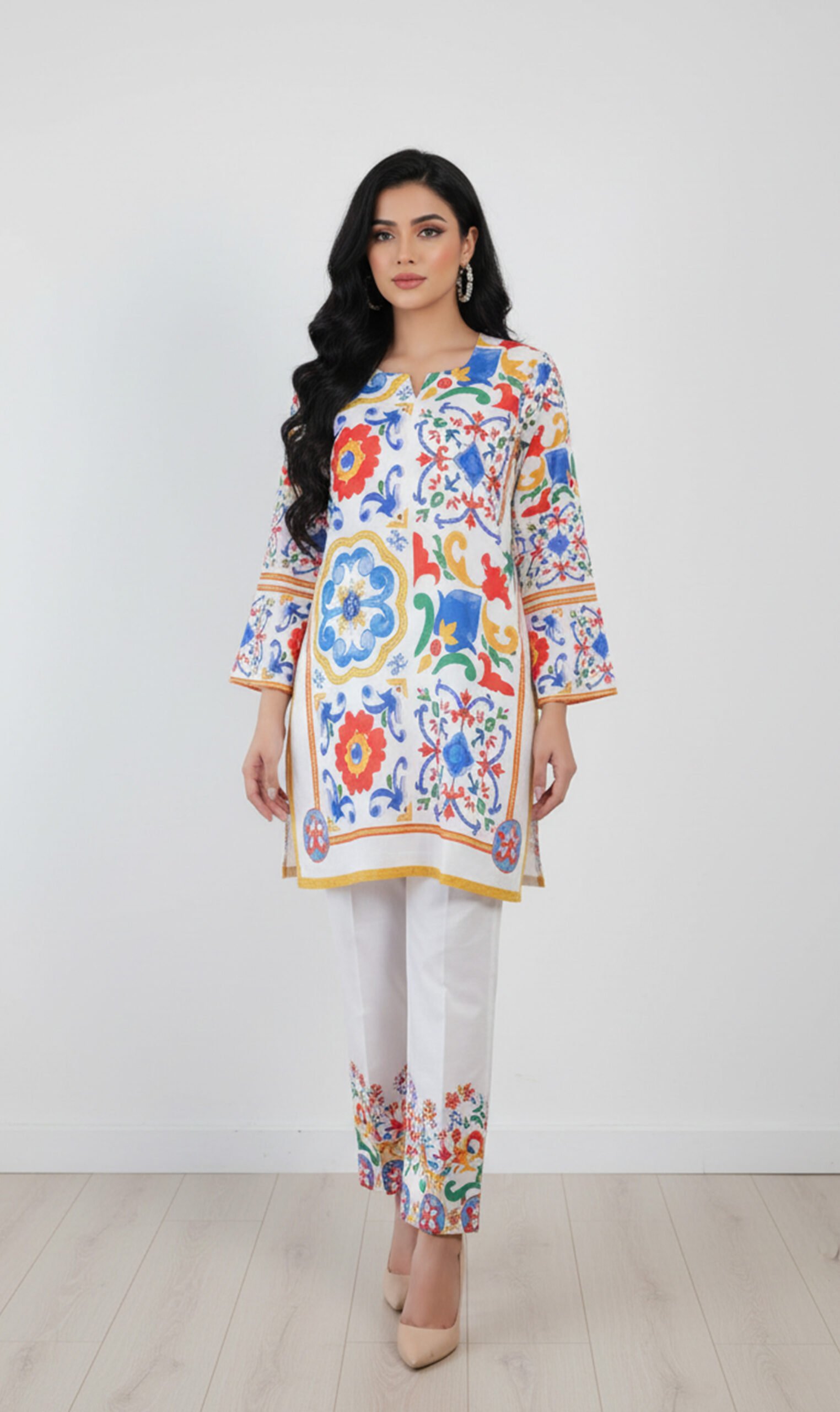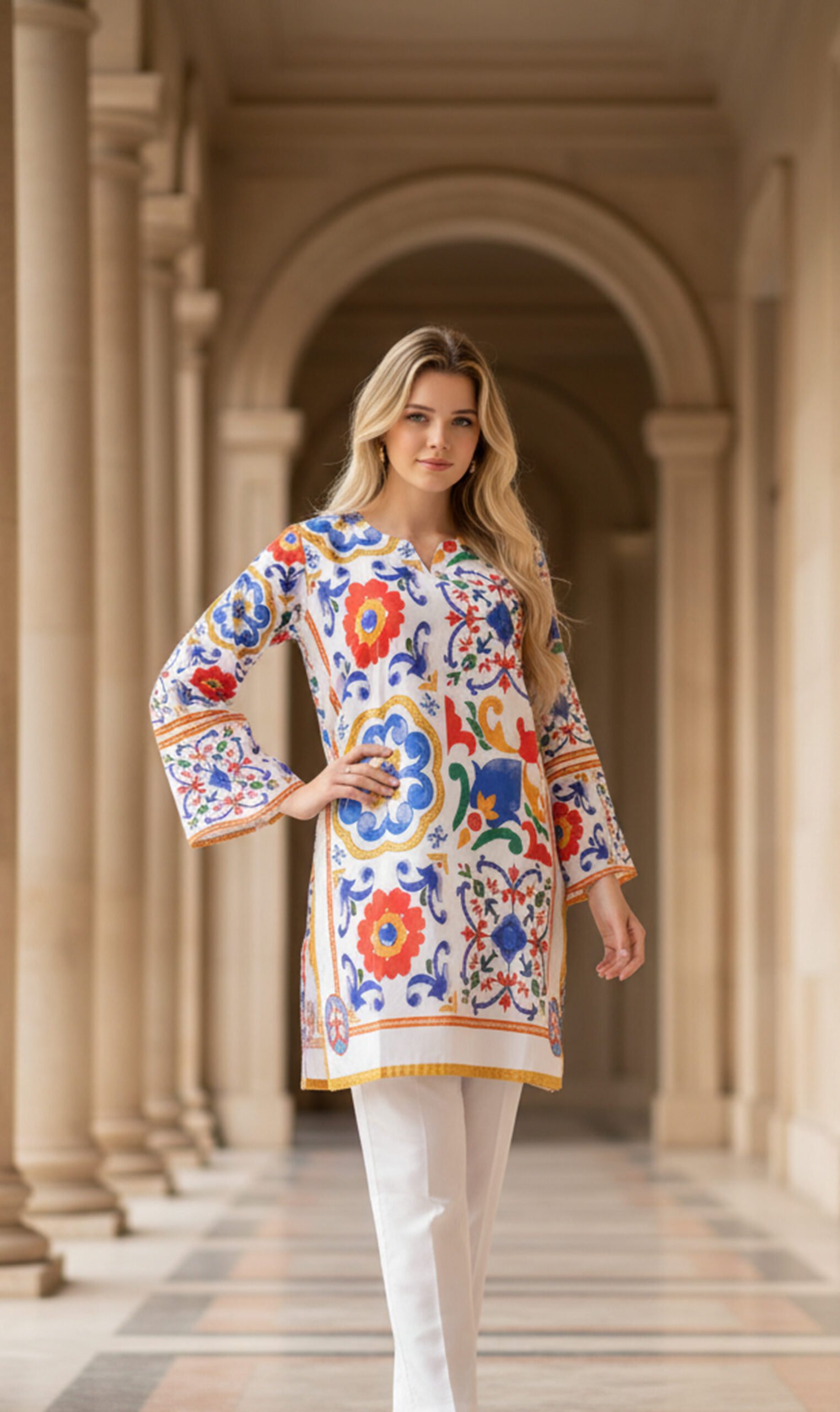 Mediterranean Muse by Dua Fashion Corner brings a burst of color and charm to your wardrobe. Crafted from fine silk fabric, this outfit features an exquisite blend of red, blue, orange, and yellow floral motifs on a crisp white base, giving it a timeless Mediterranean vibe.