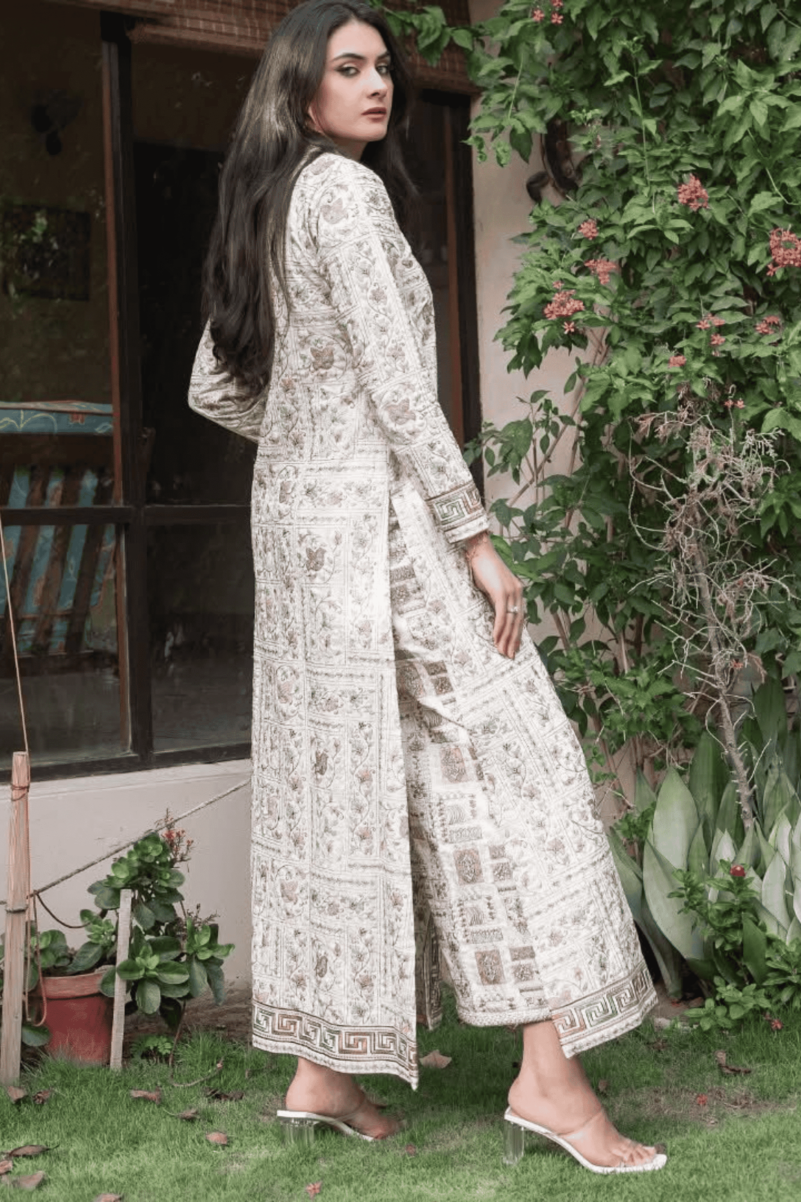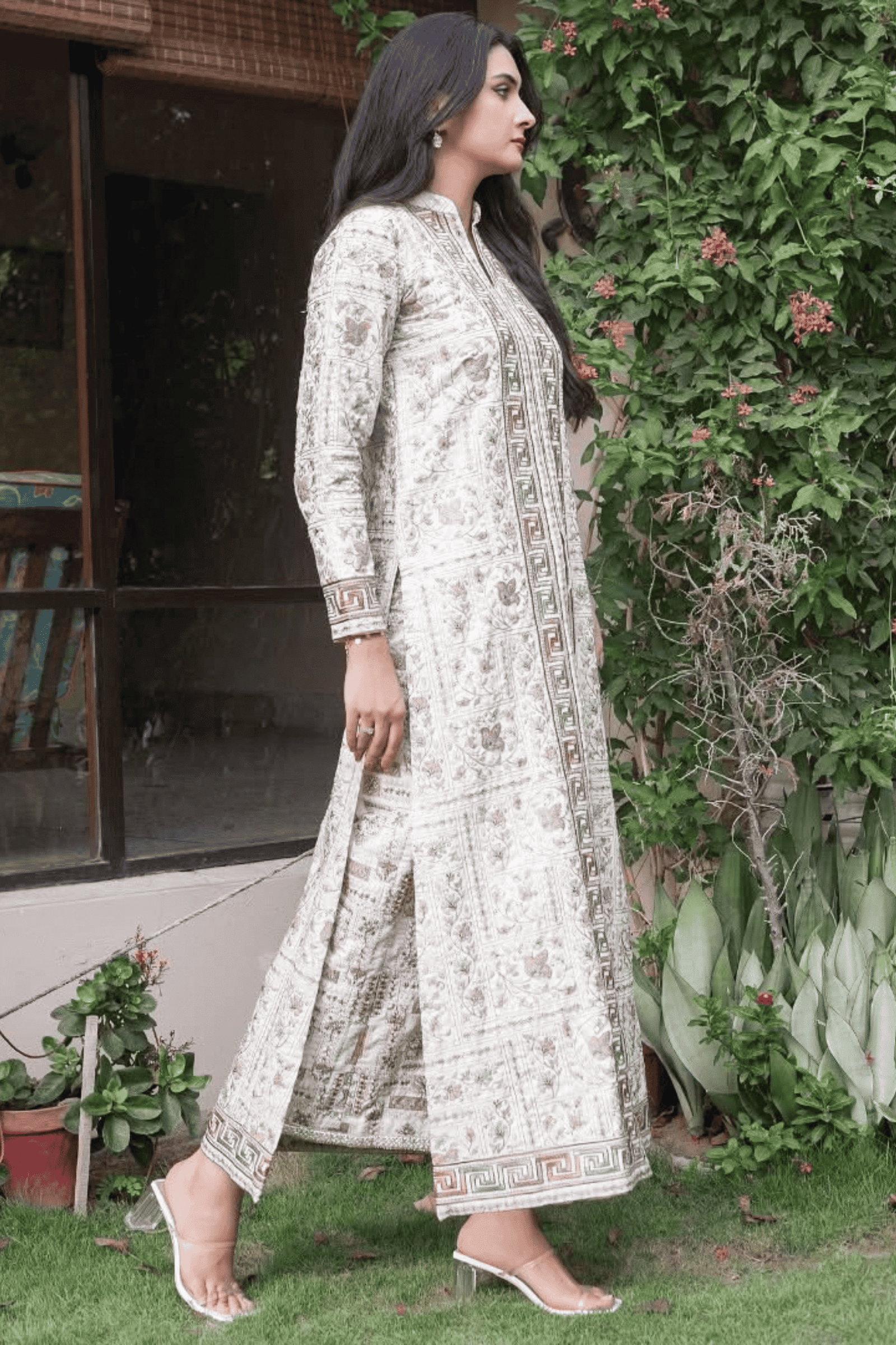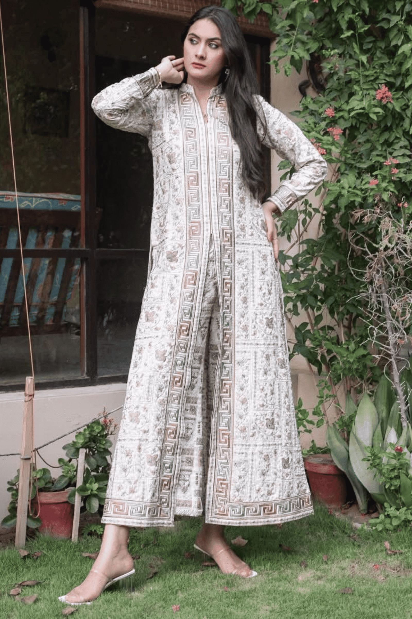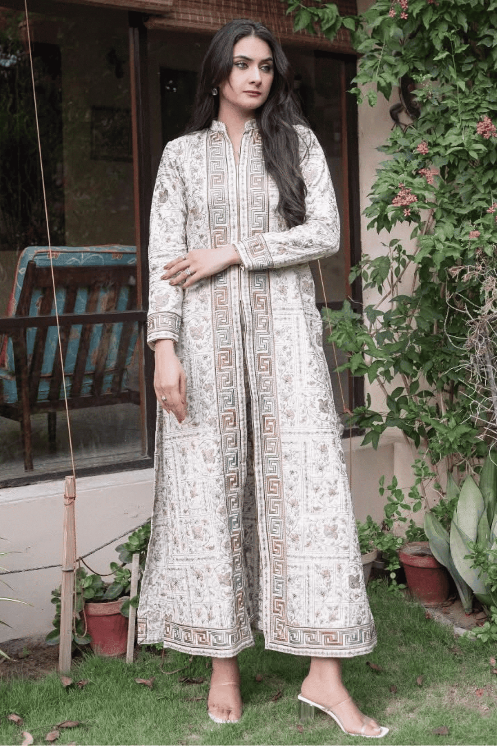 Radiate bold femininity with Dua Fashion Corner “Meher” coat. This full-length garment features a half-slit in the middle and includes matching trousers. Adorned with vibrant boxy embroidery on a cool white-toned fabric, it exudes celebratory elegance and is tailored for any special occasion with a flawless fit.