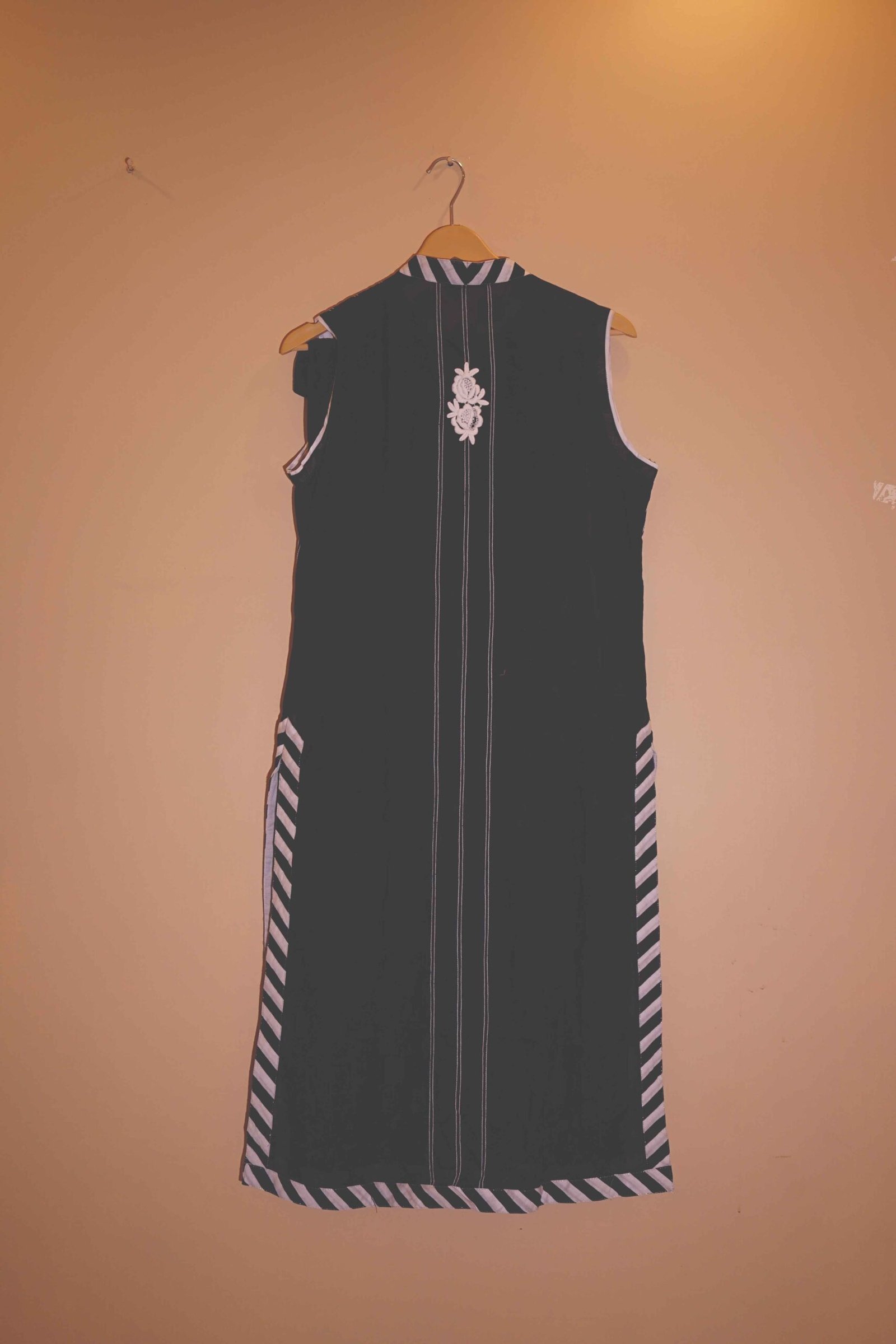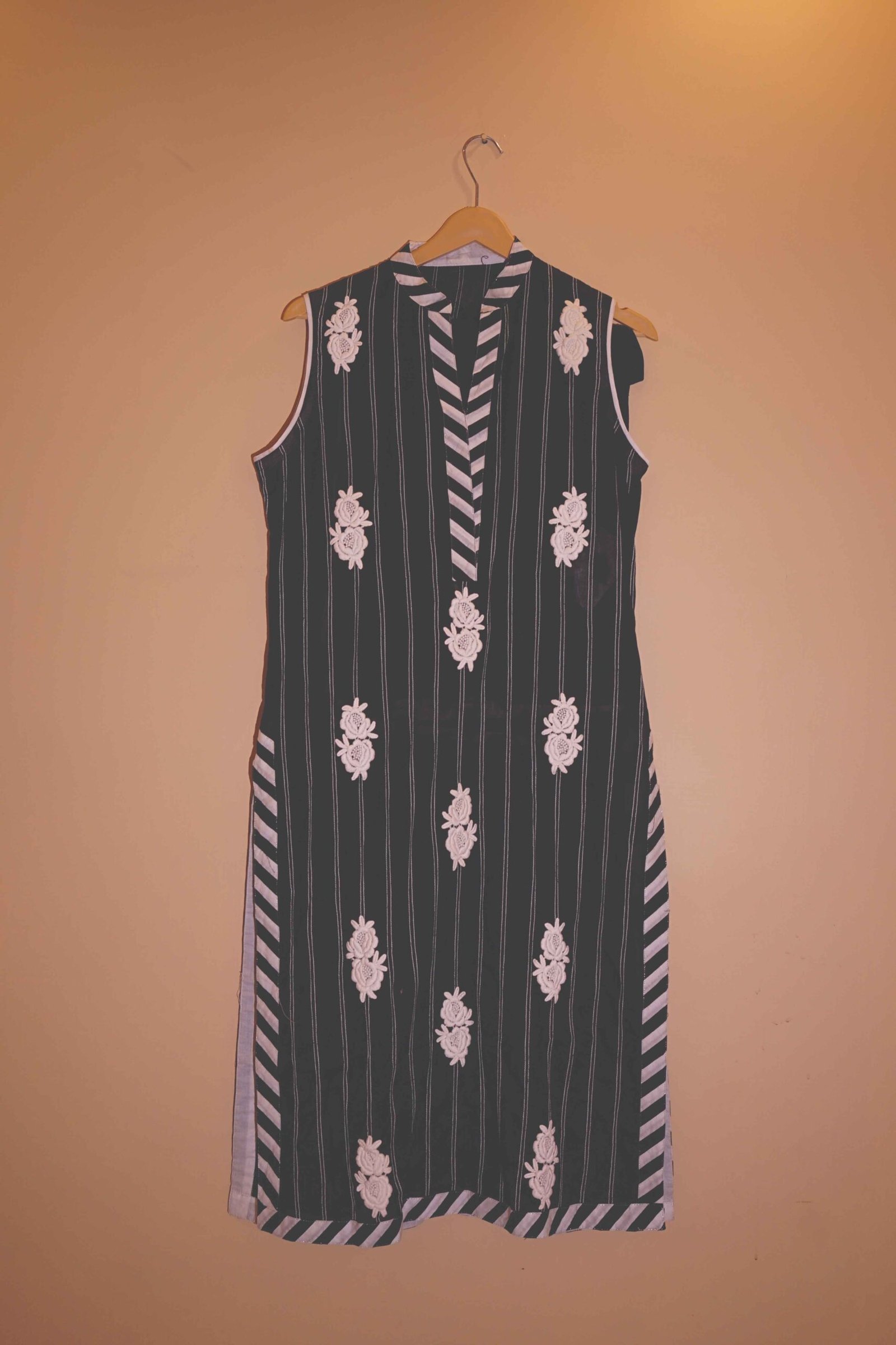 Step into elegance with our Midnight Blossom ensemble — a striking black base adorned with vertical stripes and soft white floral embellishments. This sleeveless kurti features a flattering high neckline with chevron detail at the front, adding modern structure to a timeless silhouette.