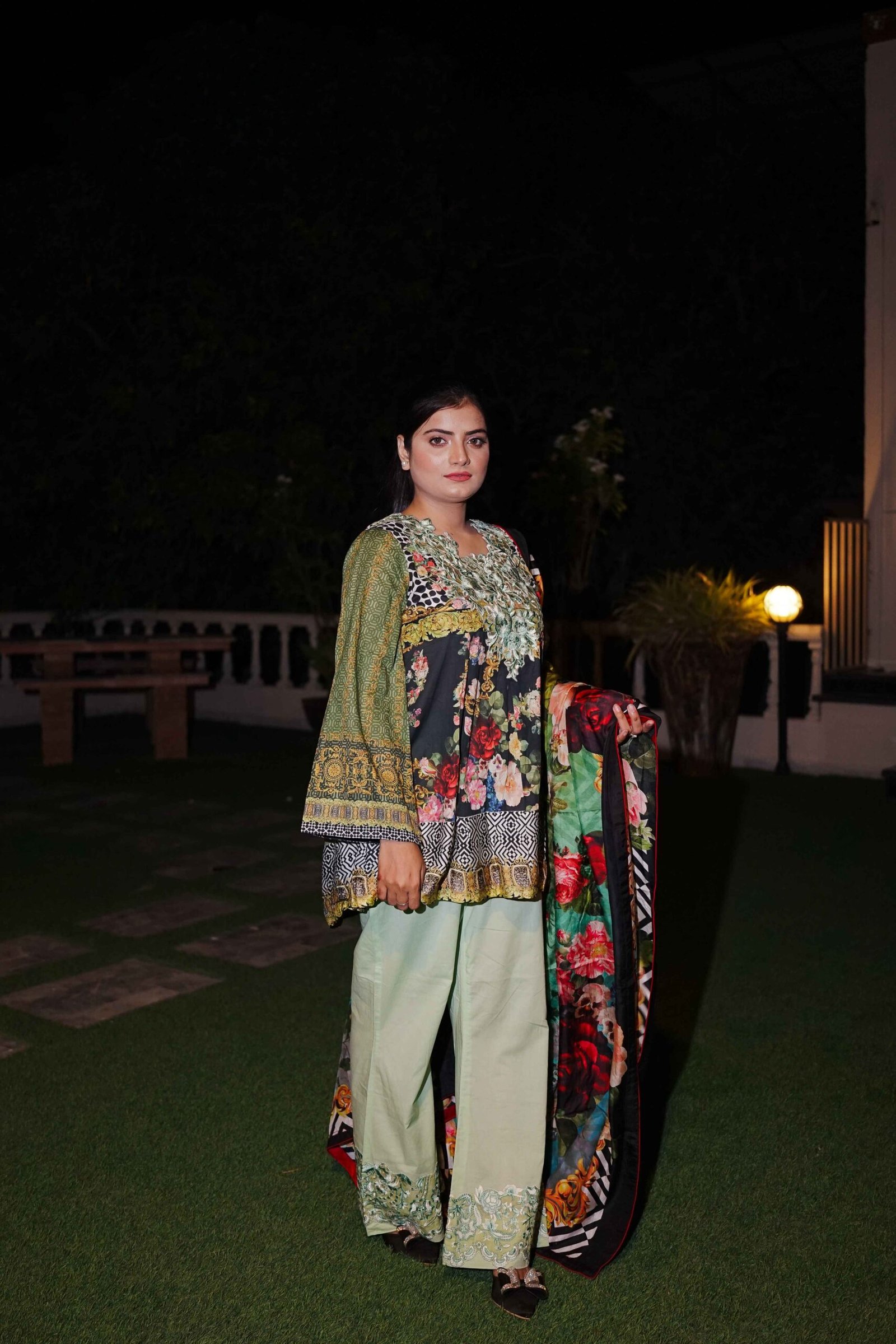 Turn heads with Midnight Garden, a rich and enchanting three-piece suit by Dua Fashion Corner. This outfit features a deep black base shirt bursting with colorful floral motifs, complemented by detailed ethnic-inspired prints on the sleeves and daman.