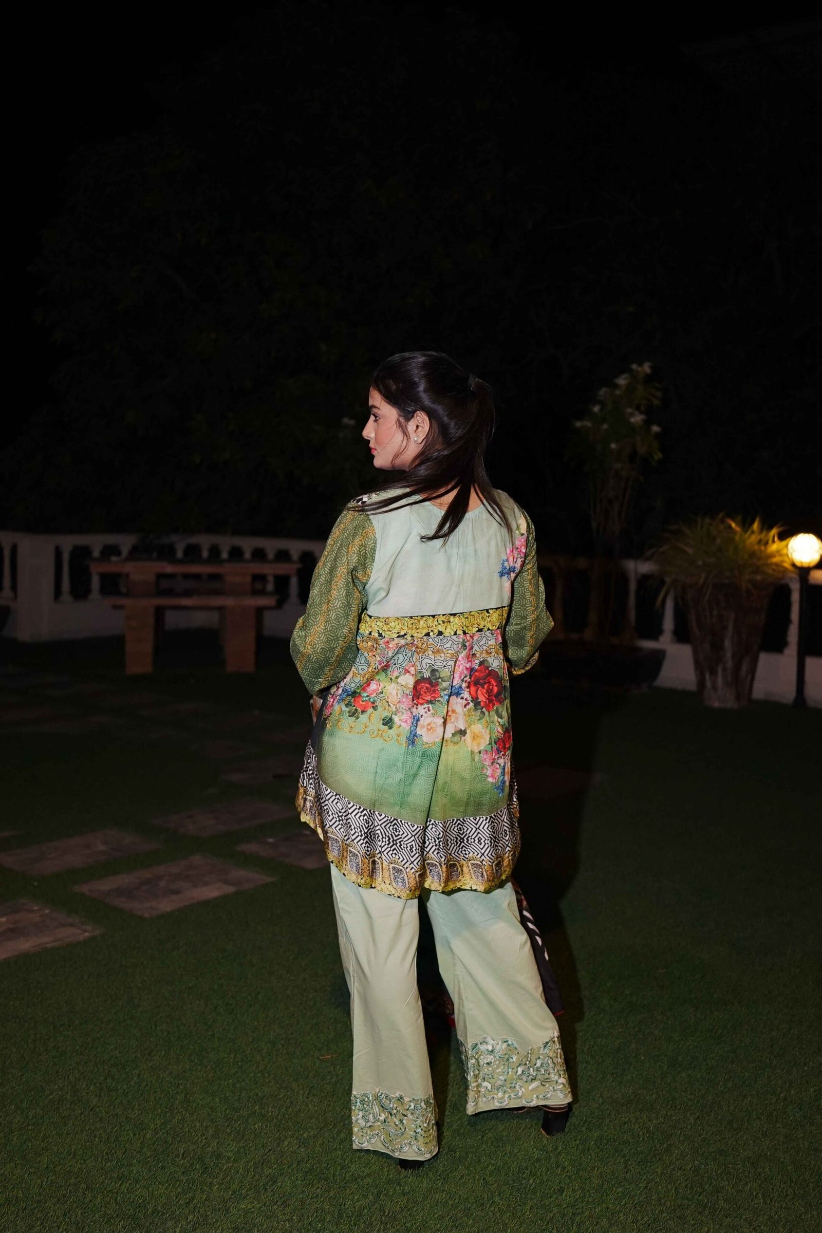 The mint green trousers add a soft contrast and are elegantly embroidered at the hem, offering a balanced and refined look. The matching printed dupatta showcases an artistic blend of roses, patterns, and deep shades — making this ensemble truly festive and dramatic.