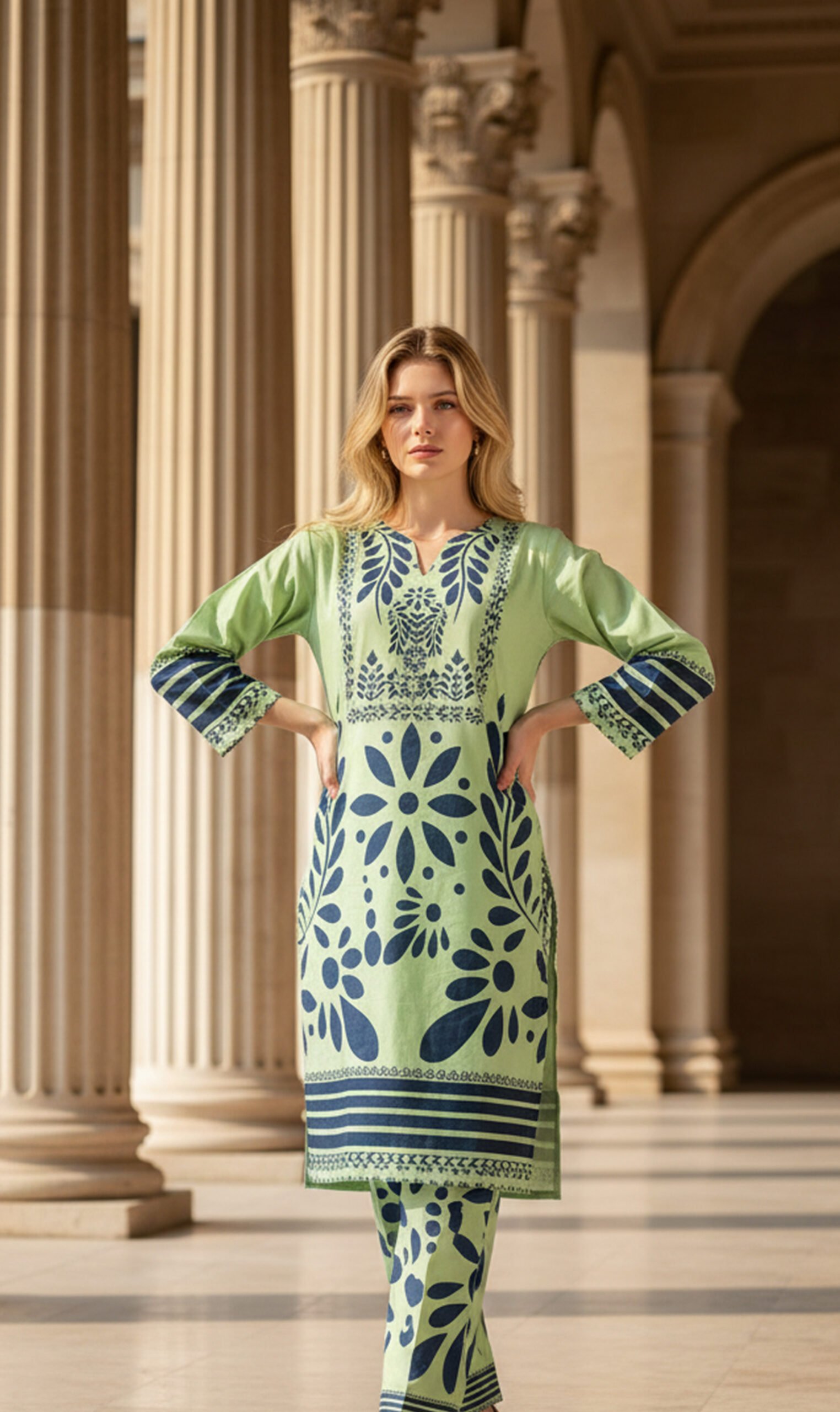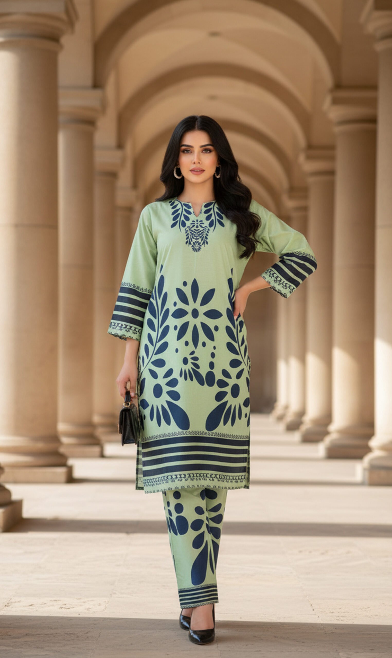 Step into refined luxury with this stunning ensemble from Dua Fashion Corner. Crafted from premium silk fabric, this outfit features a refreshing mint-green base enhanced with bold navy botanical designs, creating a perfect fusion of elegance and contemporary style. The silky smooth texture offers effortless comfort while maintaining a graceful flow — ideal for both casual and semi-formal occasions.