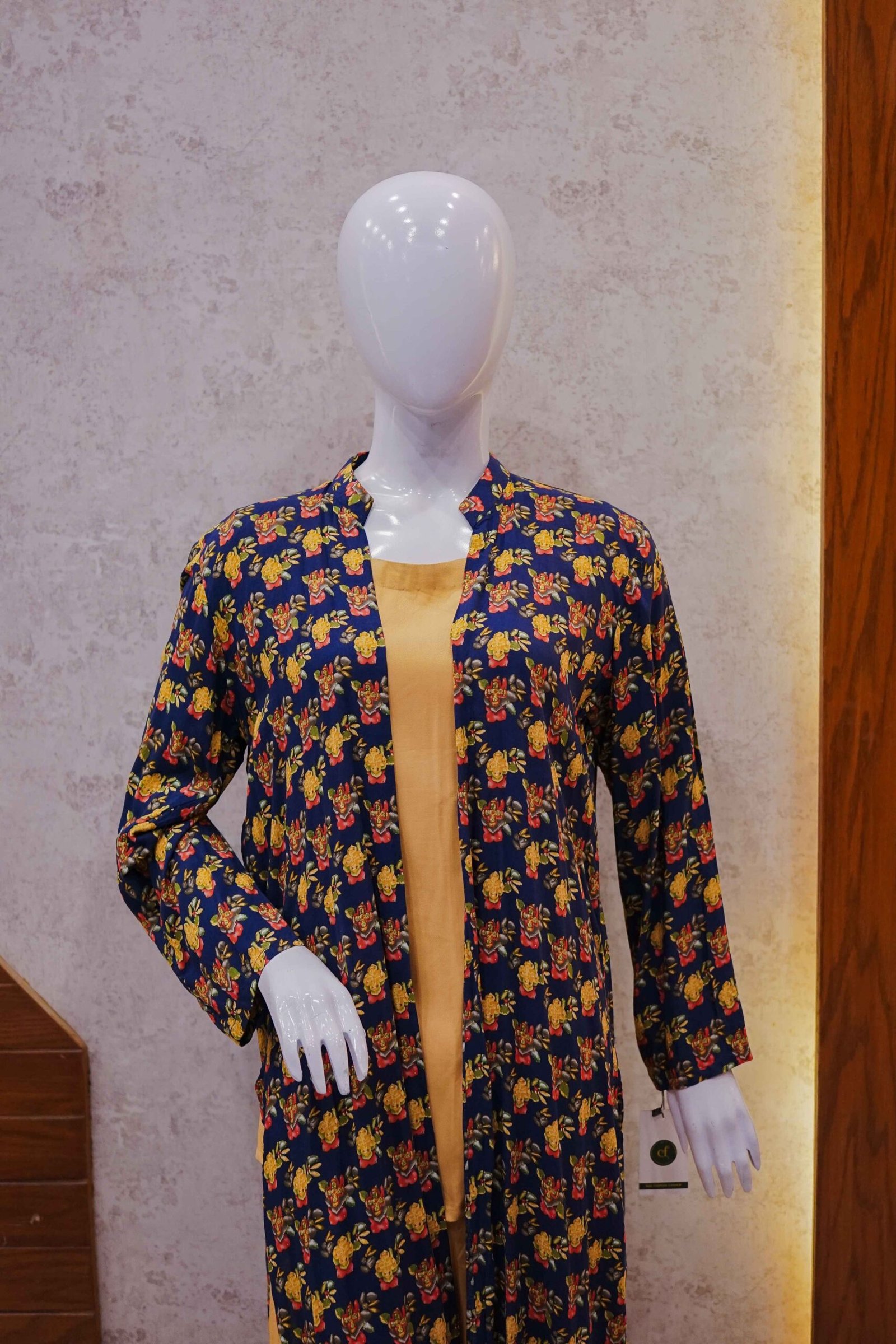 Bring a bold yet elegant touch to your wardrobe with this vibrant 2-piece outfit with printed coat from Dua Fashion Corner. The inner mustard yellow shirt and trouser offer a rich, warm base that perfectly complements the striking navy blue long coat.