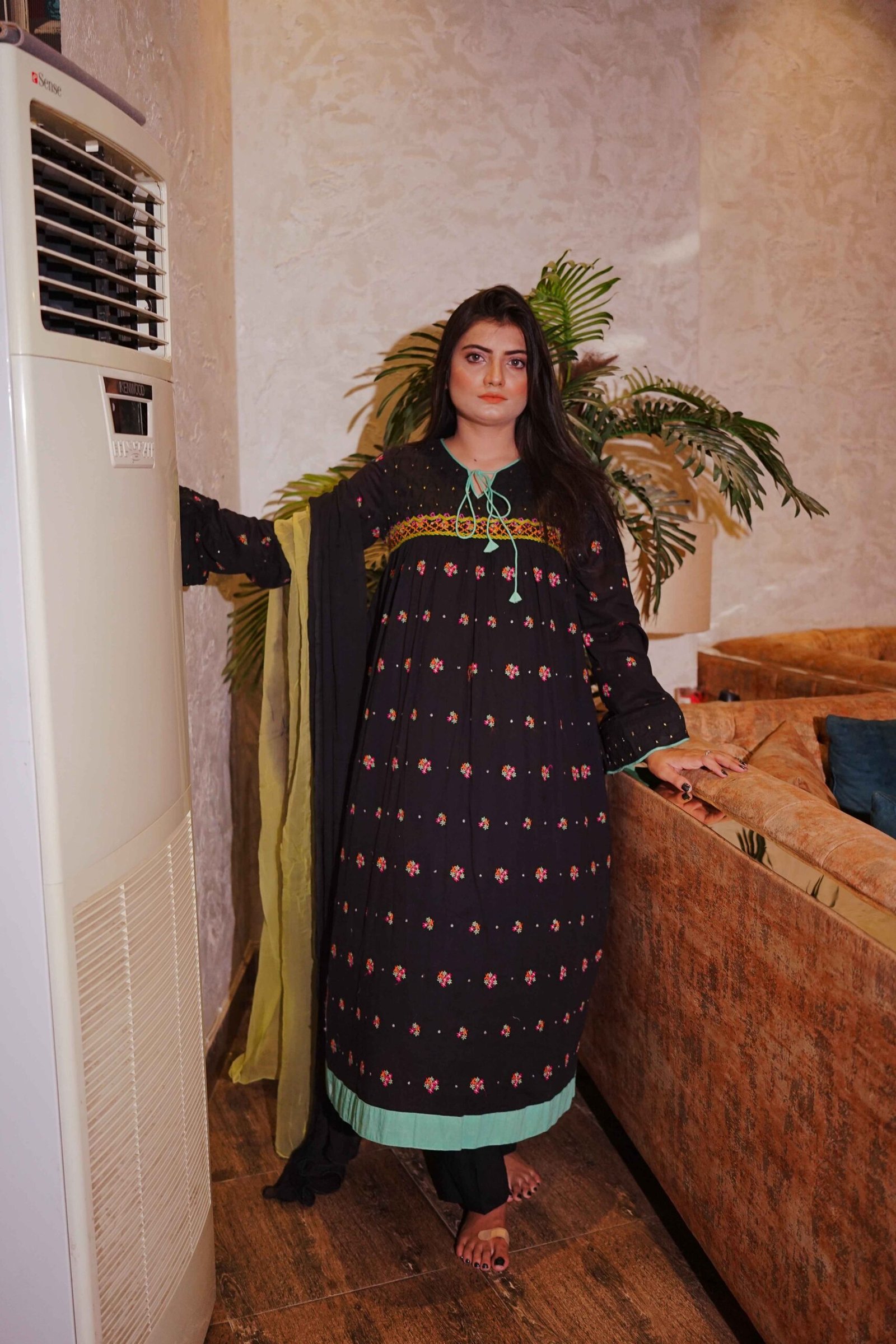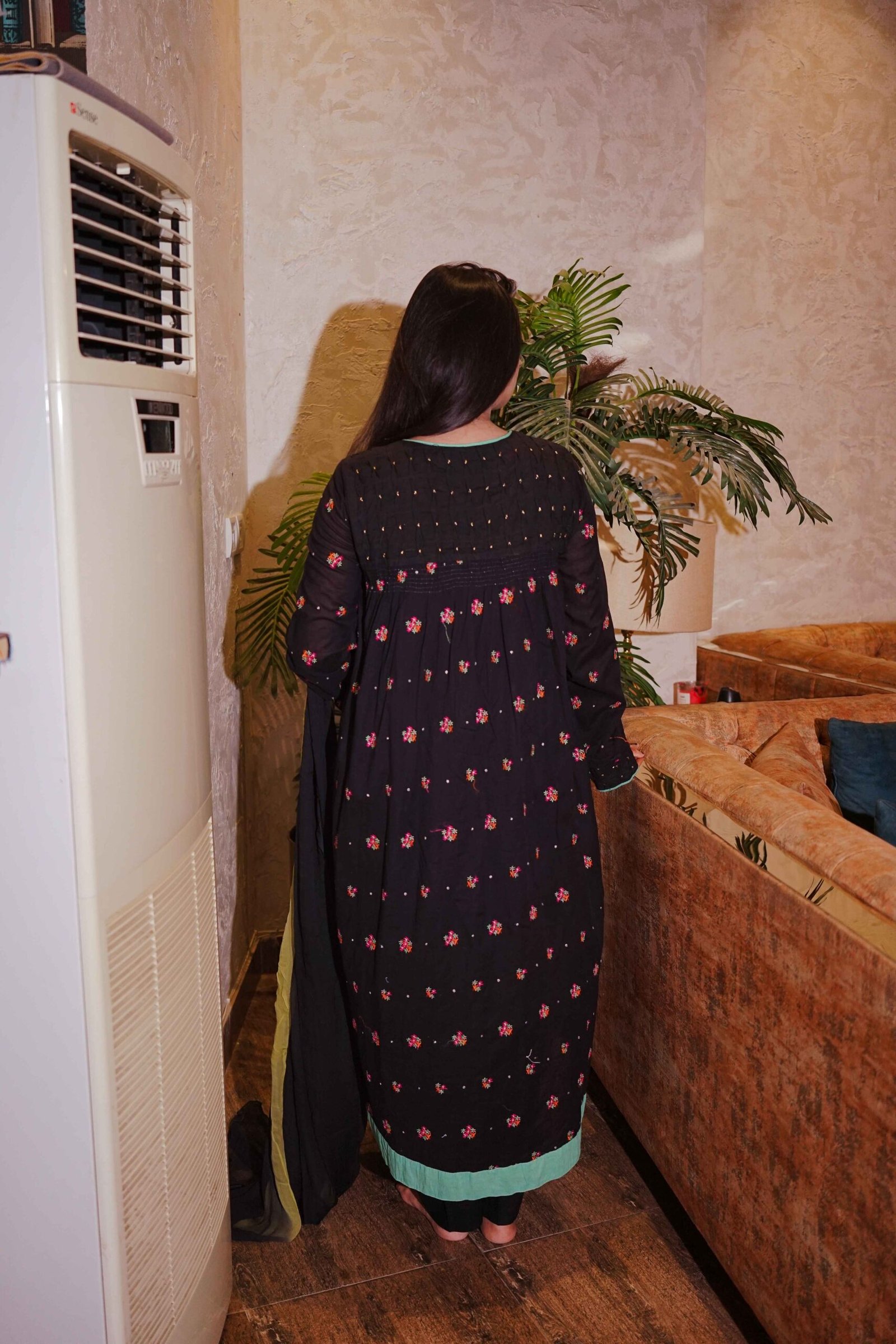 The dress is paired with black trousers and a dual-tone chiffon dupatta in black and light green, completing the look with elegance and balance.
