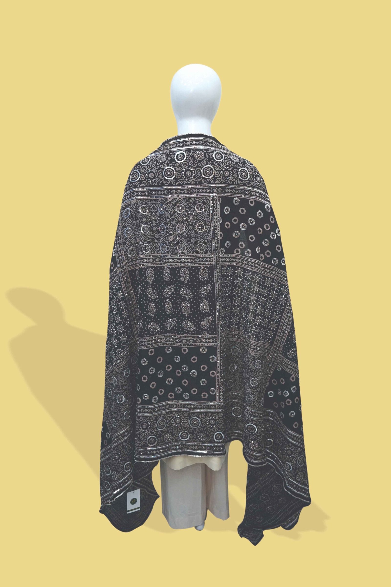 Color: Deep black with white patterns and silver-tone mirror work
