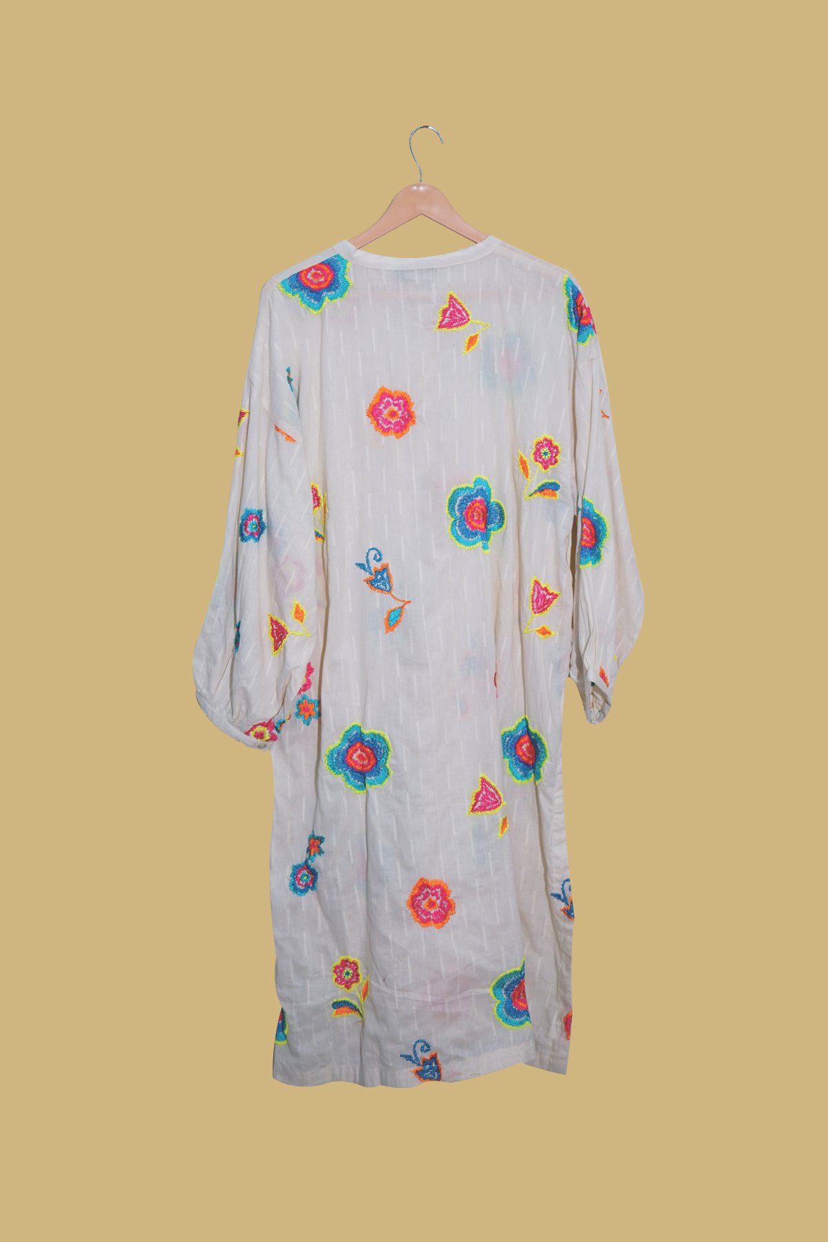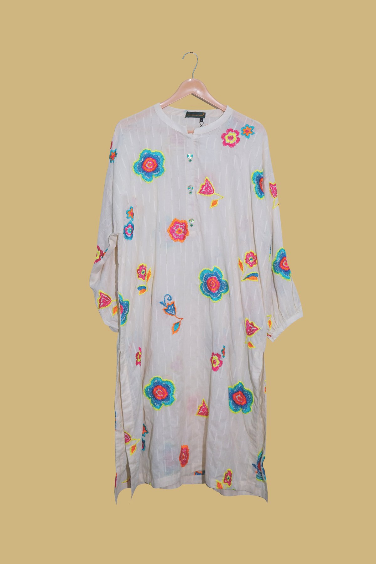 Yeh off-white cotton kurti apni bold aur colorful embroidery ke wajah se bilkul alag aur lively lagti hai. Front aur sleeves pe bright neon pink, green, blue, orange floral motifs isay ek energetic look dete hain. Fabric soft aur lightweight hai — daily casual wear, summer events, ya brunch ke liye best pick!