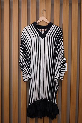 A kaftan dress like this is versatile enough to transition from day to night effortlessly. Whether you’re heading to a casual lunch, attending a formal event, or simply enjoying a stylish outing, this monochrome kaftan blends comfort, sophistication, and ease. The vertical stripes are universally flattering, making it suitable for various body types and personal styles.
