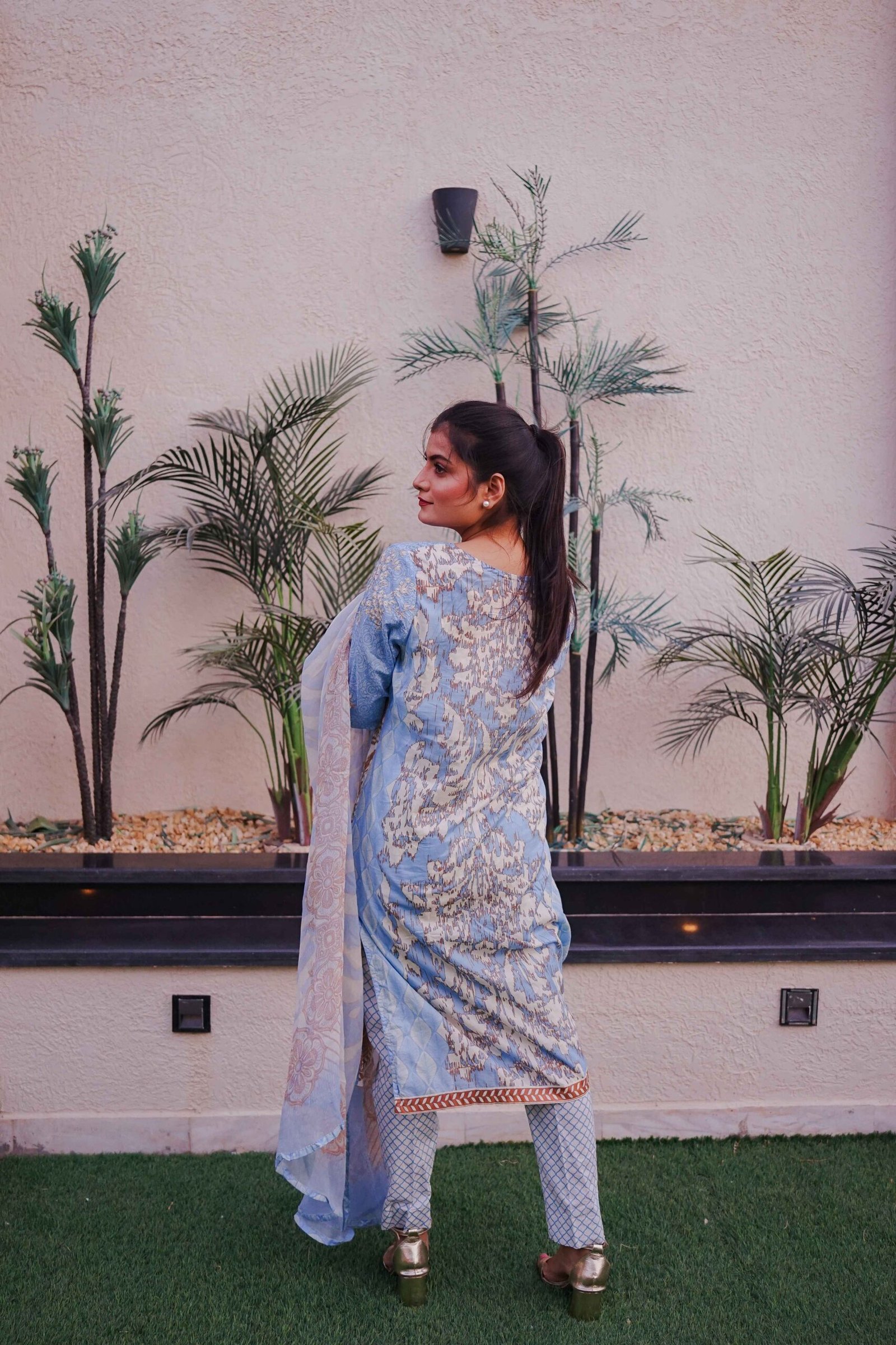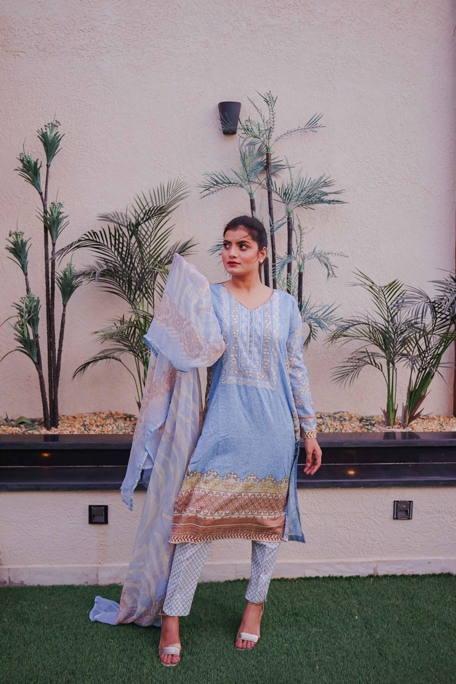 Pastel Serenity by Dua Fashion Corner is a symphony of grace and calm. This refined ensemble showcases a soft pastel blue shirt adorned with delicate ethnic geometric patterns and fine golden accents along the neckline and sleeve cuffs. The hemline is highlighted with intricate borders in warm beige and rust hues, creating a harmonious blend of tones. A feather-light chiffon dupatta with muted stripes and ornamental motifs drapes effortlessly, while the matching printed trousers complete the look with understated elegance.