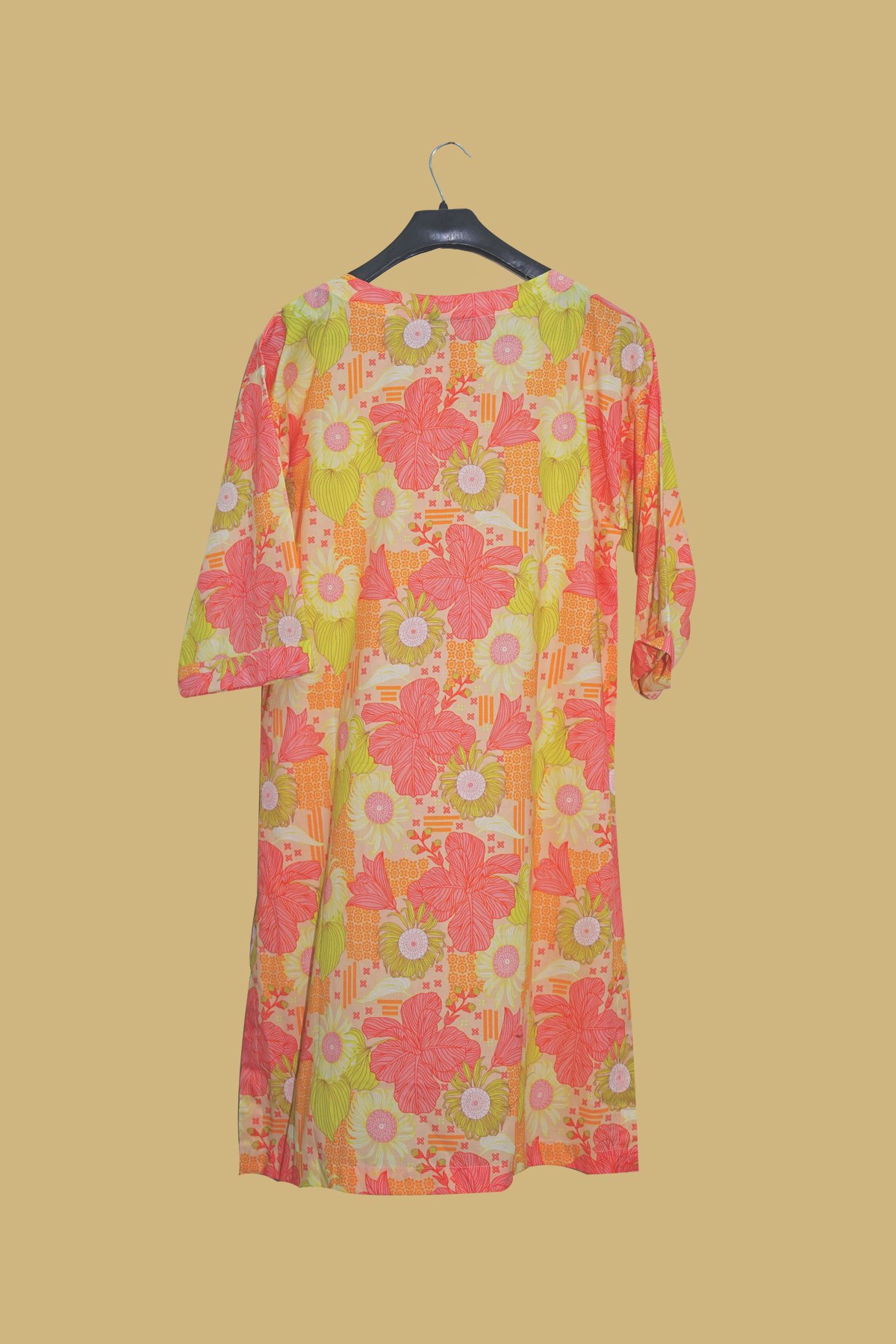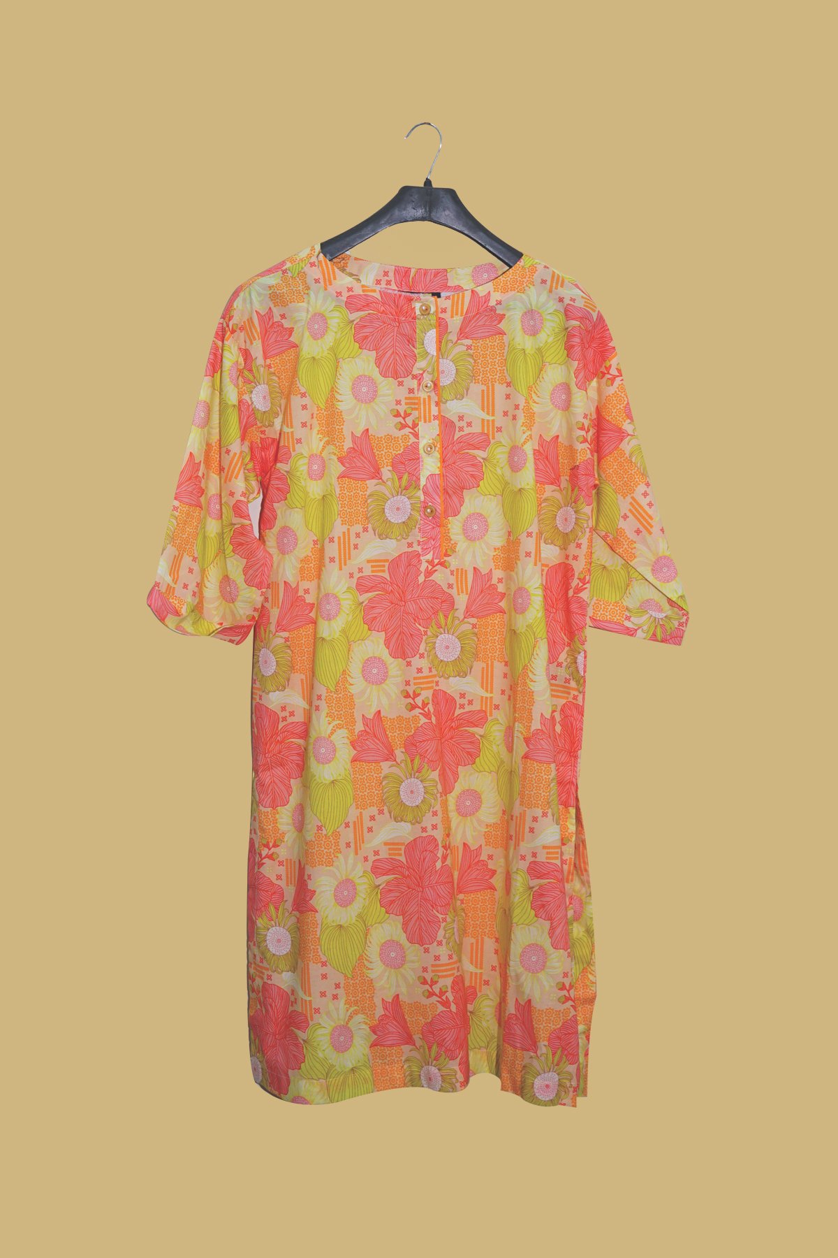 Yeh peach base wali floral kurti har look ko bana degi refreshing aur fun. Iske vibrant pink, green aur orange flowers summer-ready energy lekar aate hain. Soft aur breathable fabric isey banata hai din bhar pehne layak, chahe ghar ho ya outing.