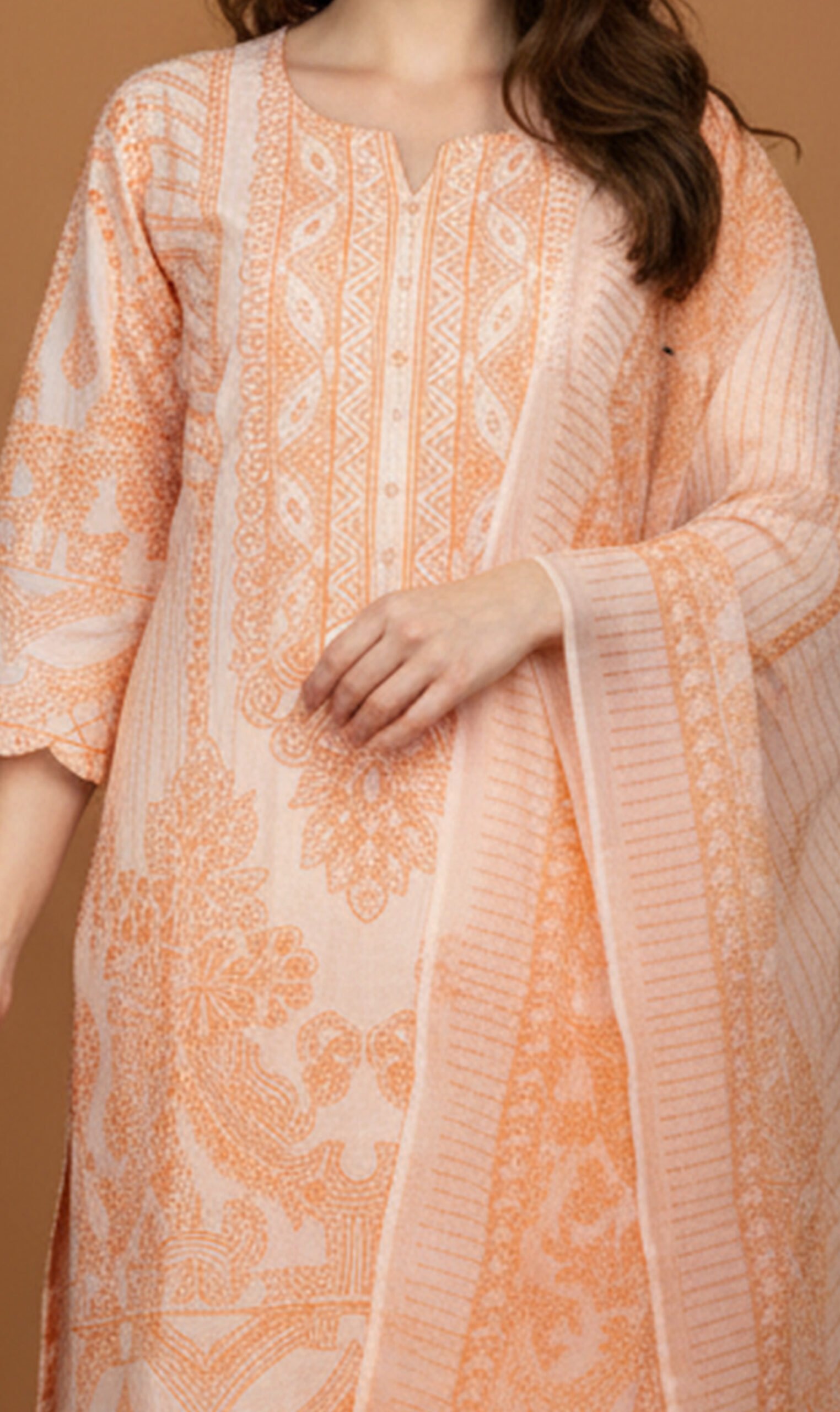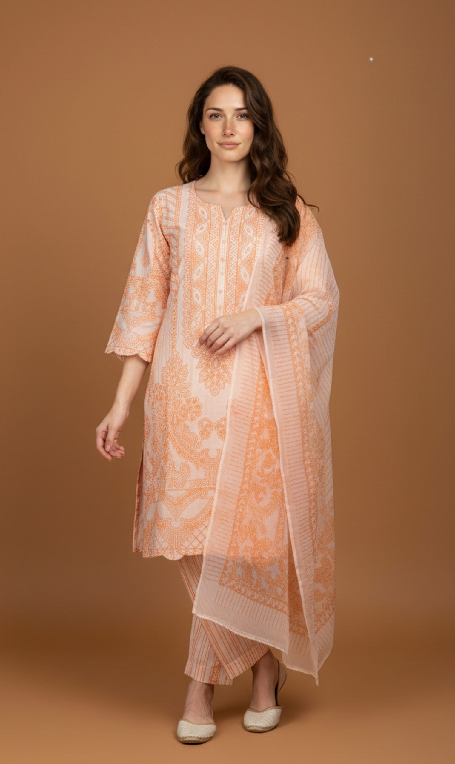 This elegant peach motif cotton ensemble brings together warmth, charm, and detailed craftsmanship — perfect for seasonal events and daytime gatherings. The kurta showcases delicate peach-toned patterns over a soft white base, paired with straight trousers featuring matching embroidered-style motifs and a beautifully printed dupatta that completes the look with effortless grace.